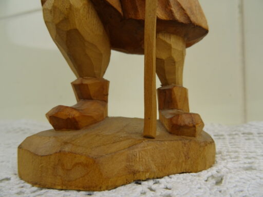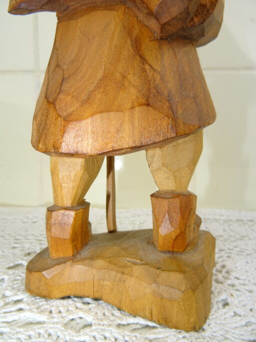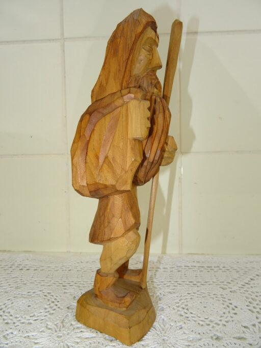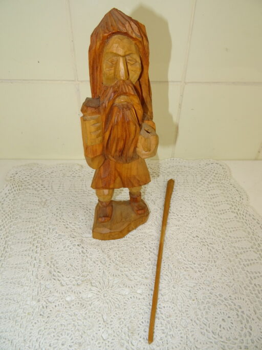 Antiek houten beeld Heilige man vermoedelijk vervaardigd in de eerste helft van de vorige eeuw. Afgebeeld is een man met lang haar en een lange baard en een stok of staf in zijn hand. In de andere hand heeft hij een zak of iets dat daarop lijkt. De zak heeft hij over zijn schouder hangen. De maker en herkomst van dit prachtige primitief gestoken beeld is onbekend. Het is in goede staat. Het zou wellicht ook Jezus kunnen zijn.