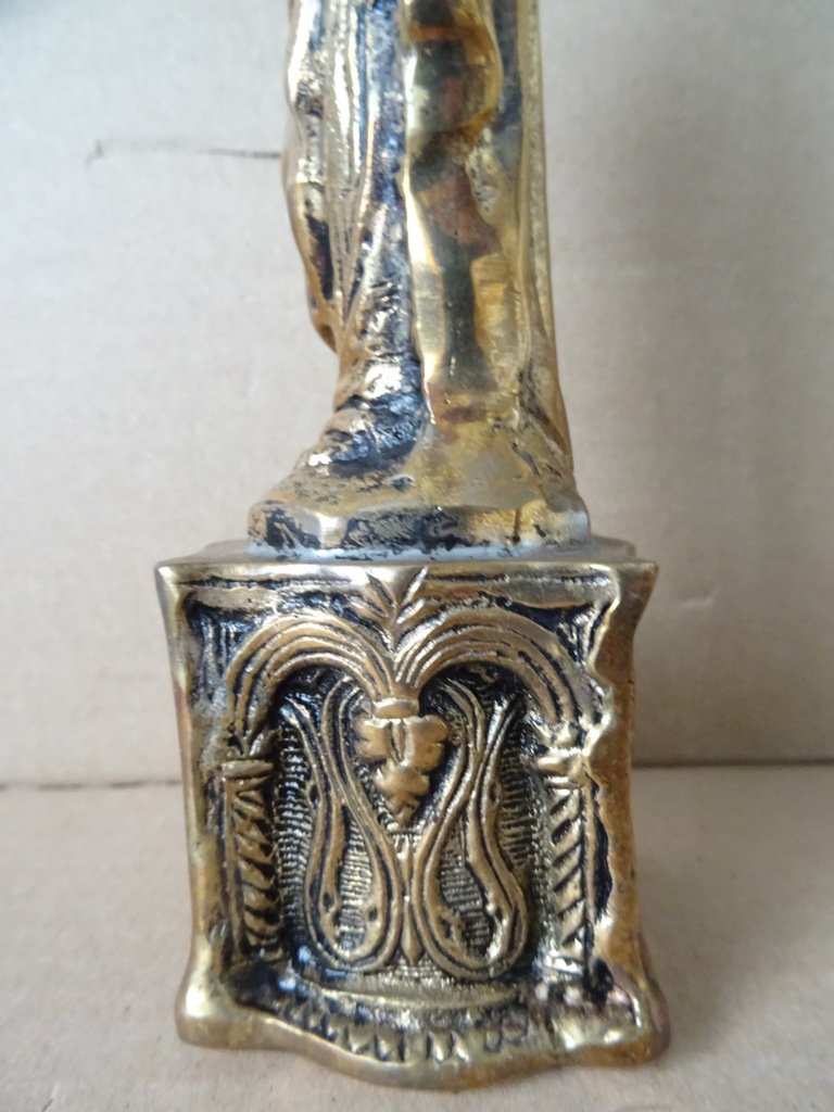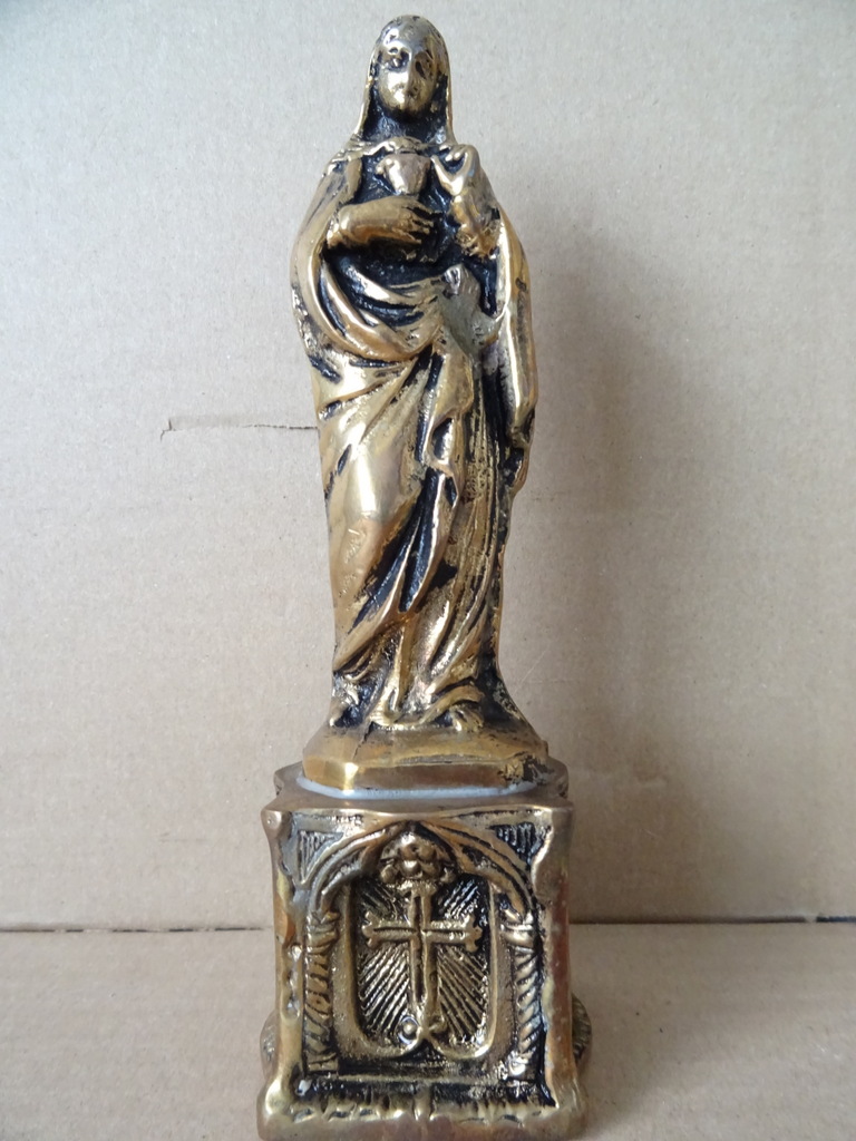 Antiek Mariabeeld uit Turkije 19cm koper of messing vervaardigd rond 1900 of wat later. Het imponerende beeldje is in 1992 aangeschaft in Turkije. Het is in een schitterende gebruikte staat, zie foto’s. Afkomstig uit een collectie religieuze objecten die al die tijd in een vitrinekast was uitgestald.