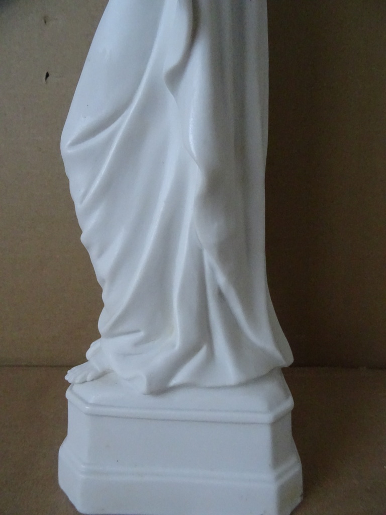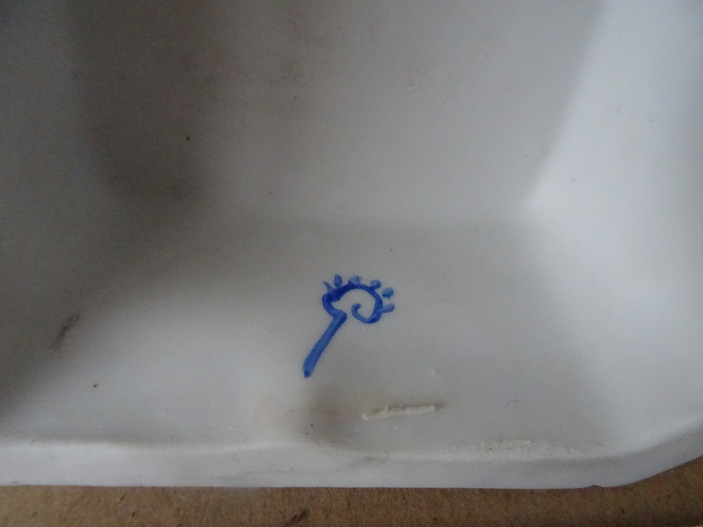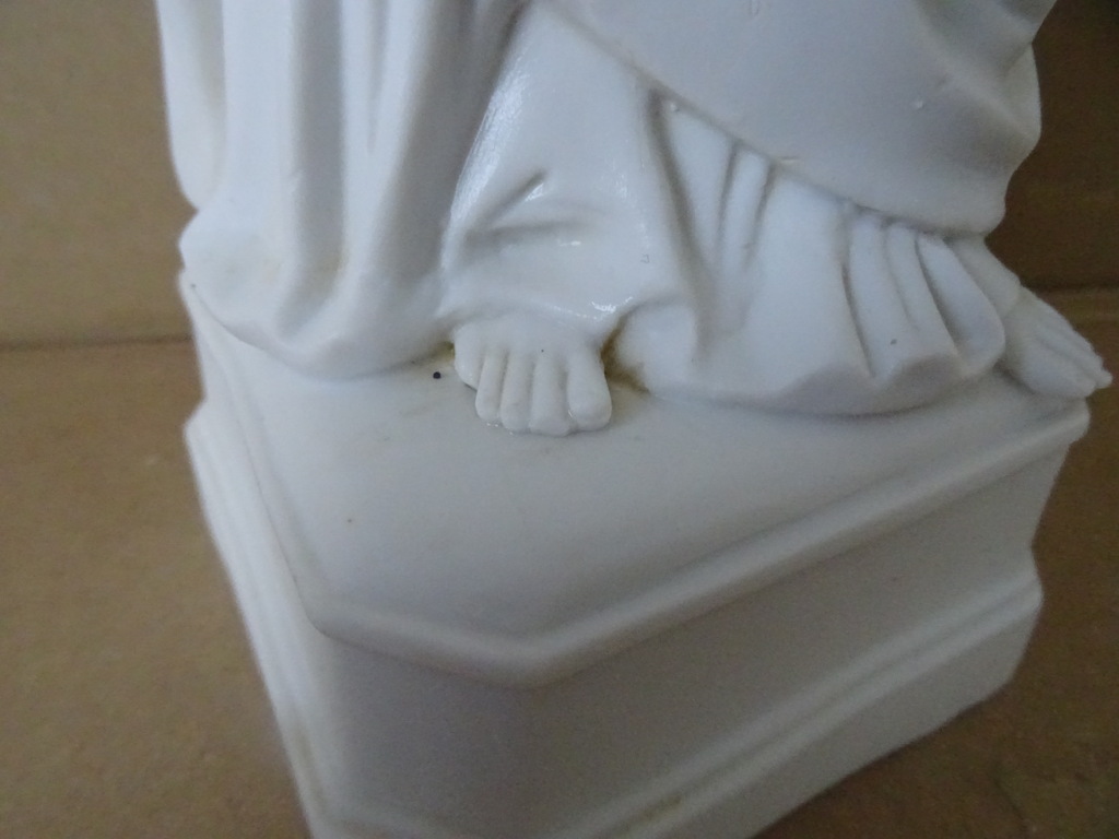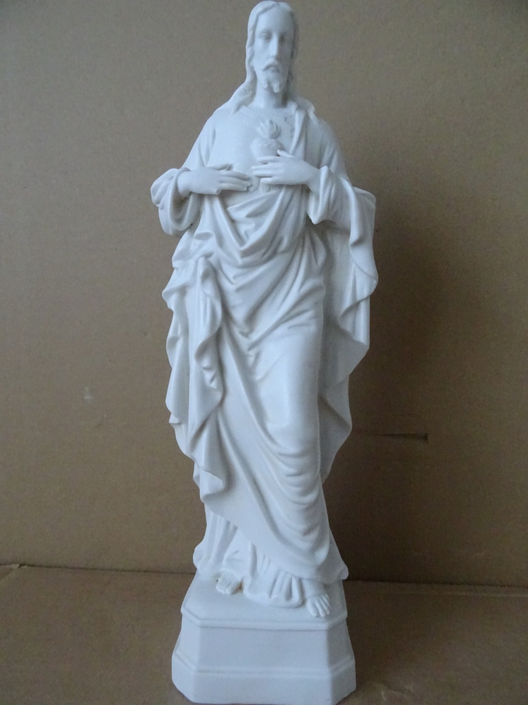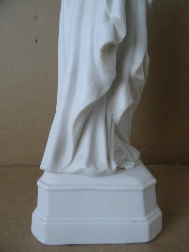 Antiek porseleinen Jezusbeeld Heilig Hart 36cm vervaardigd rond 1850 of later. Het statige beeld van biscuit porselein toont Jezus Christus staand op een verhoging. Het beeld is nog in vrij goede staat, haast puntgaaf. De rechter pink mist, verder hier en daar slechts een vlekje of verkleuring, zie foto’s. Gemerkt met een opvallend merkteken in de vorm van een blauwe staf of mijter.