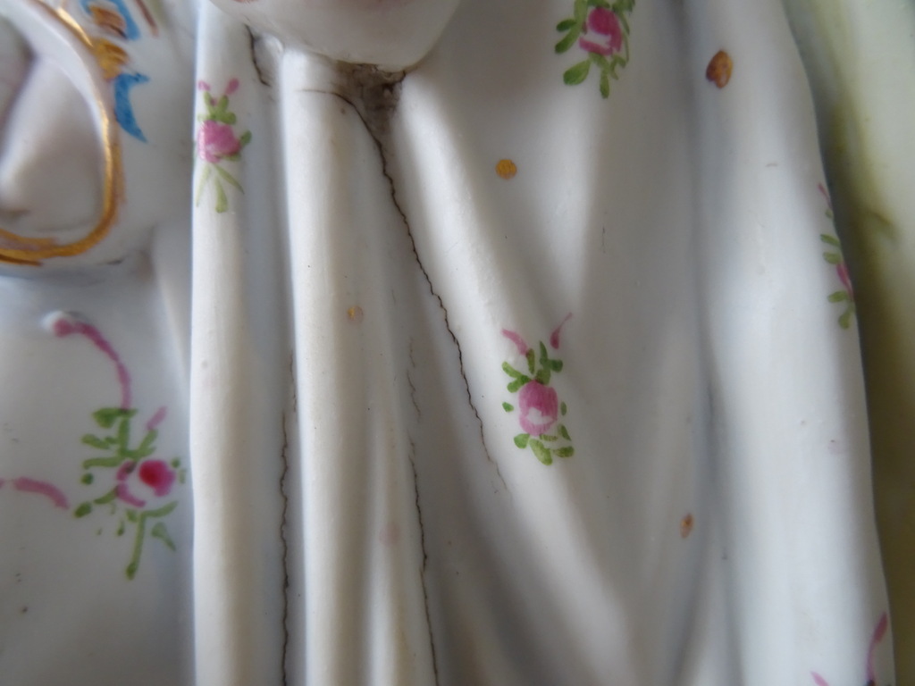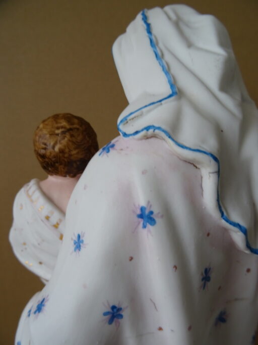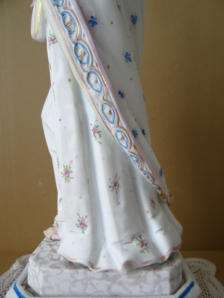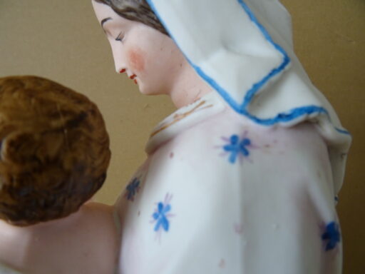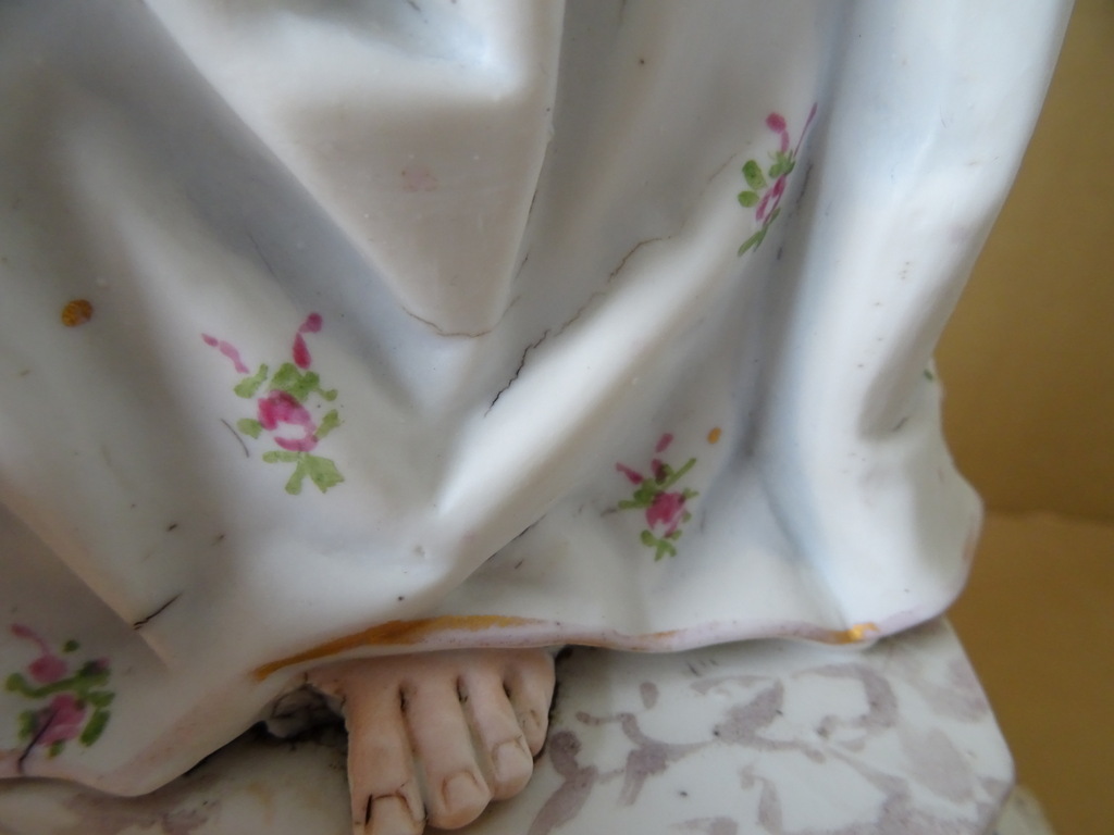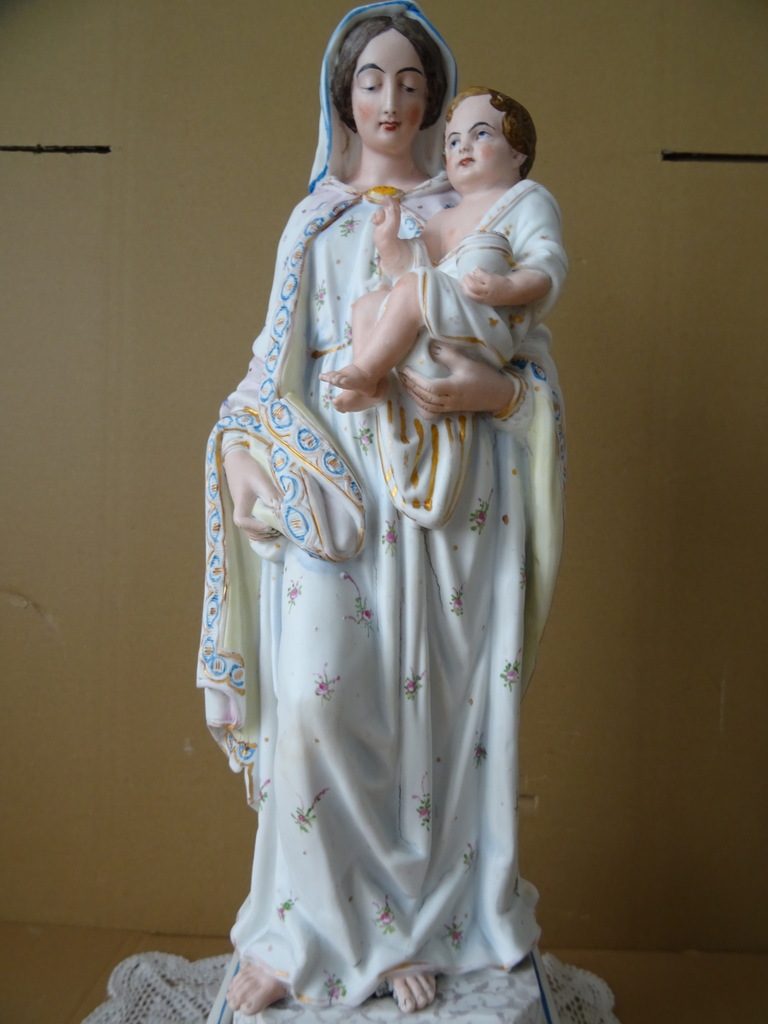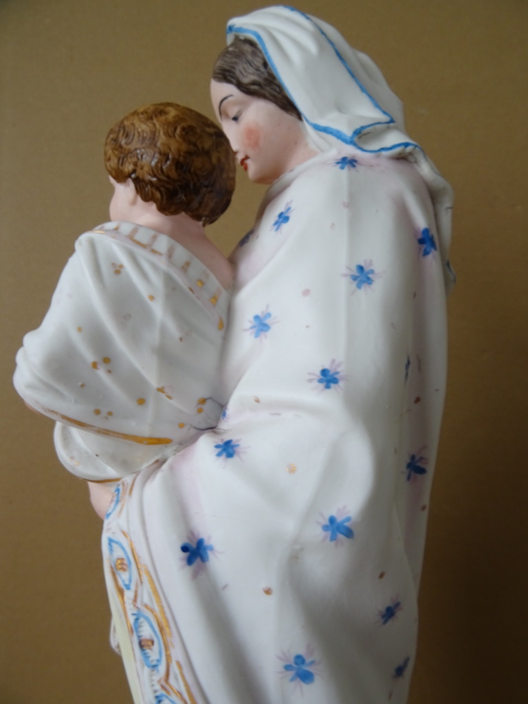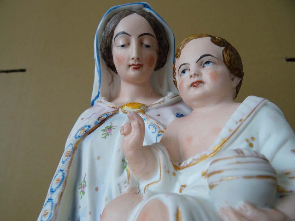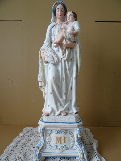 Antiek porseleinen Mariabeeld de Moeder Gods 53cm vervaardigd rond 1880. Een imponerend Mariabeeld in een schitterende gebruikte staat, haast puntgaaf. Een teen van Maria ontbreekt (de grote teen aan haar linkervoet) en er mist een minuscuul chipje aan de mantel aan haar rechterkant. Verder slechts wat sporen van ouderdom, de vervulde decoratie is wat weggesleten en het kruisje dat op de bal stond ontbreekt, zie foto’s. Een nieuw kruisje is er vrij eenvoudig op te zetten. Hoogte Mariabeeld circa 41,5 cm, hoogte inclusief voet 53 cm. Om het beeld schoon te maken heb ik de voet losgedraaid. Deze was bevestigd met gips dat meteen losliet, zie foto’s. Het beeld kan echter prima op de console staan zonder schroef, het staat zeer solide.