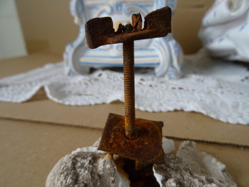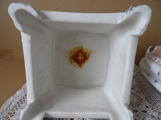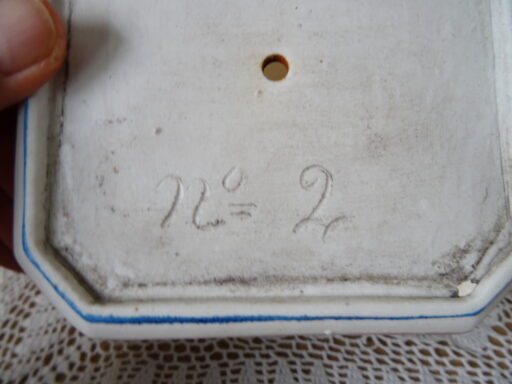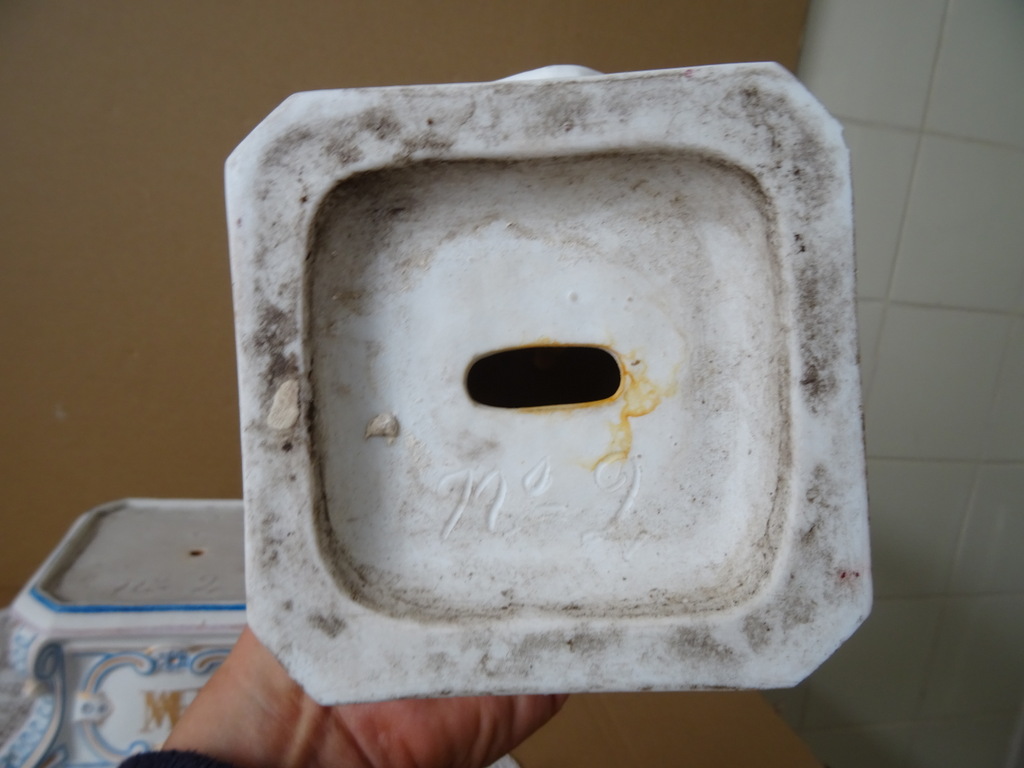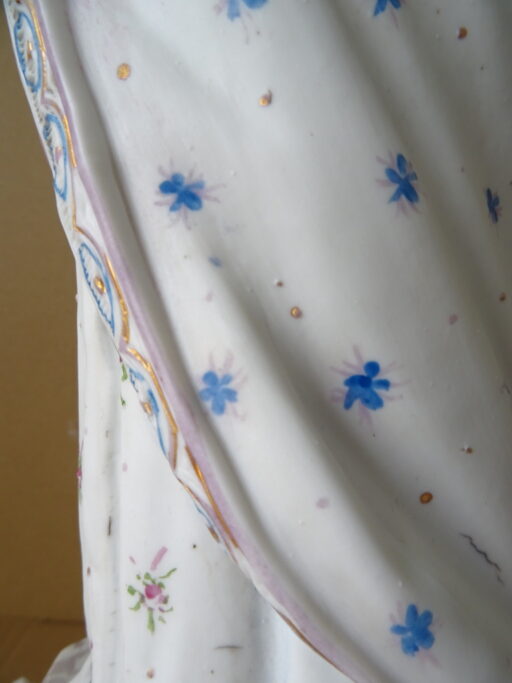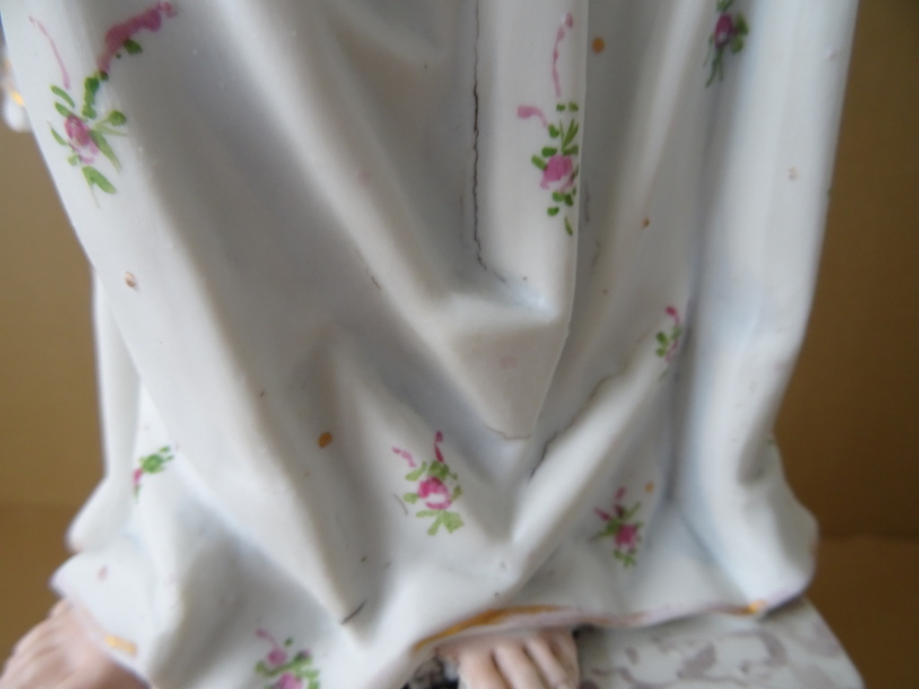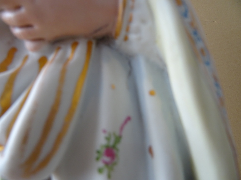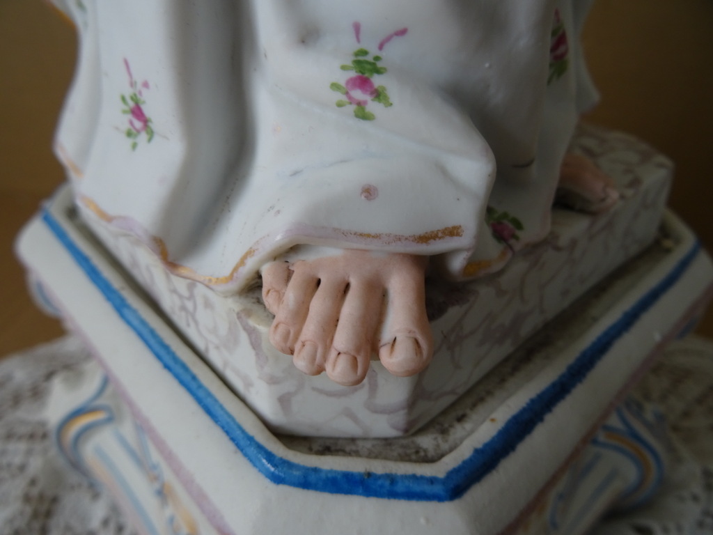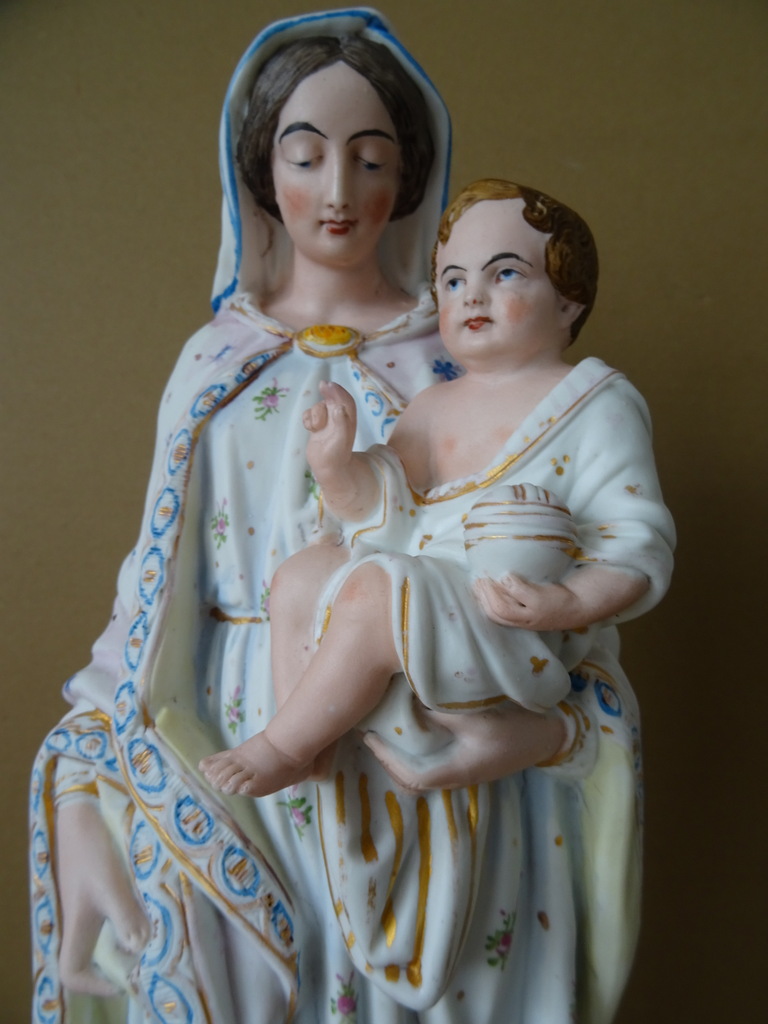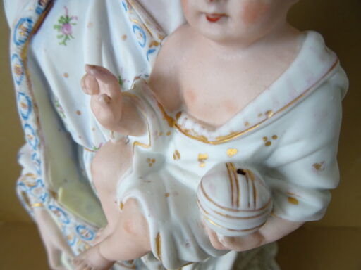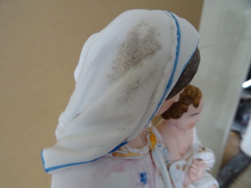 Antiek porseleinen Mariabeeld de Moeder Gods 53cm vervaardigd rond 1880. Een imponerend Mariabeeld in een schitterende gebruikte staat, haast puntgaaf. Een teen van Maria ontbreekt (de grote teen aan haar linkervoet) en er mist een minuscuul chipje aan de mantel aan haar rechterkant. Verder slechts wat sporen van ouderdom, de vervulde decoratie is wat weggesleten en het kruisje dat op de bal stond ontbreekt, zie foto’s. Een nieuw kruisje is er vrij eenvoudig op te zetten. Hoogte Mariabeeld circa 41,5 cm, hoogte inclusief voet 53 cm. Om het beeld schoon te maken heb ik de voet losgedraaid. Deze was bevestigd met gips dat meteen losliet, zie foto’s. Het beeld kan echter prima op de console staan zonder schroef, het staat zeer solide.