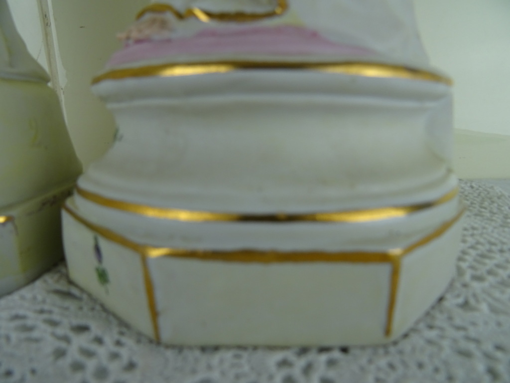 Fraaie Jugendstil beelden Jozef en Maria vervaardigd rond 1890. De beelden zijn gemaakt van biscuit porselein en hebben een hoogte van 39.5 cm. Afgebeeld zijn de Heilige Jozef en Maria, staand op verhogingen. Deze verhogingen (consoles) vallen meteen op dankzij de typische Jugendstil vormgeving. Wat verder opvalt is het handgebaar dat Jozef maakt en de wondermooie gelaatsuitdrukkingen. Zowel Jozef en Maria zijn afgebeeld met het hart aan de buitenkant (Heilig hart). (De Heilig Hart-devotie begon door de berichten over de visioenen van Margaretha Maria Alacoque (1646-1690). Aan haar zou Jezus zijn bloedend hart hebben getoond. Volgens deze kloosterzuster uit het Franse Paray-le-Monial was zij door Jezus deelgenoot gemaakt van zijn verdriet vanwege het groot aantal mensen die zijn liefde afwezen.) De beelden zijn in goede staat (puntgaaf) afgezien van wat vlekjes / verkleuringen die in de loop der jaren zijn ontstaan. De maker en herkomst zijn onbekend.