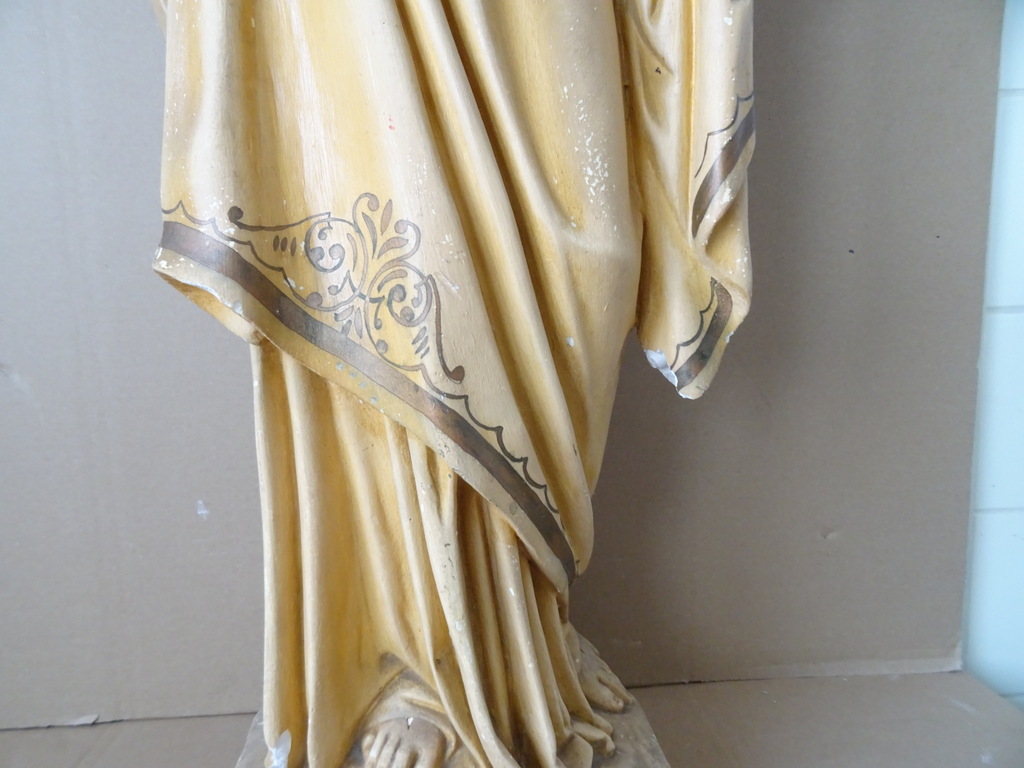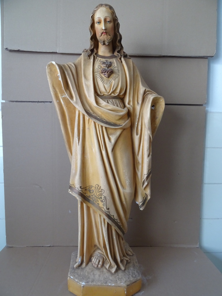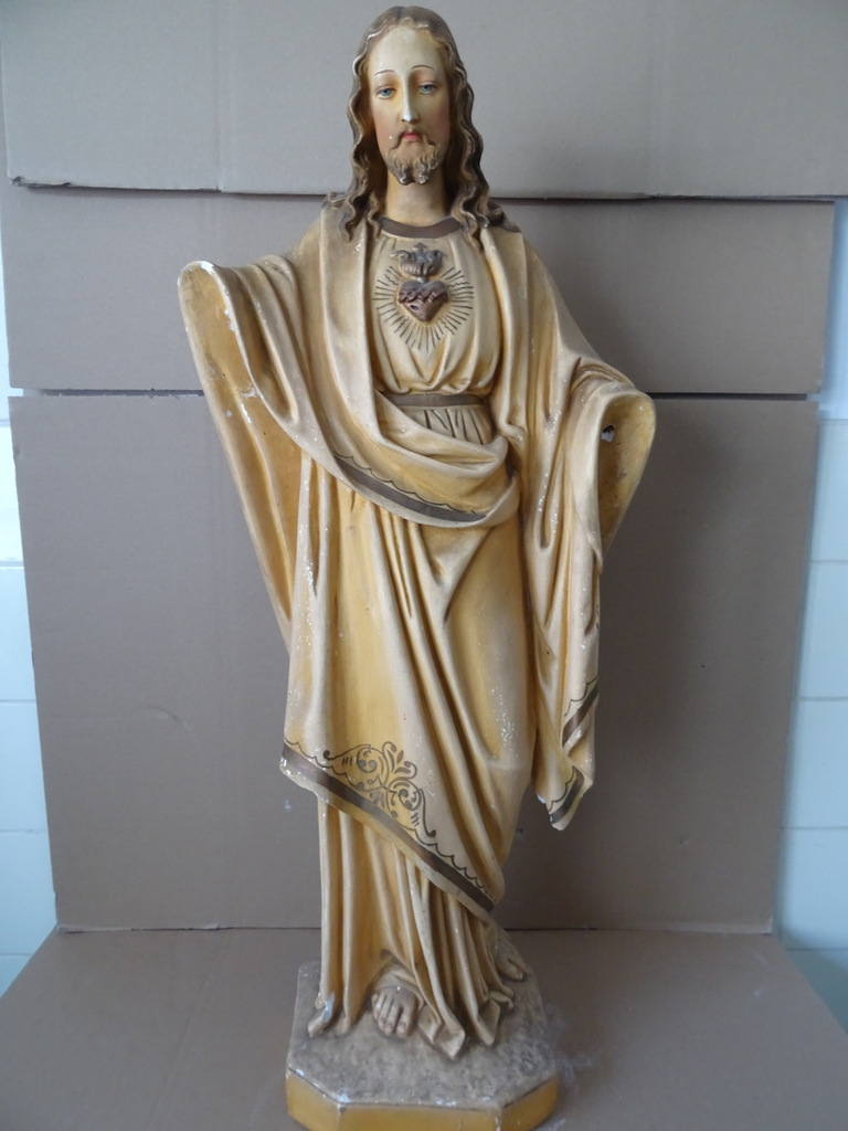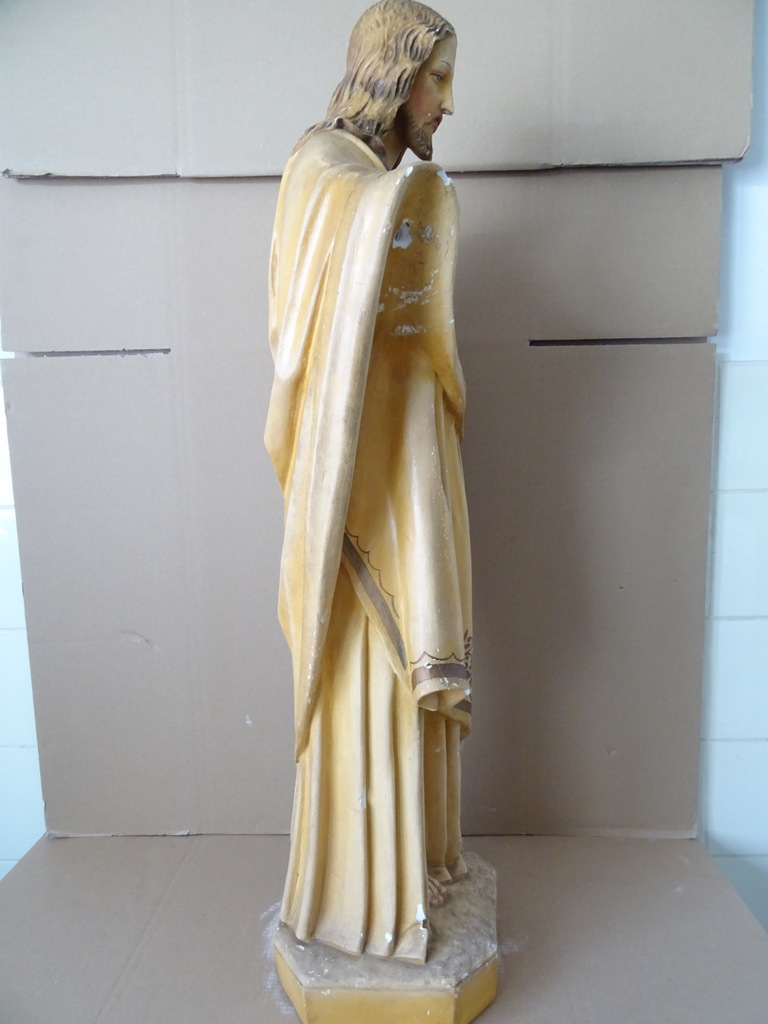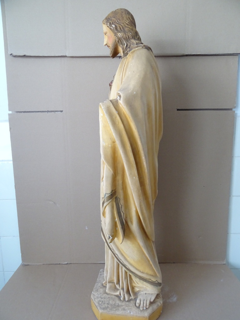 Groot antiek Jezusbeeld 86cm vervaardigd rond 1920 of wat later. Dit prachtige gipsen Jezusbeeld is in goede gebruikte staat. Ik vond het bij een restaurateur die ermee ophield. De handen ontbreken. Op vier plekken ontbreken enkele chipjes; de mantel naast de rechtervoet, bij de linkerknie, de rechtermouw en aan een teen. Het beeld stond lang in een opslag. Toen ik het afstofte met een penseel lieten er wat spikkeltjes lak los, zie foto’s. Speciale afhaalprijs 59 euro.