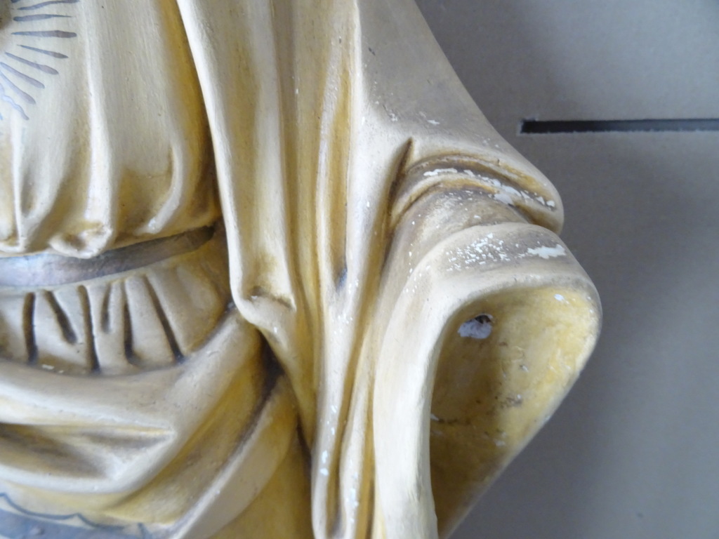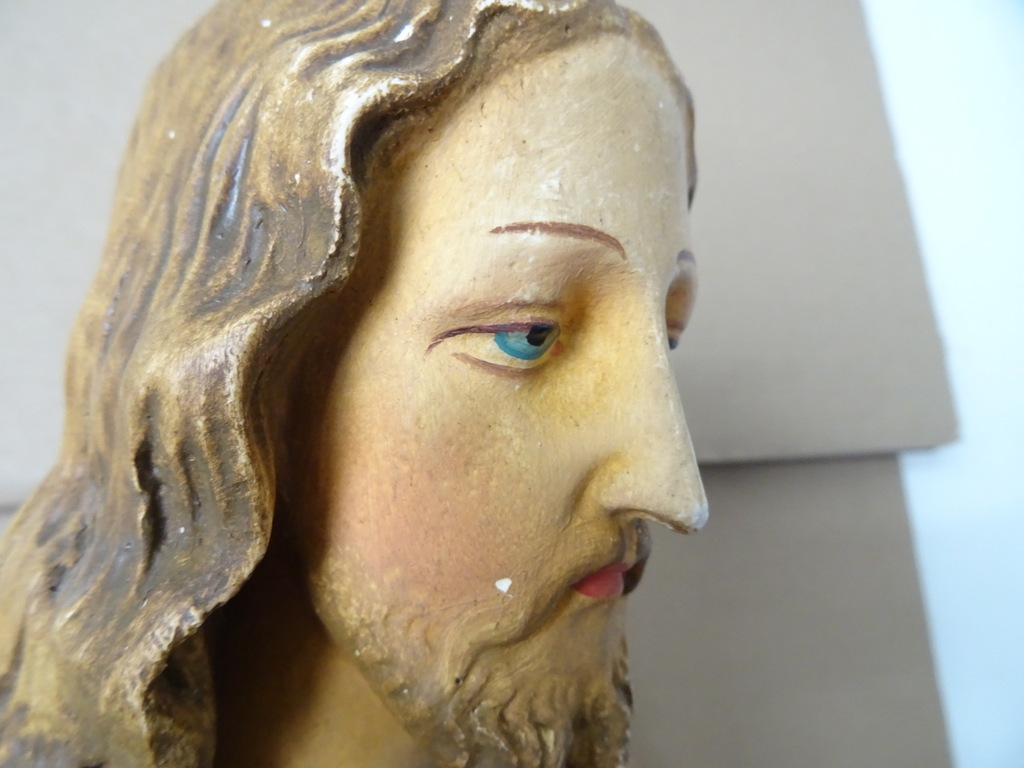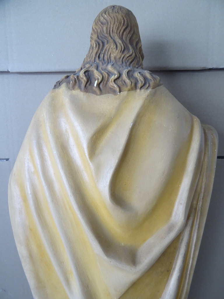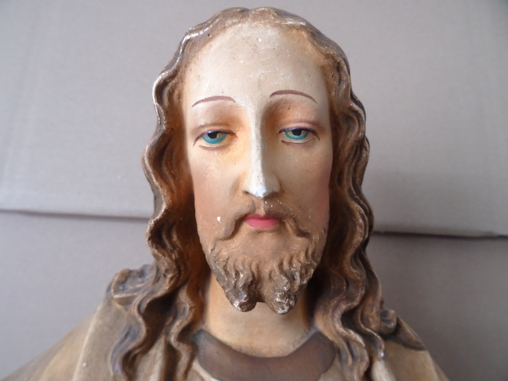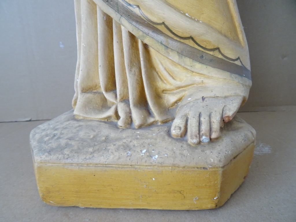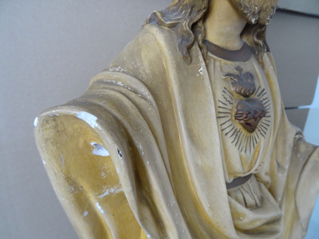 Groot antiek Jezusbeeld 86cm vervaardigd rond 1920 of wat later. Dit prachtige gipsen Jezusbeeld is in goede gebruikte staat. Ik vond het bij een restaurateur die ermee ophield. De handen ontbreken. Op vier plekken ontbreken enkele chipjes; de mantel naast de rechtervoet, bij de linkerknie, de rechtermouw en aan een teen. Het beeld stond lang in een opslag. Toen ik het afstofte met een penseel lieten er wat spikkeltjes lak los, zie foto’s. Speciale afhaalprijs 59 euro.