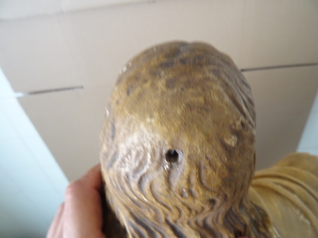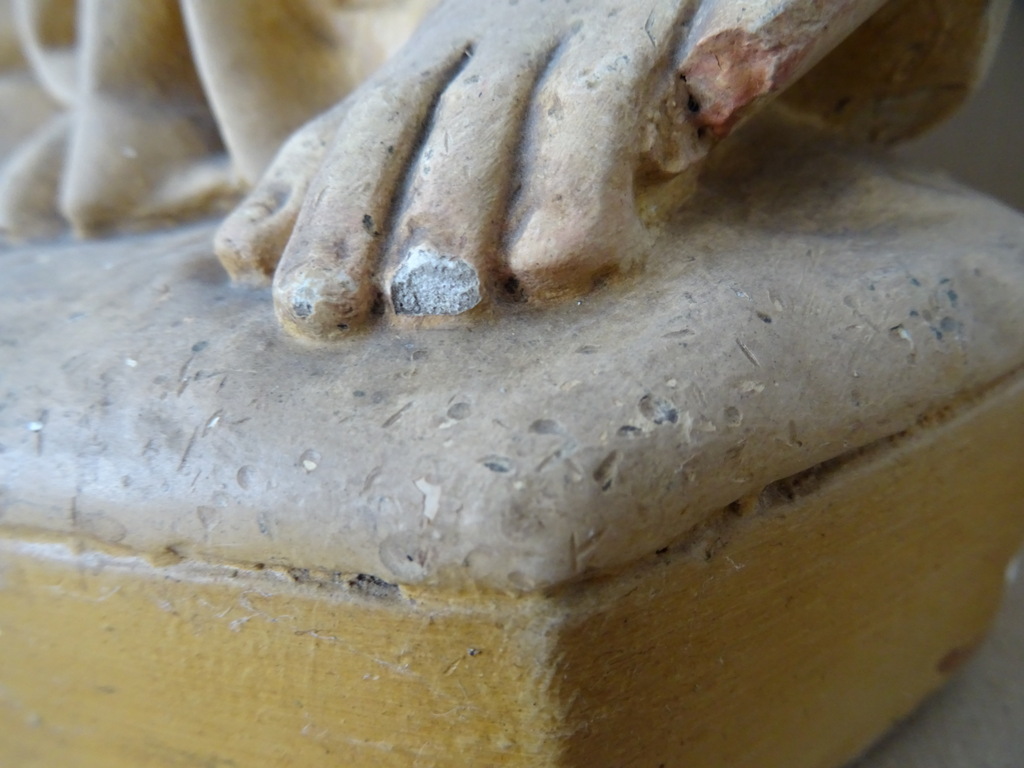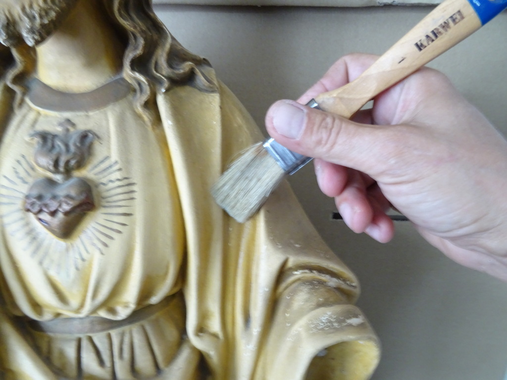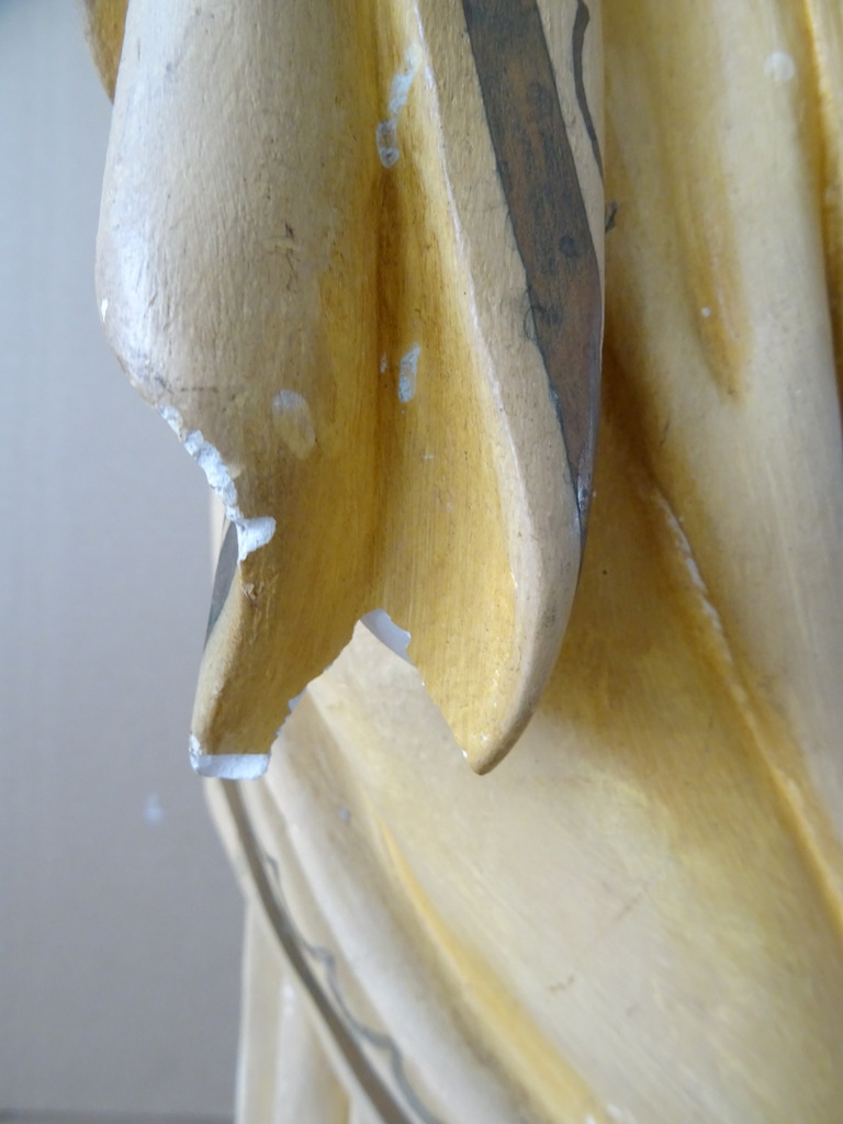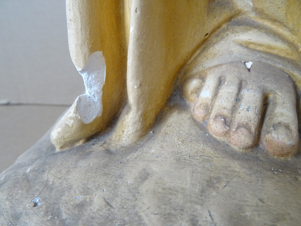 Groot antiek Jezusbeeld 86cm vervaardigd rond 1920 of wat later. Dit prachtige gipsen Jezusbeeld is in goede gebruikte staat. Ik vond het bij een restaurateur die ermee ophield. De handen ontbreken. Op vier plekken ontbreken enkele chipjes; de mantel naast de rechtervoet, bij de linkerknie, de rechtermouw en aan een teen. Het beeld stond lang in een opslag. Toen ik het afstofte met een penseel lieten er wat spikkeltjes lak los, zie foto’s. Speciale afhaalprijs 59 euro.