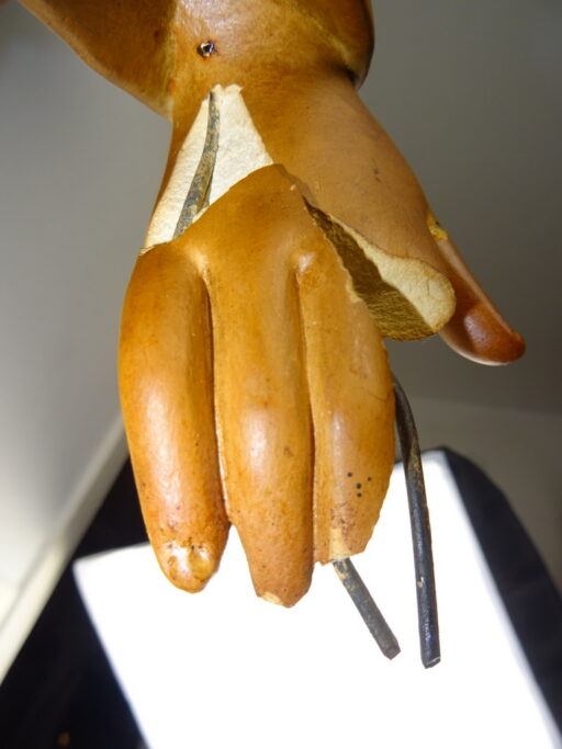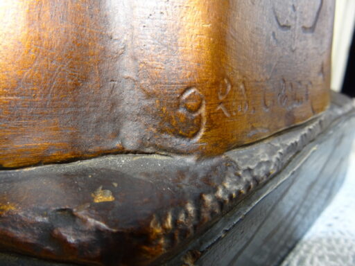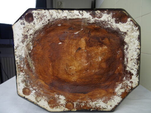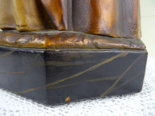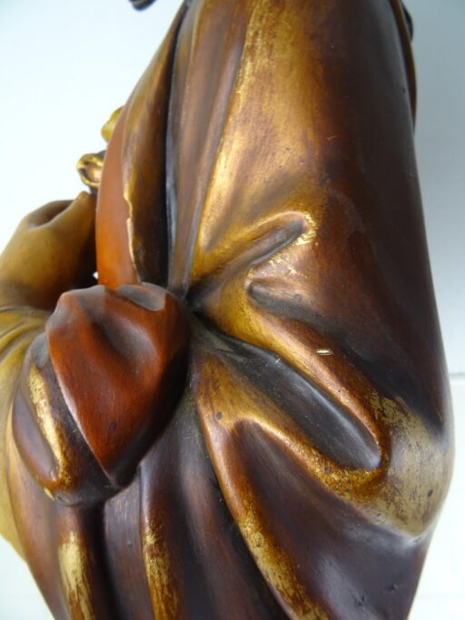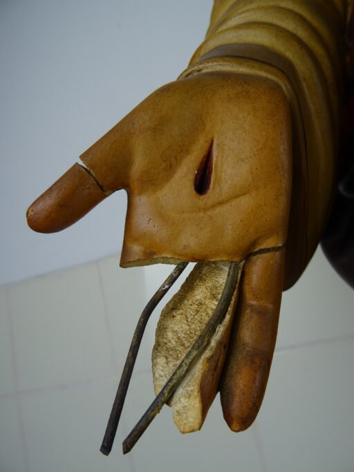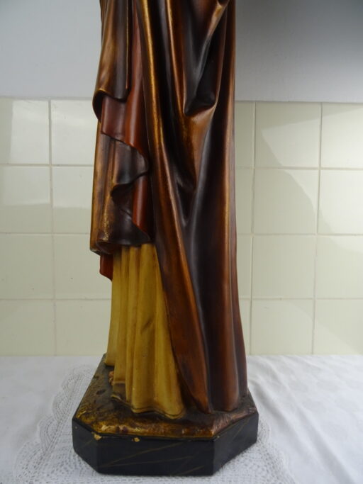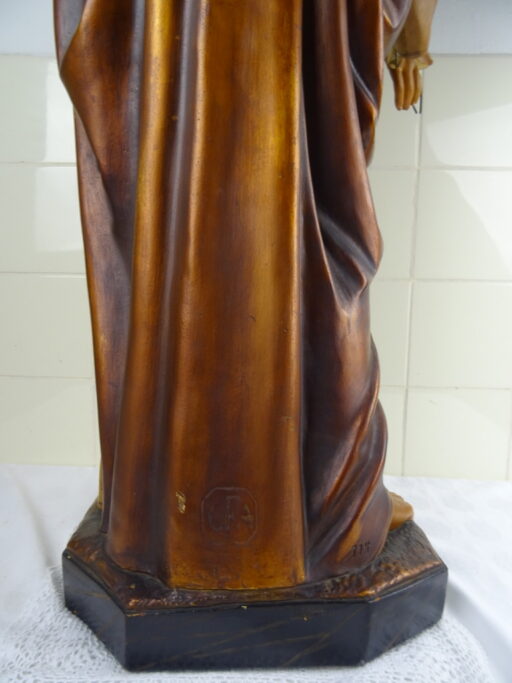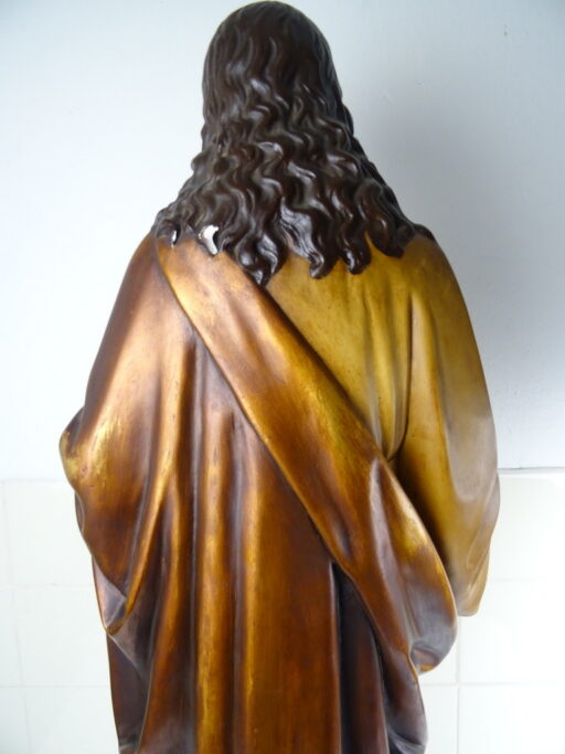 Levensgroot antiek Jezusbeeld vervaardigd in de eerste helft van de vorige eeuw of nog eerder. Het imponerende Jezusbeeld heeft een hoogte van 106 cm. De gelaatsuitdrukking van het beeld is werkelijk levensecht. Afgebeeld is Jezus Christus staan op een verhoging. De verhoging is voorzien van strepen waardoor deze van marmer lijkt. Jezus toont de wonden van de kruisiging en hij wijst naar zijn hart. Dit laatste wijst erop dat het een Heilig Hart beeld is. (De Heilig Hart-devotie begon door de berichten over de visioenen van Margaretha Maria Alacoque (1646-1690). Aan haar zou Jezus zijn bloedend hart hebben getoond. Volgens deze kloosterzuster uit het Franse Paray-le-Monial was zij door Jezus deelgenoot gemaakt van zijn verdriet vanwege het groot aantal mensen die zijn liefde afwezen.) Het beeld is in vrij goede staat afgezien van de kapotte hand, enkele chipjes ( 2 minuscule aan het hoofd, wat grotere op linkerschouder en wat kleine aan de voet van het beeld) en lichte lak-schade op enkele plekken, zie foto’s. Indien gewenst wordt het beeld in ere hersteld. Het beeld is gesigneerd met GFA en daaronder iets dat lijkt op JBXP. Er zijn ook enkele getallen op aangebracht; Links 920 (dit kan ook 1920 zijn geweest) en rechts 114. Vanwege het grote formaat van het beeld is het mogelijk dat het in een kerk of klooster heeft gestaan. Speciale afhaalprijs 249 euro. Er zijn ook nog twee zuilen apart verkrijgbaar, zie laatste foto’s. Een imponerende aardewerk zuil van circa 100 cm (199 euro) en een mooie houten zuil van 68.5 cm (49 euro).