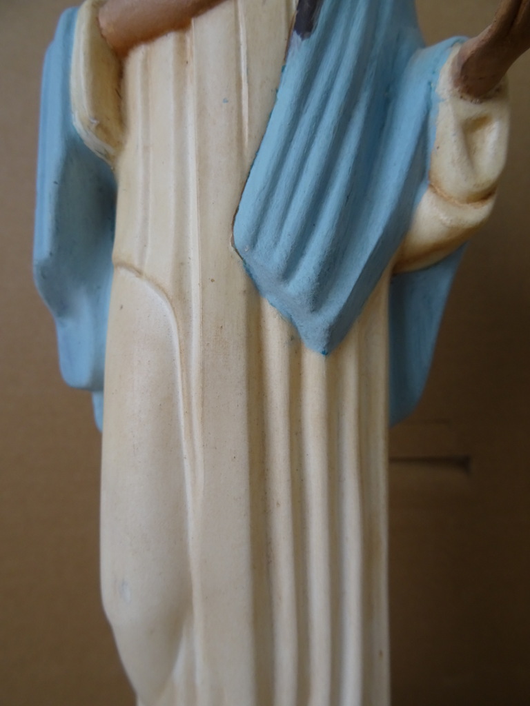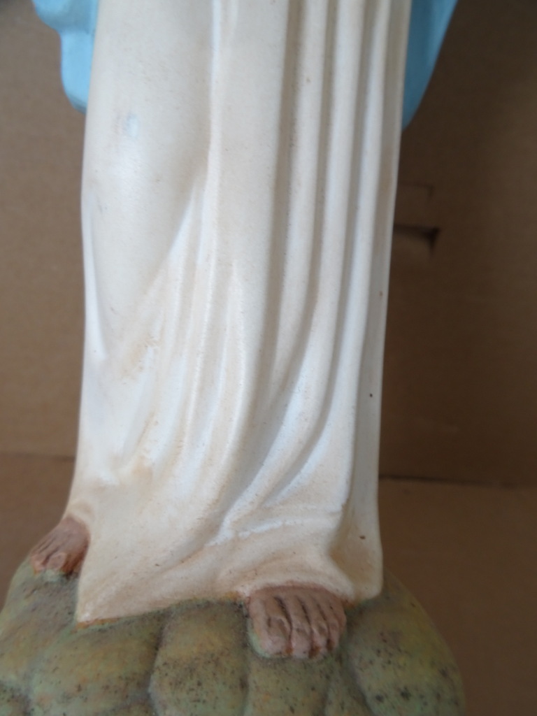 Mariabeeld Koningin van de Vrede Kraljica Mira 32cm vervaardigd rond 1981 of iets later. Afgebeeld is de Heilige Maria staand op een verhoging met één hand uitgestoken. Het gipsen beeld is in een schitterende gebruikte staat, puntgaaf. Er zijn enkele minuscule lakbeschadigingen aan een hand, verder slechts wat lichte verkleuring en minimale lakschade, zie foto’s. Met opdruk; Kraljica Mira 25.05.1981 Medjugorje. Toelichting; In het wonderlijke dorp Medjugorje in Bosnië-Herzegovina verschijnt Maria sinds 24 juni 1981 aan zes zieners. Onze Lieve Vrouwe van Medjugorje wordt ook wel de Moeder van de Verlosser genoemd en de Koningin van de vrede.