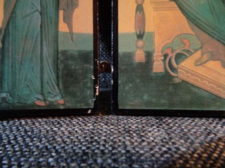 Antiek drieluik icoon Jezus Christus op troon vervaardigd rond 1950 of iets eerder. Het gedrukte icoon toont Jezus zittend op een troon met een boek. Afmetingen gesloten; circa 10 bij 14 bij 1,5 cm. Afmetingen geopend; circa 19,5 bij 13,5 bij 0,6 cm. In een schitterende gebruikte staat, 2 van de pennen tussen de panelen zijn ietwat los (wel hand-vast) en het hout is licht gaan werken, zie foto’s.