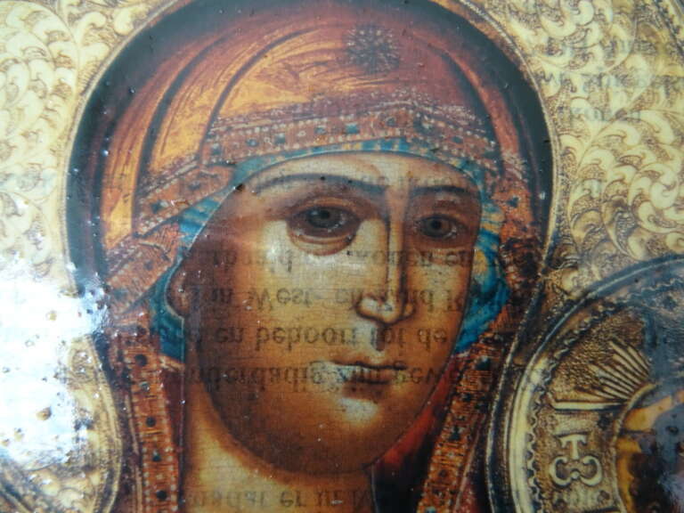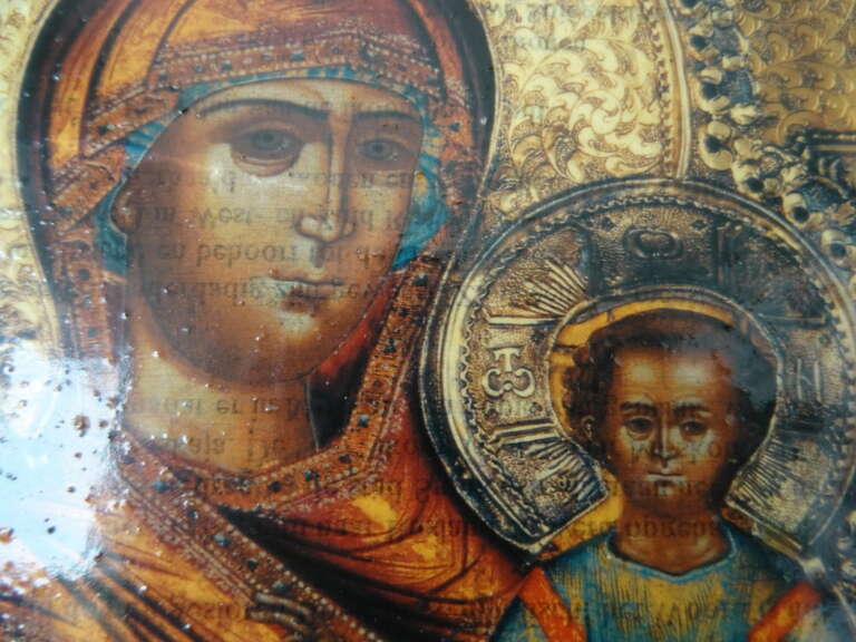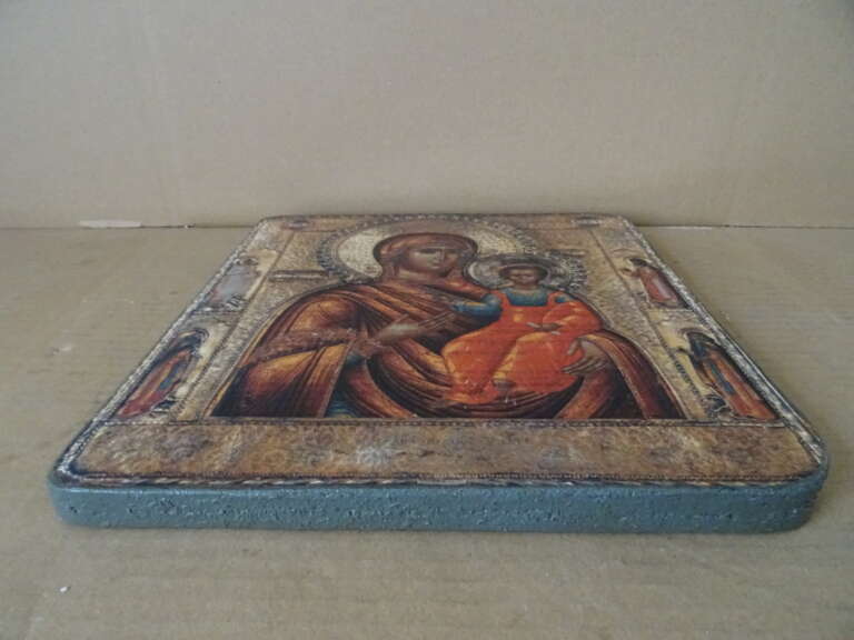 Groot Hodegitria Moeder Gods icoon vervaardigd rond 1960 of later. Het icoon van circa 26 bij 28 cm is vermoedelijk een gedrukte afbeelding, het is niet goed meer te zien. Getoond wordt Heilige Maria als de Moeder Gods. Het stuk is in een prachtige gebruikte staat, er is een dikke beschermende laag (een soort lak) aangebracht over het icoon en over de zijkanten. In deze laag zijn overal spikkeltjes ontstaan, zie foto’s. Het valt haast niet op van een afstand, zie foto’s. De Hodegitria Moeder Gods is de Wegwijzende Moeder gods. Het is een replica van een eeuwenoud Byzantijns icoon, zie informatie op achterzijde. Wat opvalt zijn de teksten die onder de afbeeldingen van Maria en Jezus zichtbaar zijn. Het lijkt op Cyrillisch of Grieks of iets dergelijks. De laatste 7 foto’s zijn buiten genomen, in de zon.