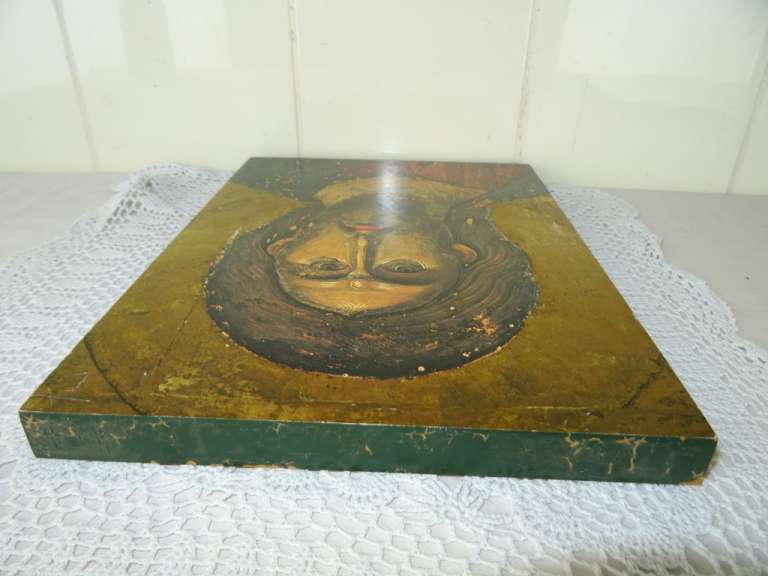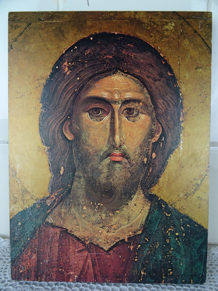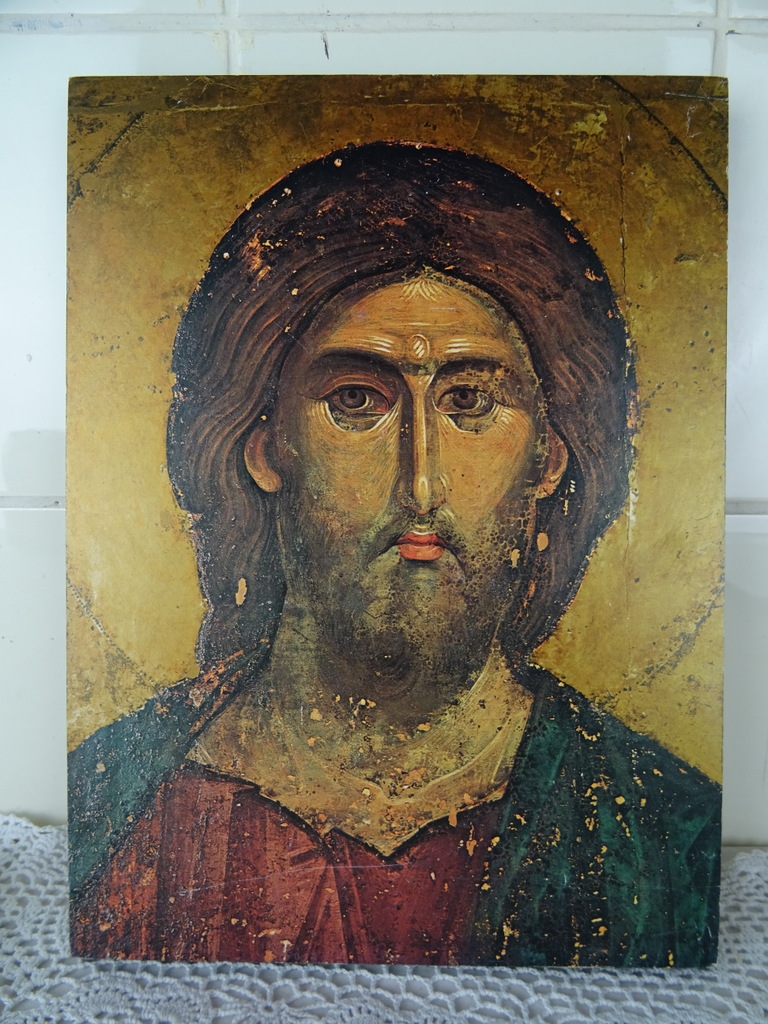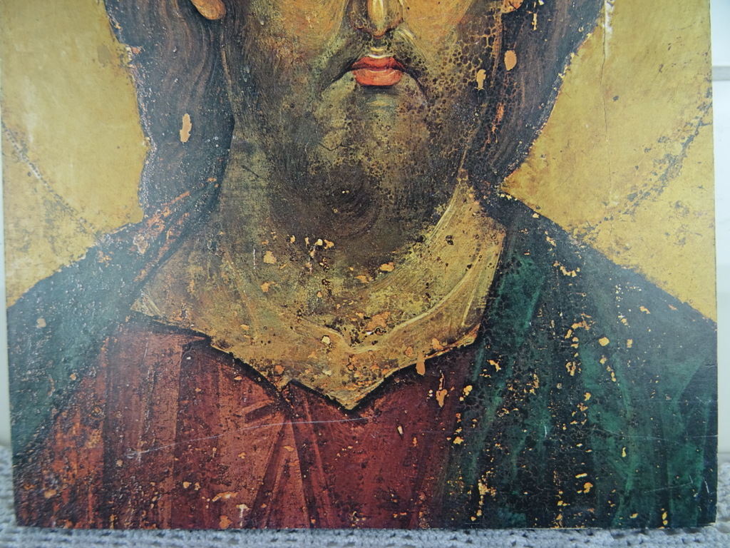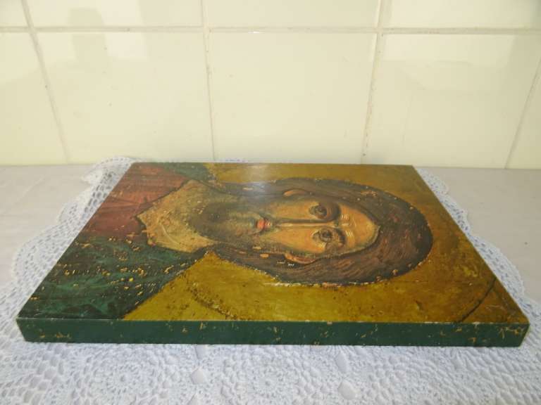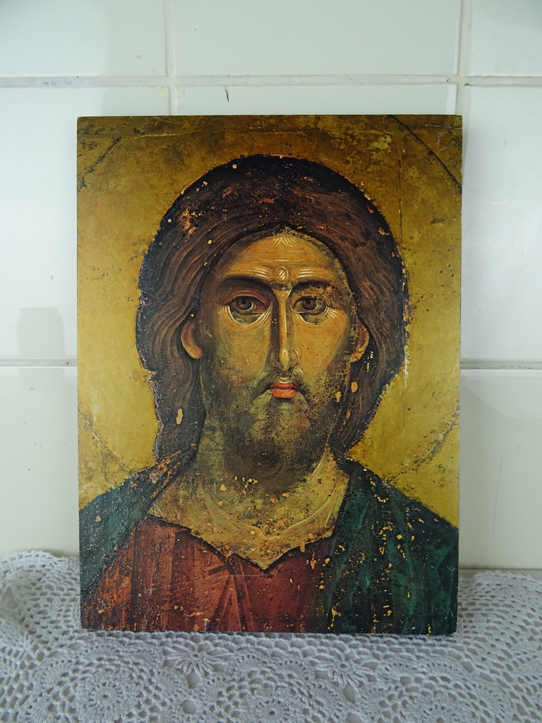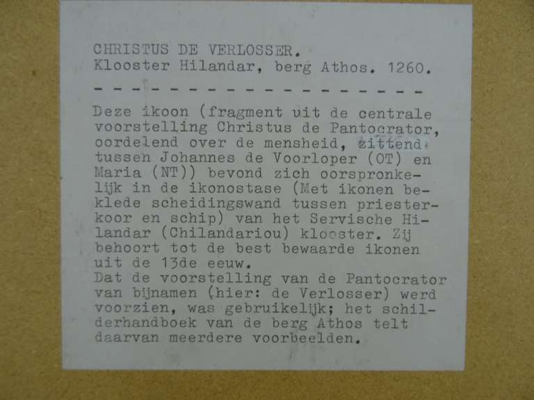 Groot icoon Christus de Verlosser vervaardigd rond 1950 of iets later. Het prachtige grote icoon is gemaakt van een gedrukte afbeelding bevestigd op een houten paneel. Afgebeeld is Jezus Christus met een indringende blik in zijn ogen. Op de achterkant een begeleidende tekst, zie foto’s. Het icoon is in goede gebruikte staat, heeft slechts enkele (niet storende) krassen, zie foto’s. Het is een Grieks icoon, een replica van een icoon uit 1260.