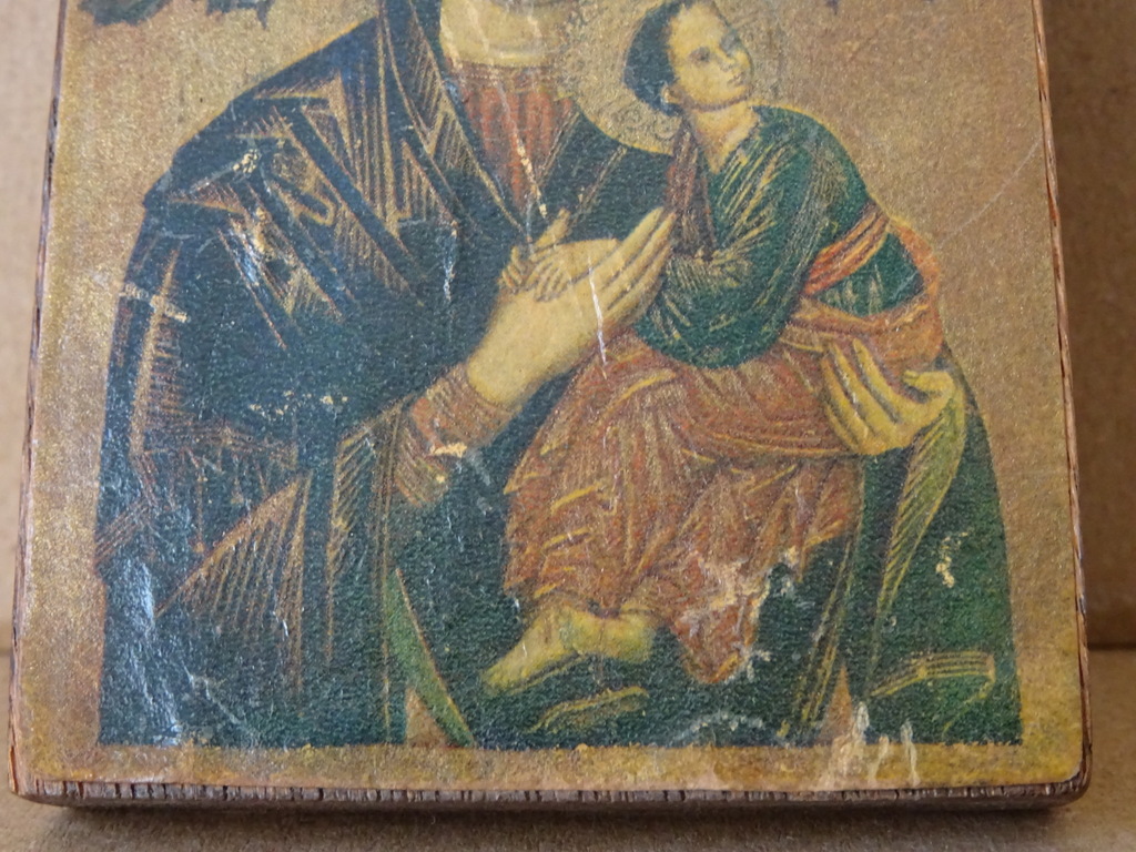 Maria icoontje O.L. Vr. van altijddurende bijstand vervaardigd rond 1960 of wat later. Het fraaie icoon van circa 5.5 bij 7,2 cm is gemaakt van een gedrukte afbeelding die bevestigd is op een paneel van hout. Afgebeeld is de Heilige Maria met het kindje Jezus, boven hen zijn twee engelen te zien. Afkomstig uit de collectie van een pastoor op leeftijd. Het icoontje is in een prachtige gebruikte staat, zie foto’s.
