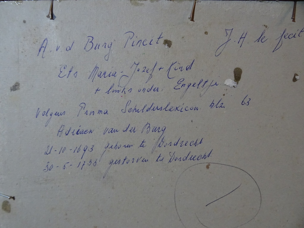18e Eeuw Antieke ets Adriaan van der Burg vervaardigd in de periode 1710-1800. Afgebeeld is de Heilige Familie met linksonder een engel ofwel Johannes. Kijk goed naar de tekst op de achterkant. Het stuk is getoond aan een verzamelaar. Hij wist me te vertellen dat het in ieder geval een gedrukt tafereel op papier uit de 18e eeuw betreft. Kortom; een fraai stuk dat u alleen bij ons vindt.