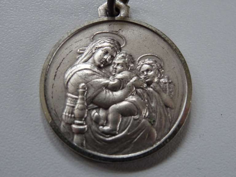 Antiek medaillon Maria, Jezus en Johannes vervaardigd rond 1950 of iets eerder. Een fraai medaillon van tin of een andere onbekende metaalsoort, doorsnede circa 2,5 cm. Een heel apart stuk, afkomstig uit de collectie van een pastoor op leeftijd. In nog vrij goede staat, zie foto’s. Aan de achterzijde gemerkt met een M.