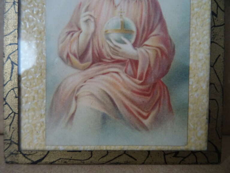 Antiek prentje Kindje Jezus achter glas vervaardigd rond 1900. Afgebeeld is het Kindje Jezus met een bal die synoniem staat voor de wereld. De afmetingen van het glas zijn 9 bij 12 cm. Het geheel is nog in goede staat. Kan verzonden worden als brievenbuspakje.