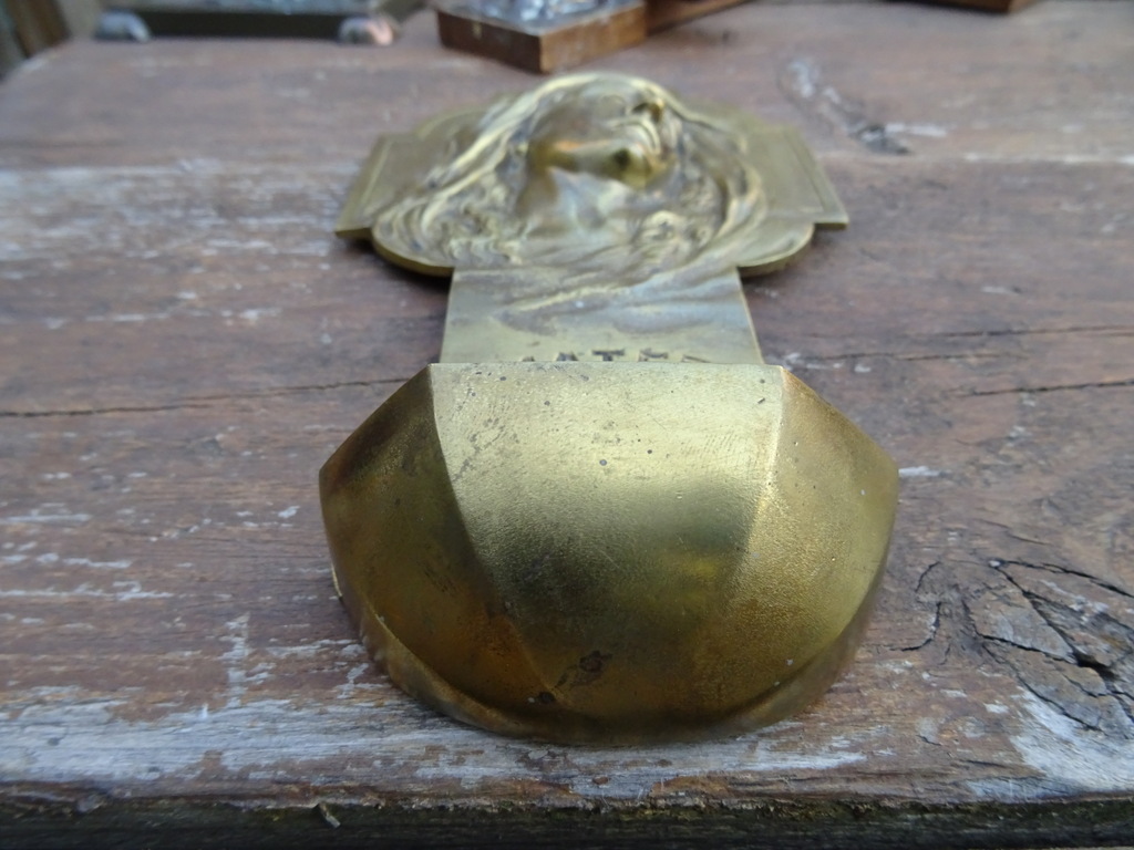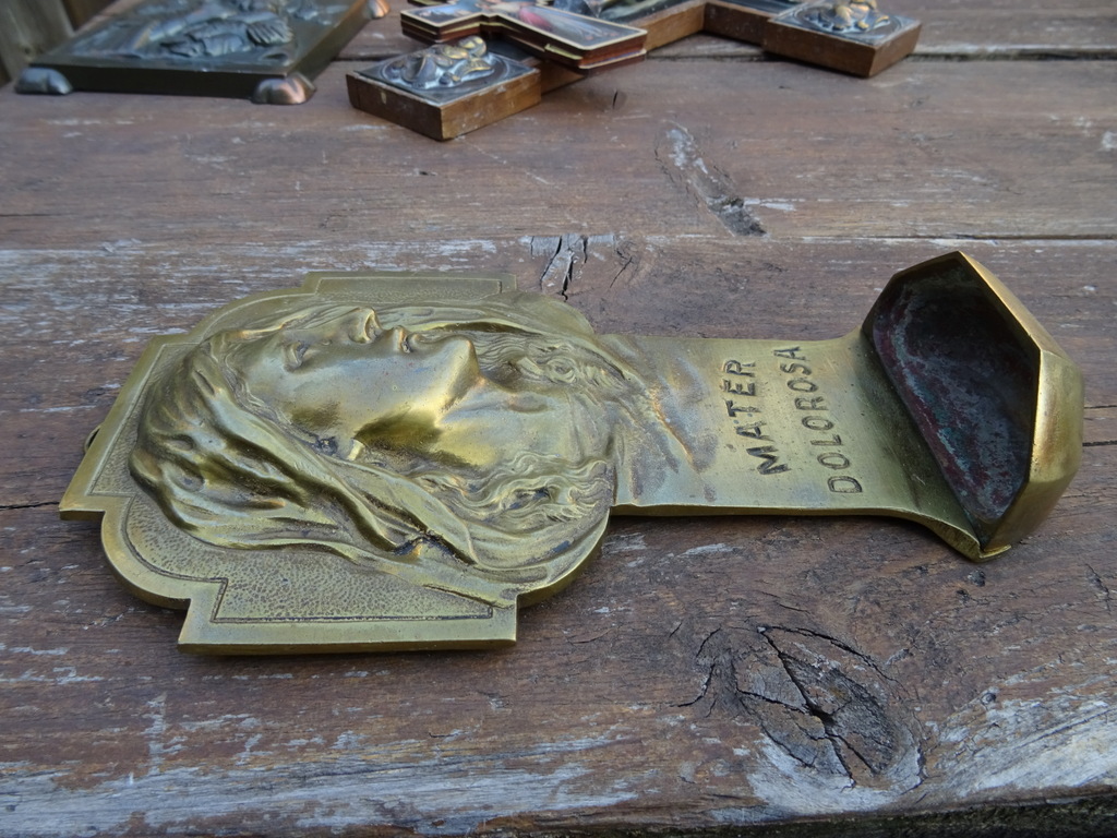 Antiek wijwatervat Mater Dolorosa vervaardigd rond 1850. Het prachtige stuk is afkomstig uit een oude familiecollectie. Afgebeeld is de Heilige Maria, huilend. Mater Dolorosa staat voor Bedroefde moeder, oftewel Onze Lieve Vrouw van Smarten. Het wijwatervat is gegoten uit gele koper of brons. Het is aan de achterkant gemerkt; GD depose. In een prachtige gebruikte staat, zie foto’s.