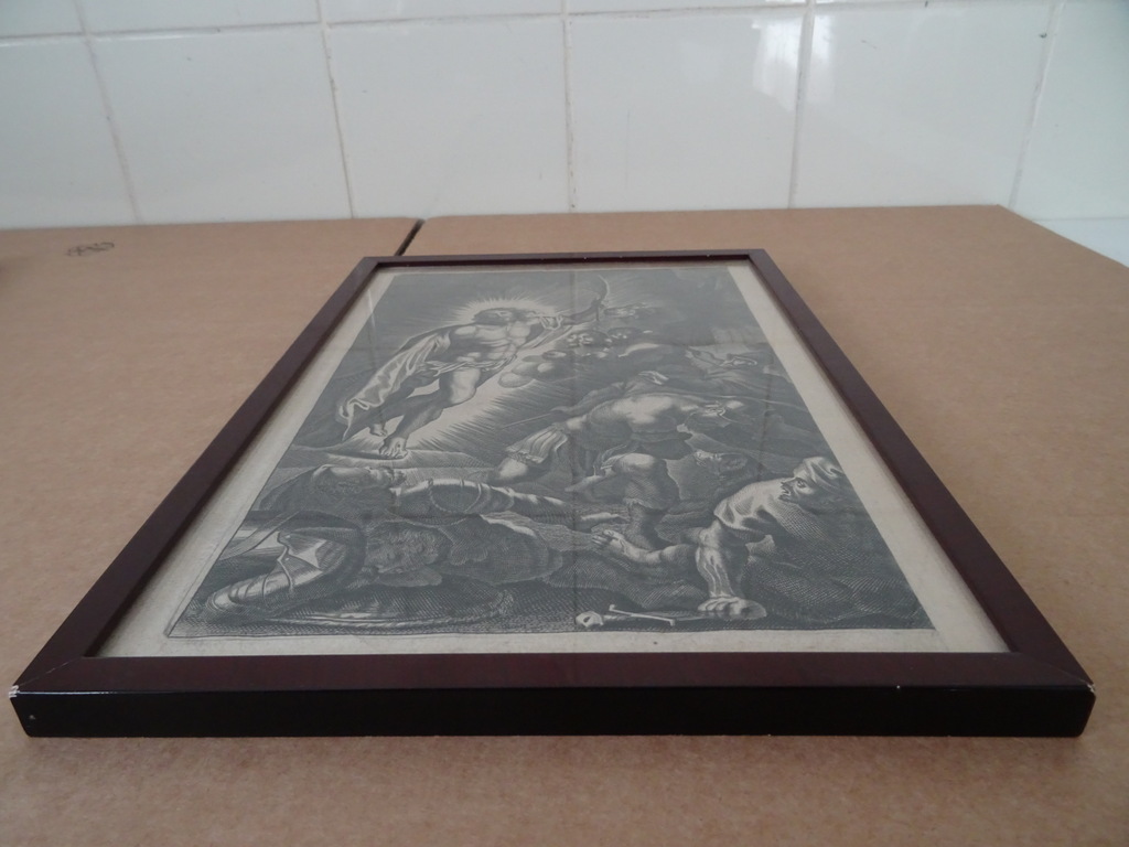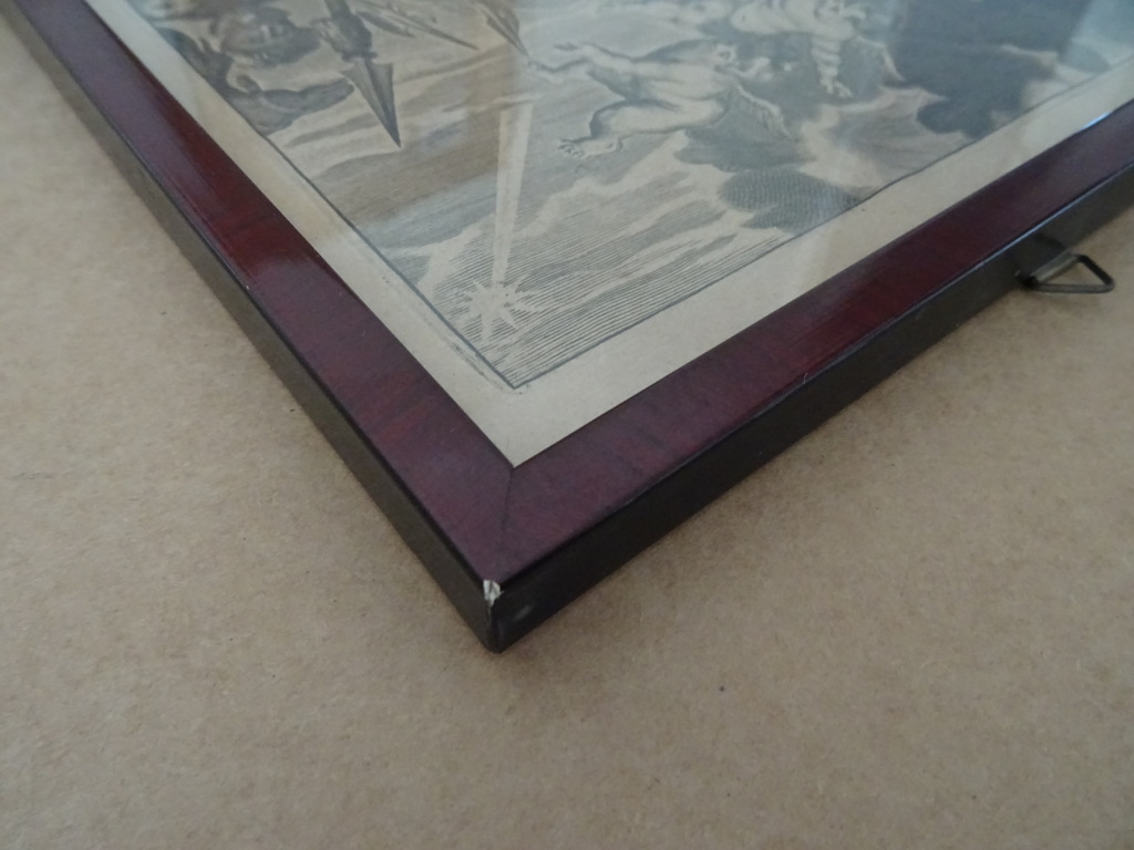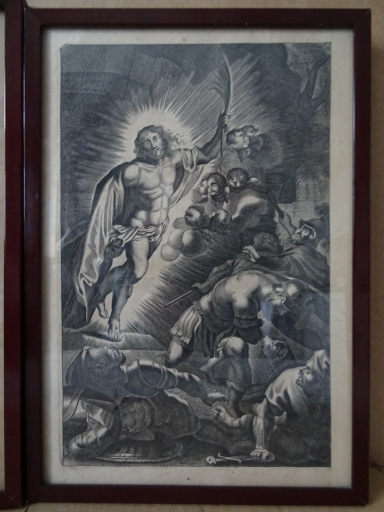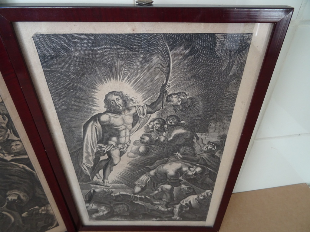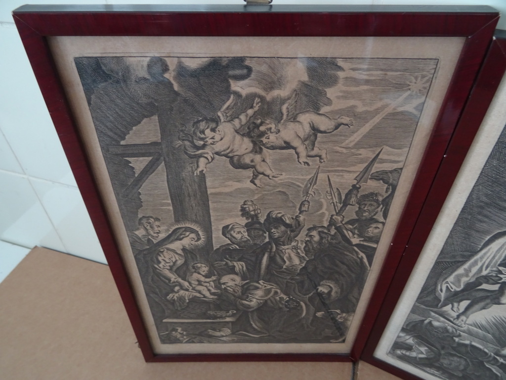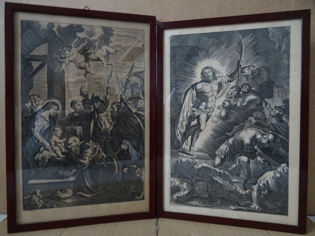 Antieke gravures Jezus Christus vervaardigd rond 1900 of iets later. Afgebeeld is eerst Jezus Christus als baby terwijl engelen mensen de weg wijzen naar hem. Op de tweede gravure is Jezus Christus afgebeeld als volwassen man terwijl hij Romeinse soldaten schrik aanjaagt. Ook hier zijn engelen te zien in het tafereel Afkomstig uit de collectie van een pastoor op leeftijd. In een schitterende gebruikte staat. De lijsten van 20.8 bij 31.3 cm en 21.3 bij 30.4 cm zijn nog solide, het glas is nog heel. Beide lijsten nog verzegeld aan de achterzijde. De lijsten hebben minimale sporen van gebruik (lakschade), zie foto’s. De laatste 27 foto’s zijn bij zojuist meer daglicht gemaakt.