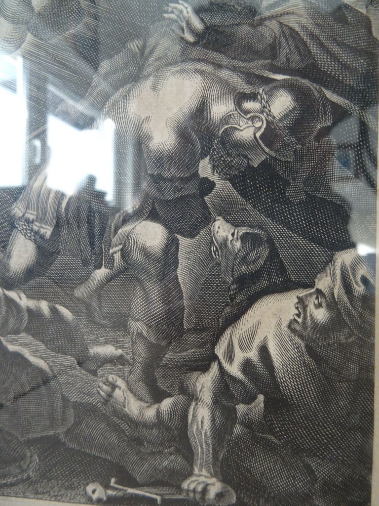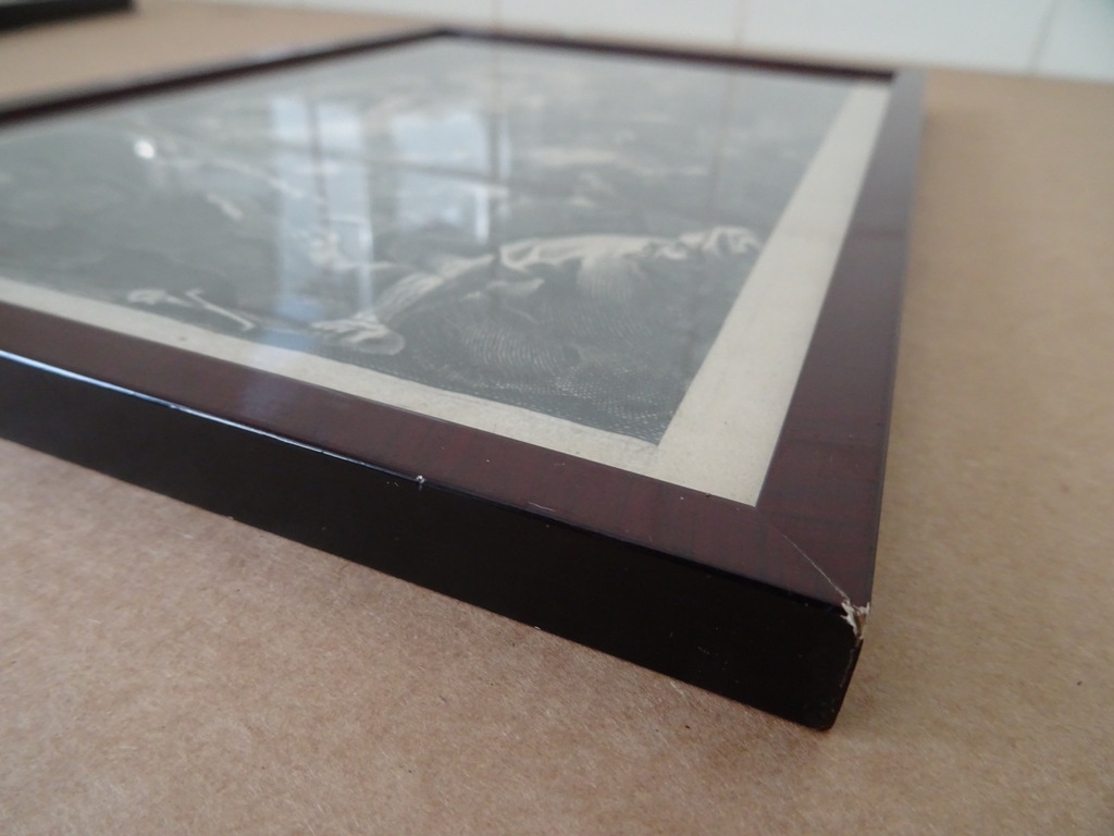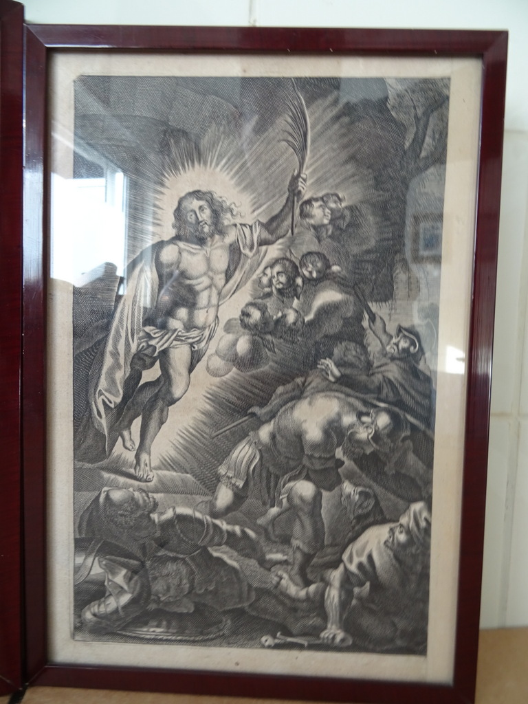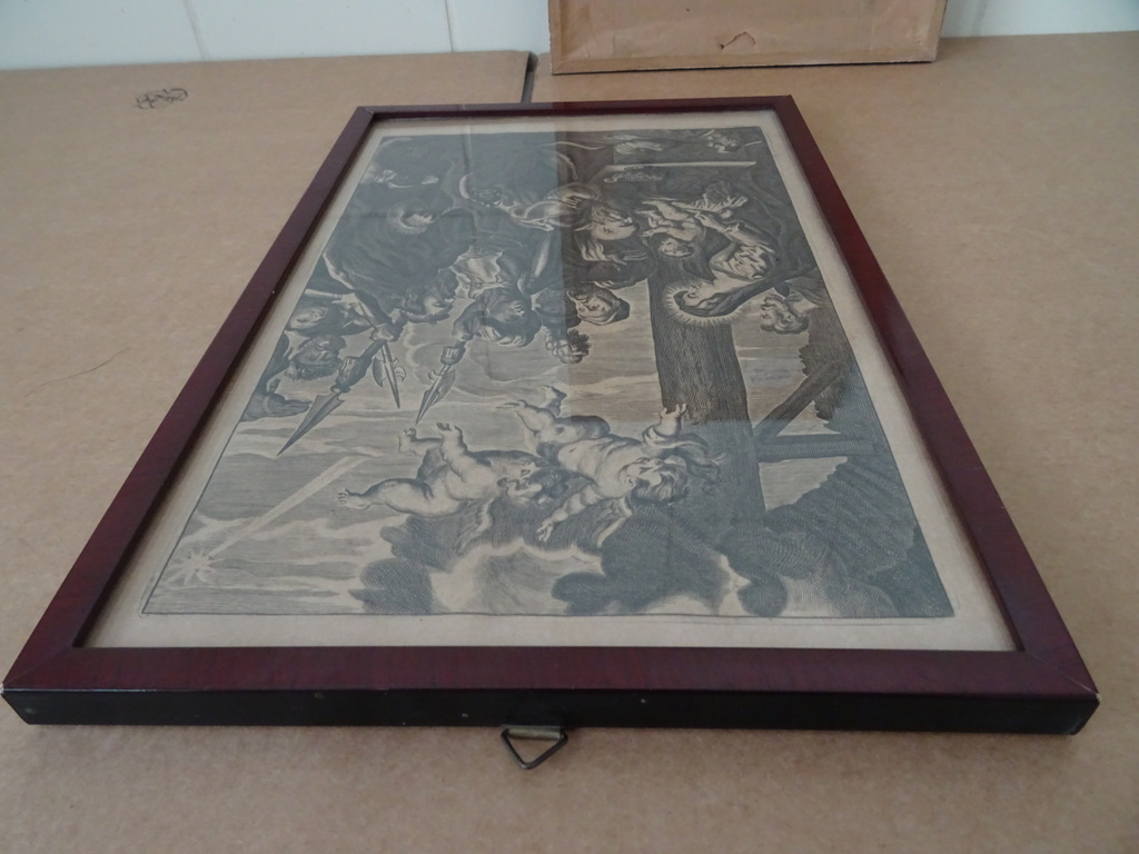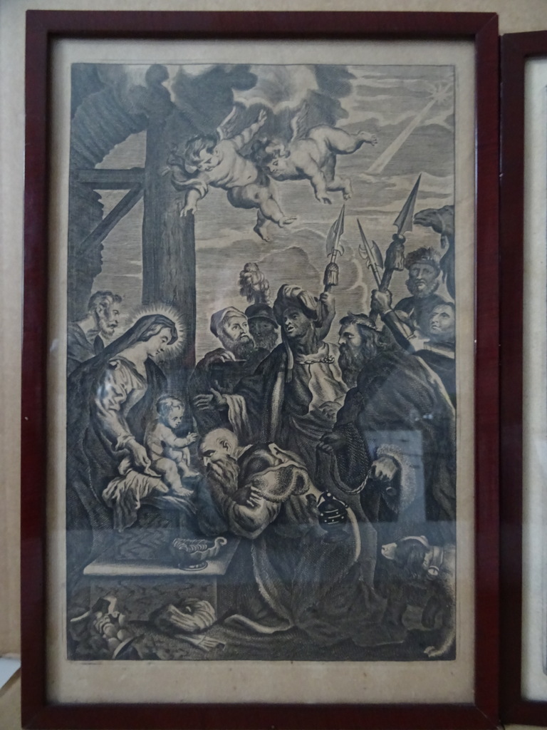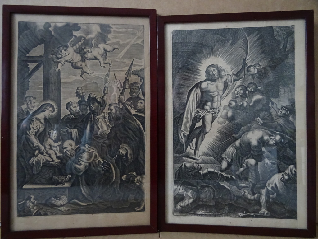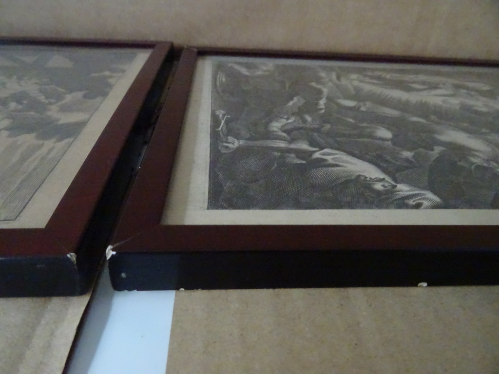 Antieke gravures Jezus Christus vervaardigd rond 1900 of iets later. Afgebeeld is eerst Jezus Christus als baby terwijl engelen mensen de weg wijzen naar hem. Op de tweede gravure is Jezus Christus afgebeeld als volwassen man terwijl hij Romeinse soldaten schrik aanjaagt. Ook hier zijn engelen te zien in het tafereel Afkomstig uit de collectie van een pastoor op leeftijd. In een schitterende gebruikte staat. De lijsten van 20.8 bij 31.3 cm en 21.3 bij 30.4 cm zijn nog solide, het glas is nog heel. Beide lijsten nog verzegeld aan de achterzijde. De lijsten hebben minimale sporen van gebruik (lakschade), zie foto’s. De laatste 27 foto’s zijn bij zojuist meer daglicht gemaakt.