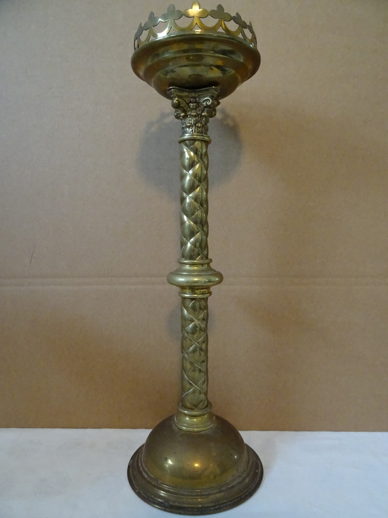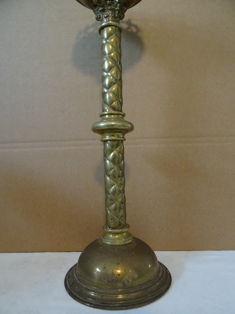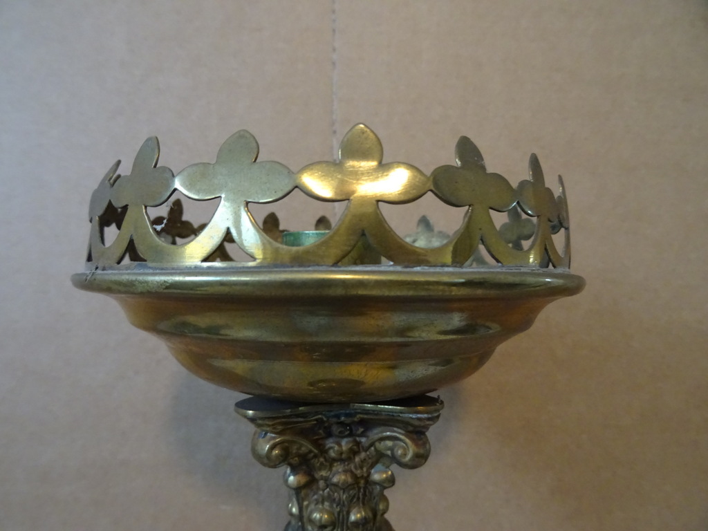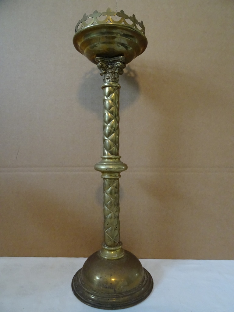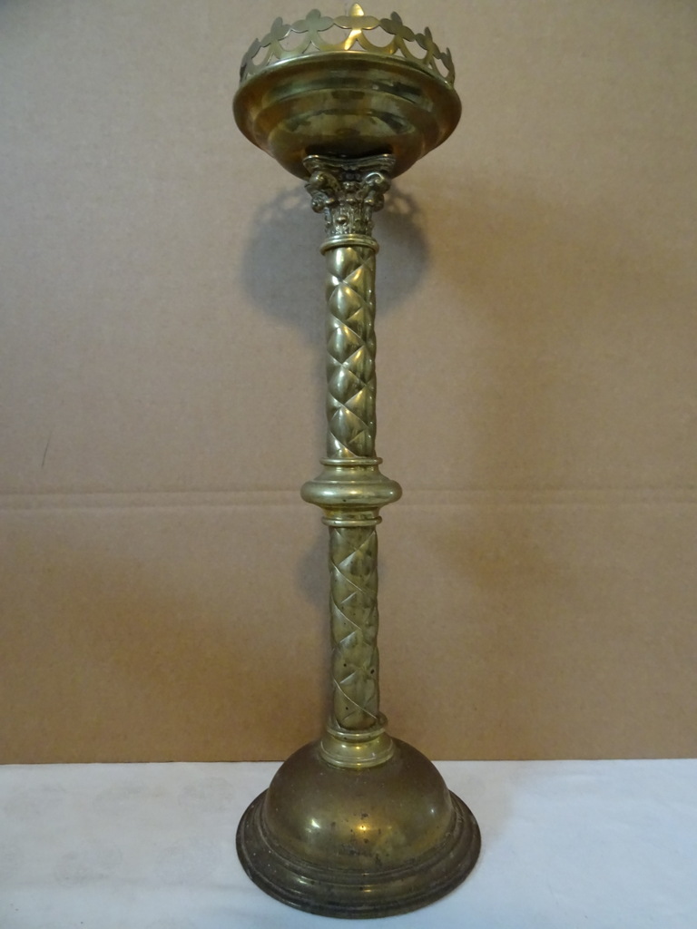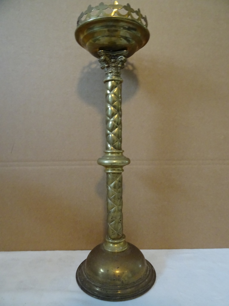 Antieke kandelaar kerk 48 cm vervaardigd in de periode 1850-1900 (schatting). Prachtig gedecoreerd met onder meer kruizen rondom de kaarshouder. De koperen kandelaar is in een schitterende gebruikte staat, een tikkeltje scheef, zie foto’s. Verrijk uw interieur met deze imponerende antieke kandelaar van 48 cm!