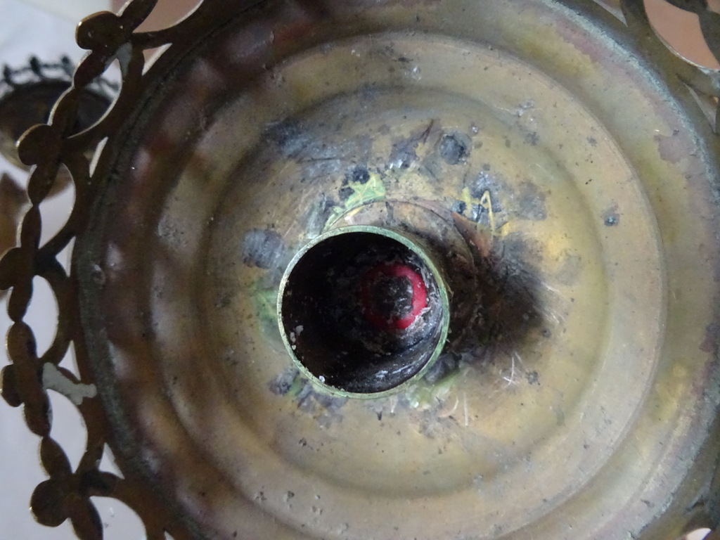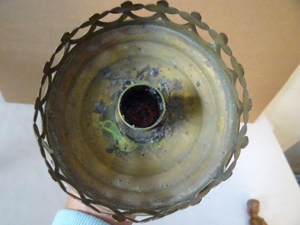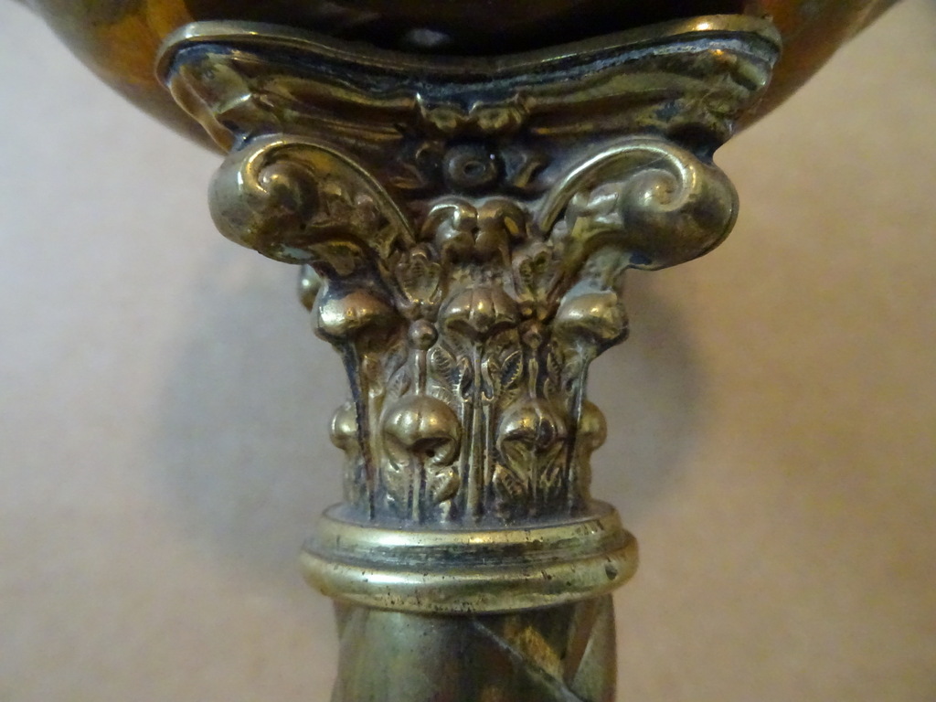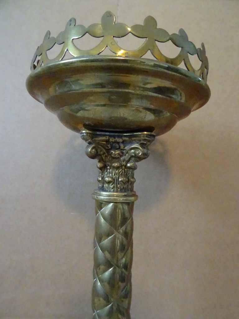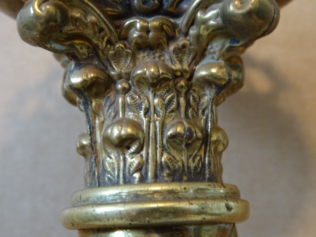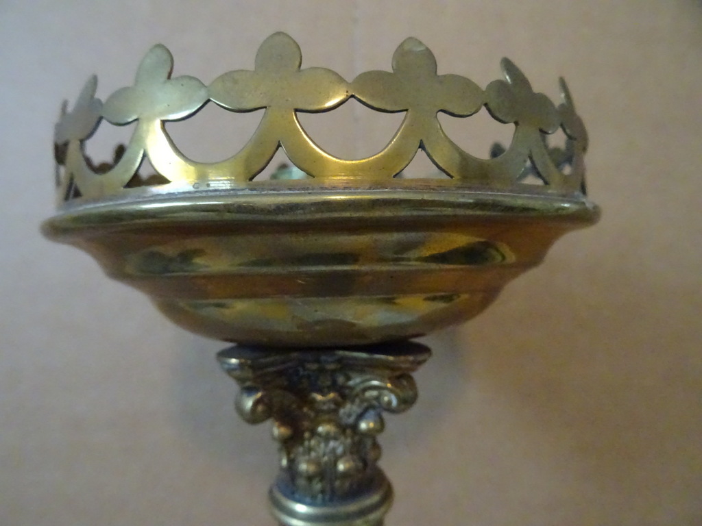 Antieke kandelaar kerk 48 cm vervaardigd in de periode 1850-1900 (schatting). Prachtig gedecoreerd met onder meer kruizen rondom de kaarshouder. De koperen kandelaar is in een schitterende gebruikte staat, een tikkeltje scheef, zie foto’s. Verrijk uw interieur met deze imponerende antieke kandelaar van 48 cm!