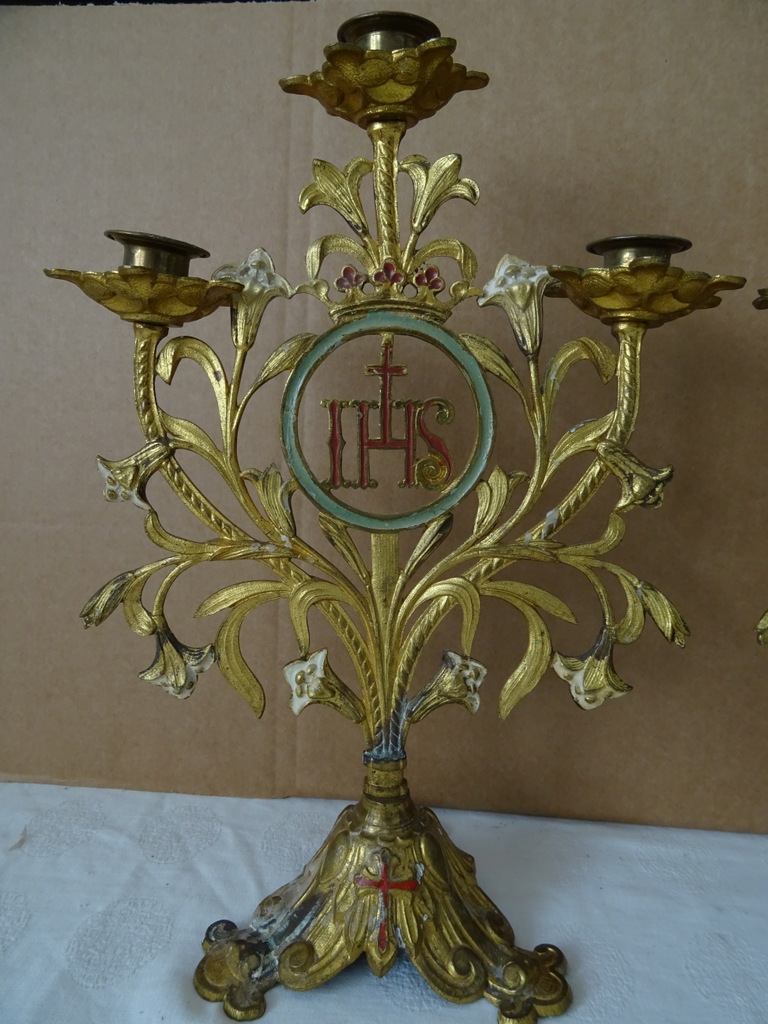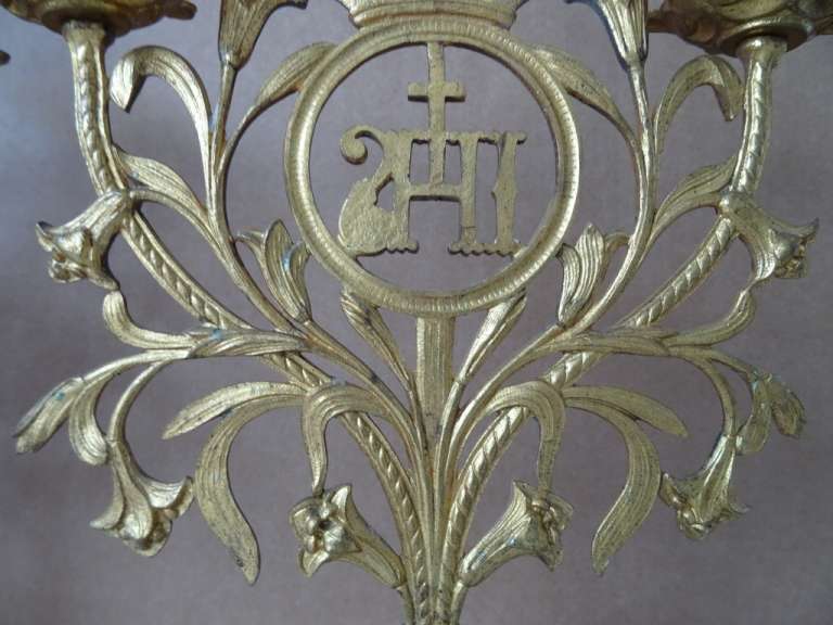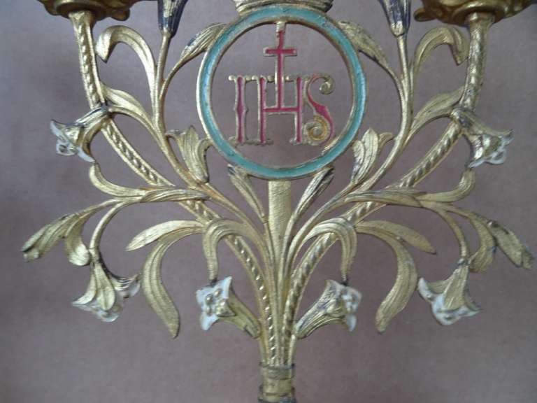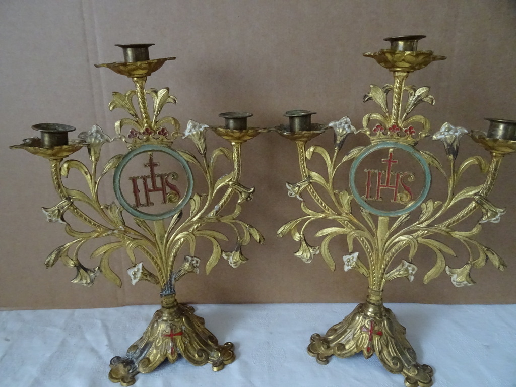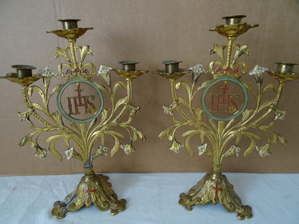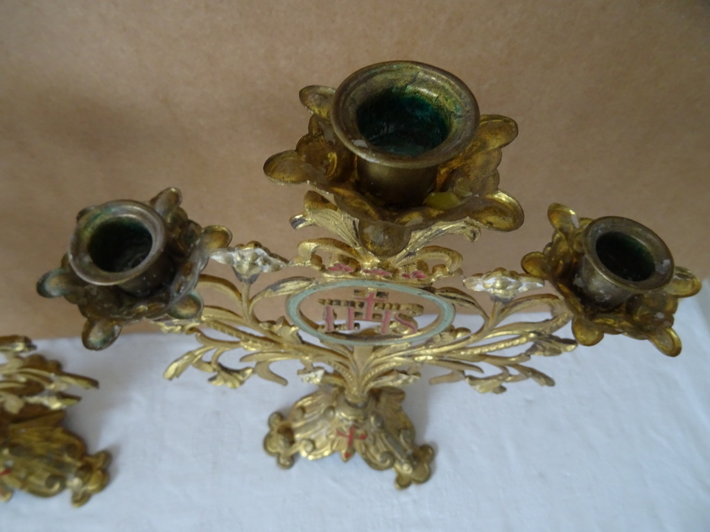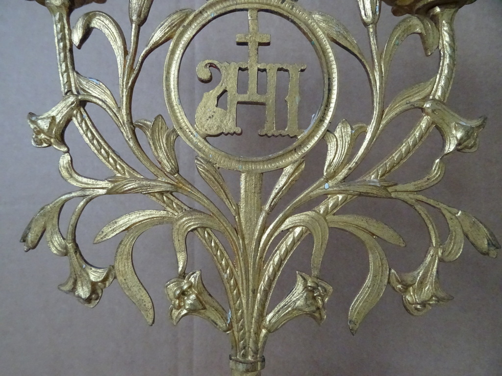 Antieke kandelaars van verguld brons vervaardigd in de periode 1800-1900. Beide met prachtig gedecoreerd met lelietakken en opschrift IHS, dit betekent de Heilige Naam van Jezus. De fraaie kandelaars zijn in een prachtige gebruikte staat, hier en daar wat scheef, zie foto’s. Afmetingen per stuk; circa 23.5 bij 12.5 bij 34 cm.