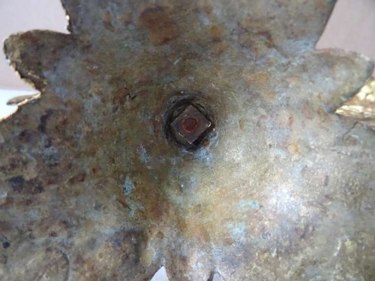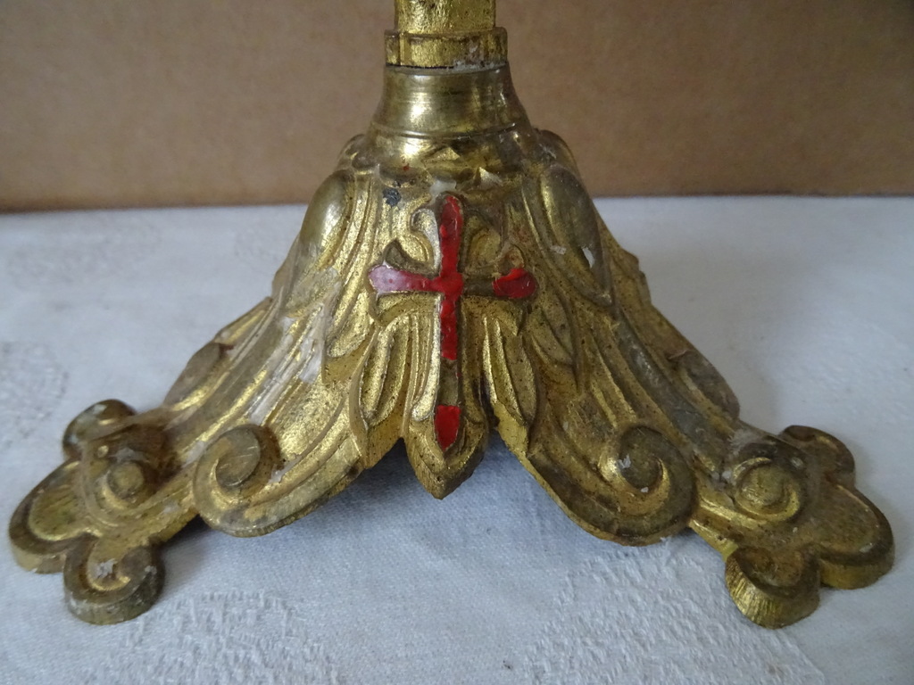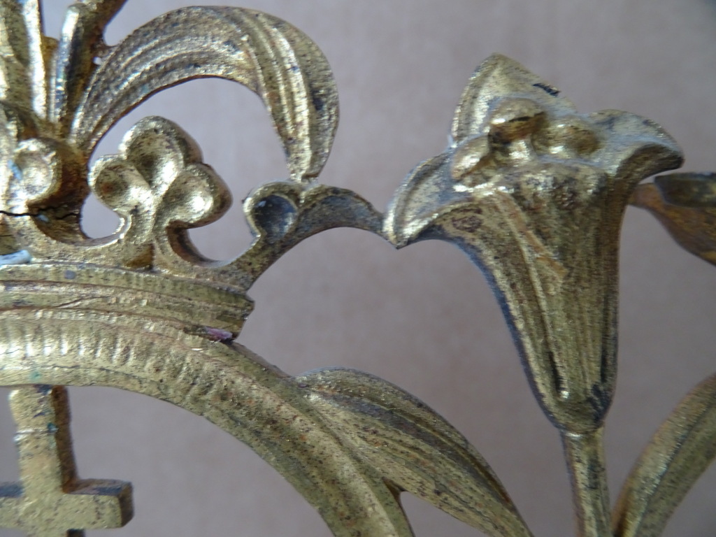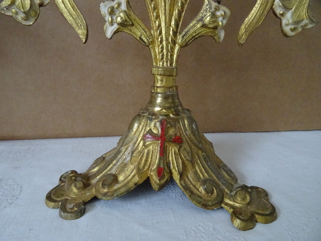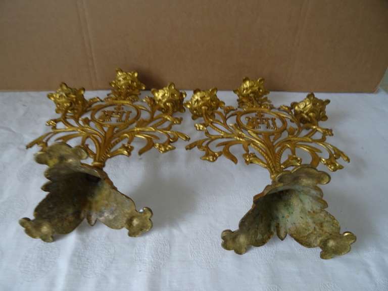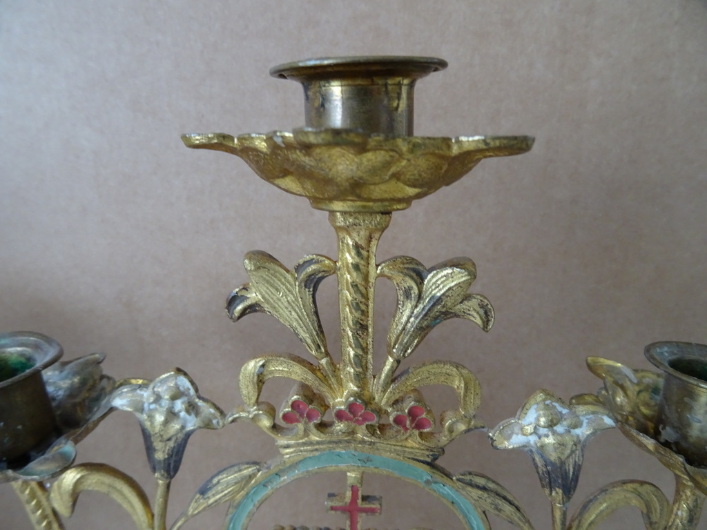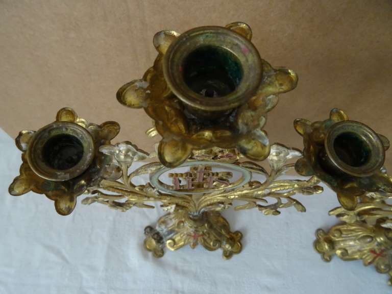 Antieke kandelaars van verguld brons vervaardigd in de periode 1800-1900. Beide met prachtig gedecoreerd met lelietakken en opschrift IHS, dit betekent de Heilige Naam van Jezus. De fraaie kandelaars zijn in een prachtige gebruikte staat, hier en daar wat scheef, zie foto’s. Afmetingen per stuk; circa 23.5 bij 12.5 bij 34 cm.