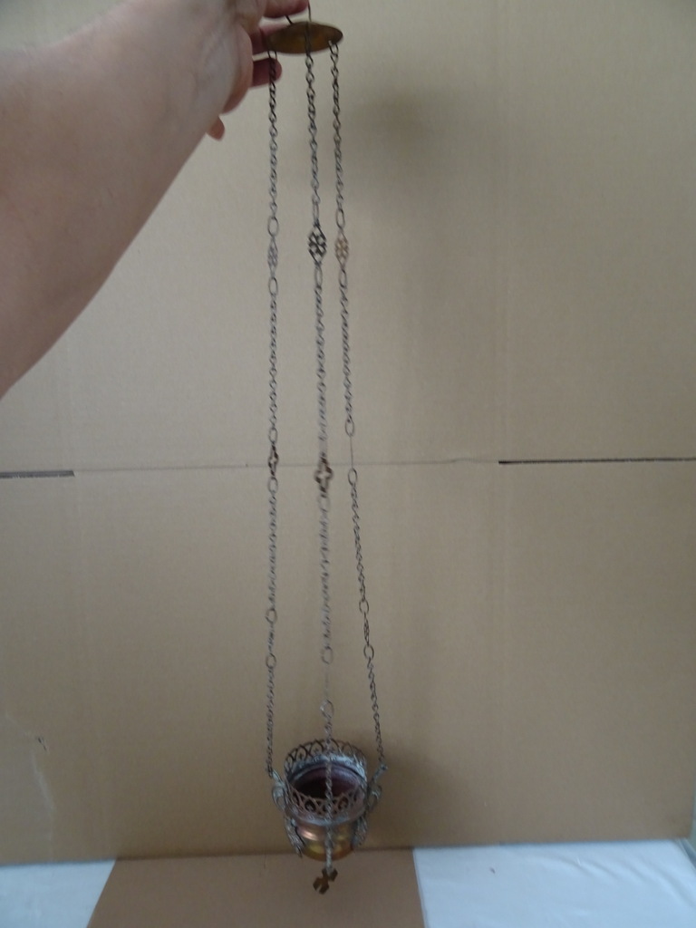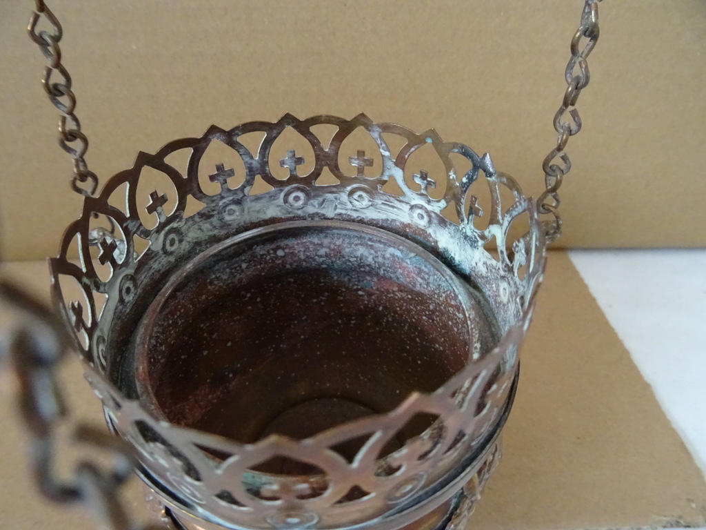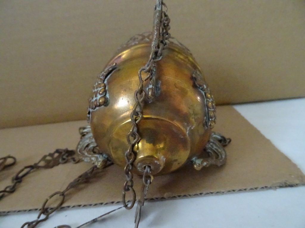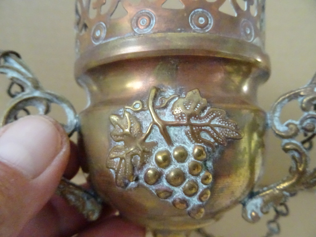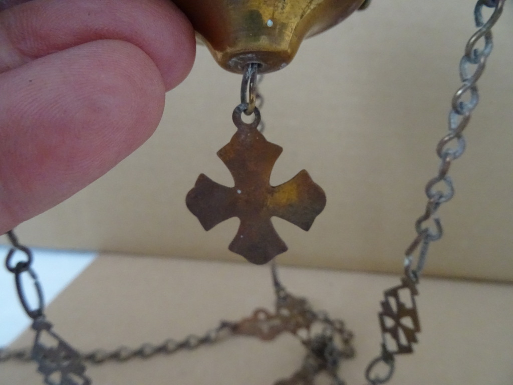 Antiek koperen wierookvat kerk 75cm vervaardigd rond 1850. Prachtig gedecoreerd met kruisjes en trossen druiven. Het stuk is afkomstig uit een oude familiecollectie. Afmetingen vat (zonder kettingen); circa 11 bij 11 bij 9,5 cm. Hoogte inclusief kettingen; circa 75 cm. Het wierookvat is in een schitterende gebruikte staat, alleen de bovenste rand heeft wat minuscule deukjes, zie foto’s. Voor de liefhebber is er nog een vergelijkbaar exemplaar te bekijken in de webshop.