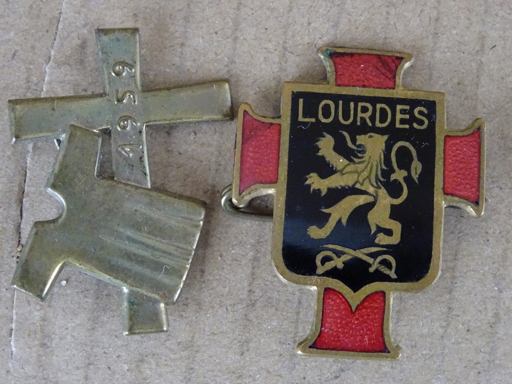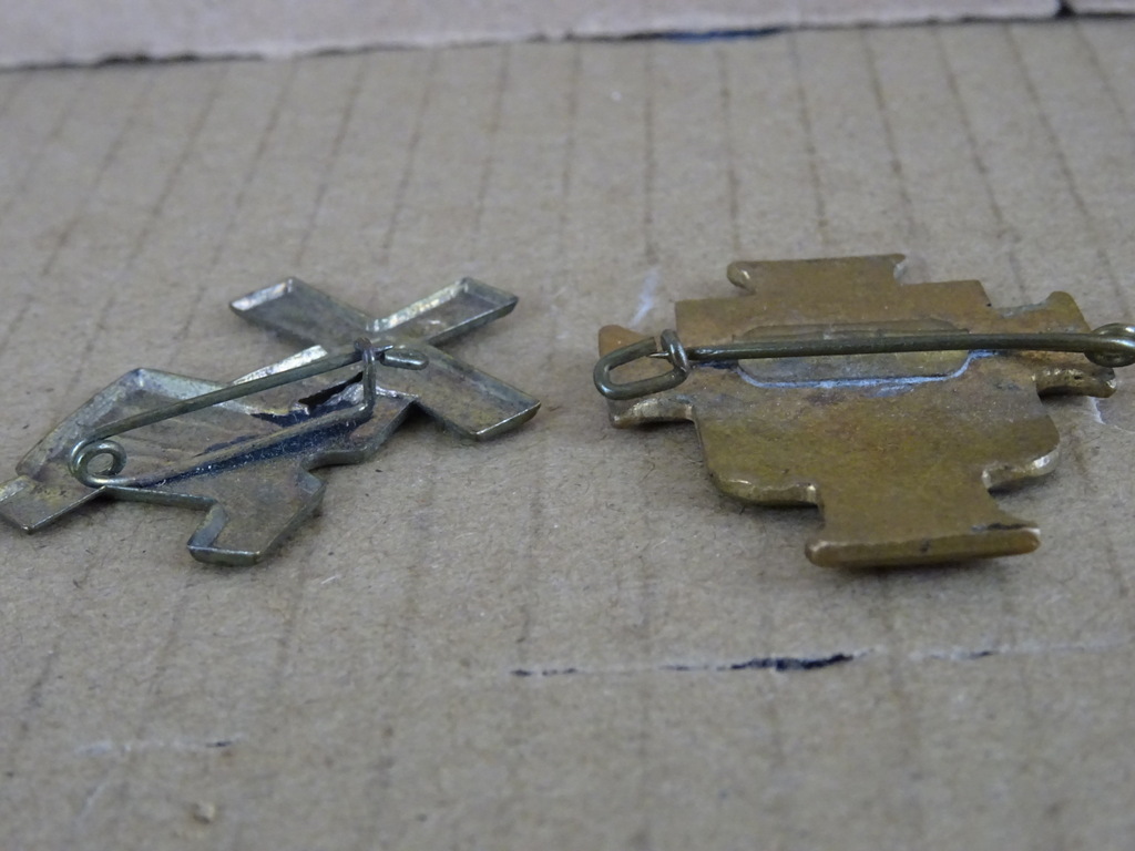 Antieke religieuze speldbroches vervaardigd rond 1950-1960. Beide speldbroches zijn in zeer goede gebruikte staat. Afmetingen; circa 3.3 bij 4 bij 0.3 cm.