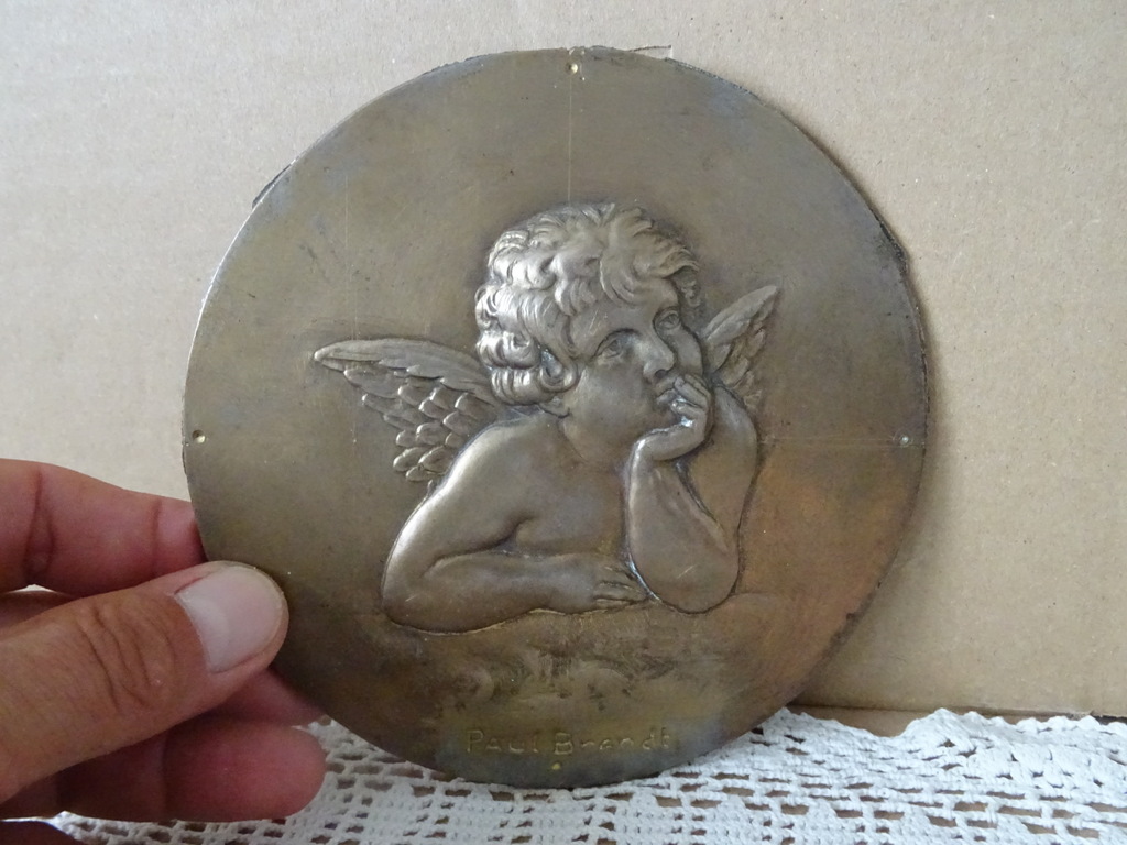 Antiek bronzen reliëf Paul Brandt met cherubijn 14cm vervaardigd rond 1910 of later. Het stuk is in een schitterende gebruikte staat, zie foto’s. Gesigneerd; Paul Brandt. Dit is in ieder geval de signatuur van de bekende Zwitsers-Franse kunstenaar Paul Brandt (1883-1952). Hij speelde een voorname rol in de wederopleving van moderne sieraden en decoratieve kunst in de jaren 20, vooral in Art Nouveau Art Deco stijl. Online vind ik vergelijkbare reliëfs maar geen enkele met een signatuur van Paul Brandt. Wel zijn er religieuze medaillons te vinden met zijn naam erop, zie laatste foto.