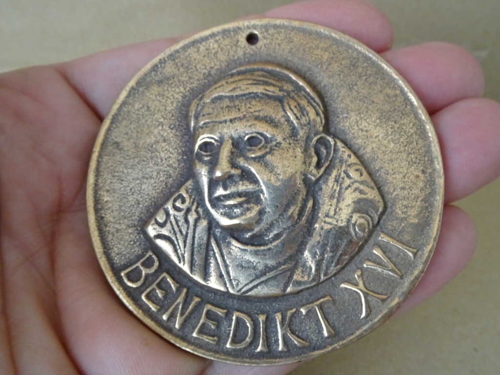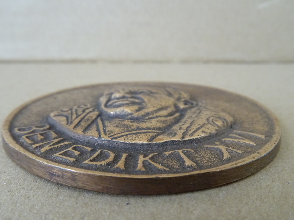 Bronzen penning paus Benedictus XVI met opschrift Benedikt XVI vervaardigd rond 2005 of later. Doorsnede 7 cm. Haast als nieuw, zie foto’s.
