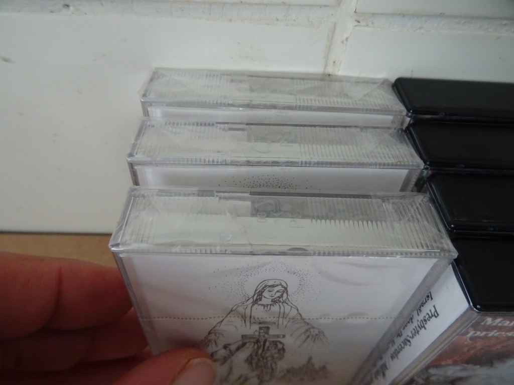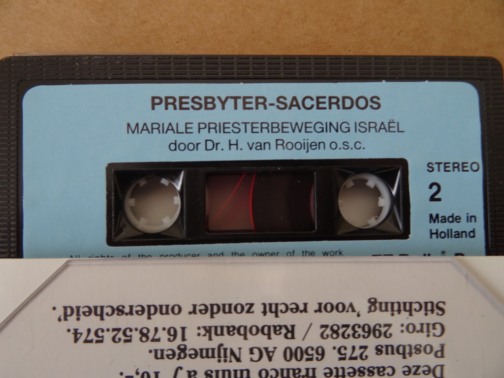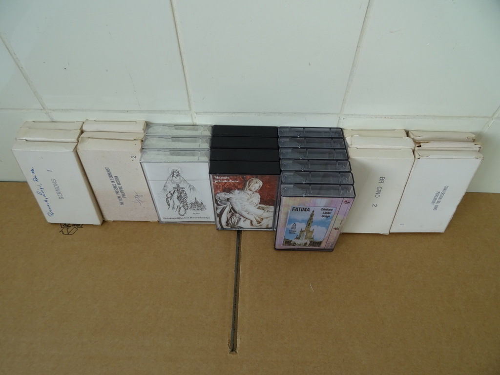 Collectie 25 religieuze cassettebandjes vervaardigd rond 1970 of iets later. Afkomstig uit de collectie van een pastoor op leeftijd. 3xBid dagelijks het rozenhoedje (verzegeld), 4x Mariale priesterbeweging Israël, 6x Fatima liederen, 3x Philippine mission, 3x Sermons, 3x Br. Gino nummer 1 en 3x Br. Gino nummer 2. Alle kartonnen doosjes in goede gebruikte staat, bandjes nog goed. Alle kunsttof doosjes in goede staat, haast als nieuw of nieuw.