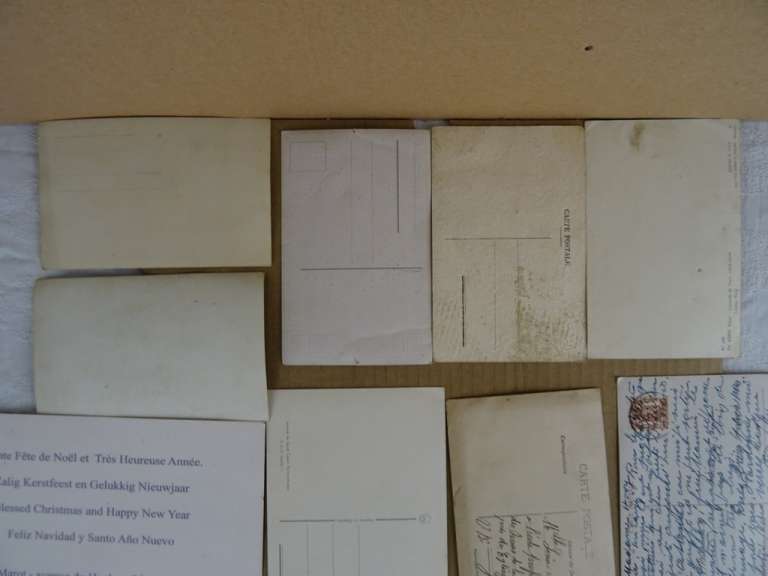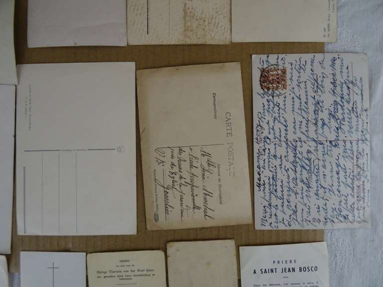 Collectie antieke religieuze kaarten en prentjes vervaardigd rond 1950. De grootste kaart is wat minder oud dan de rest van de collectie. Deze kaart is van 1970 of later. De collectie bestaat uit 9 kaarten en 5 prentjes. Kleinste prentje; 5.8 bij 10.2 cm. Grootste kaart; 15 bij 21 cm. Het geheel is in goede gebruikte staat, zie foto’s.