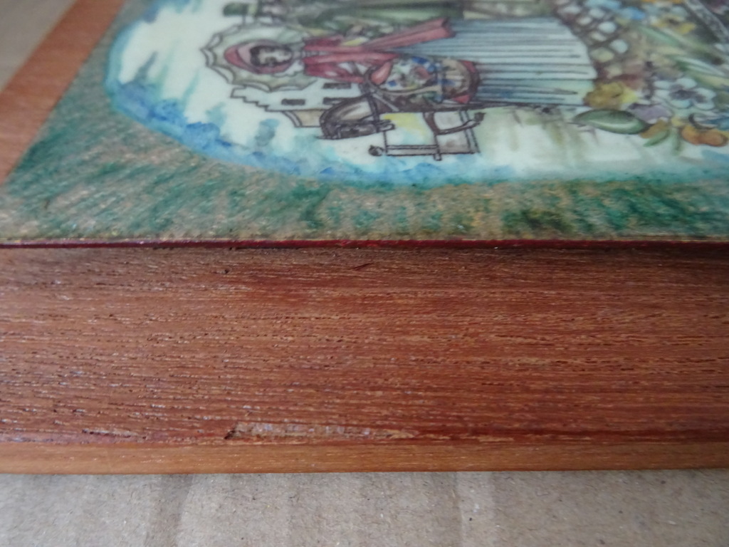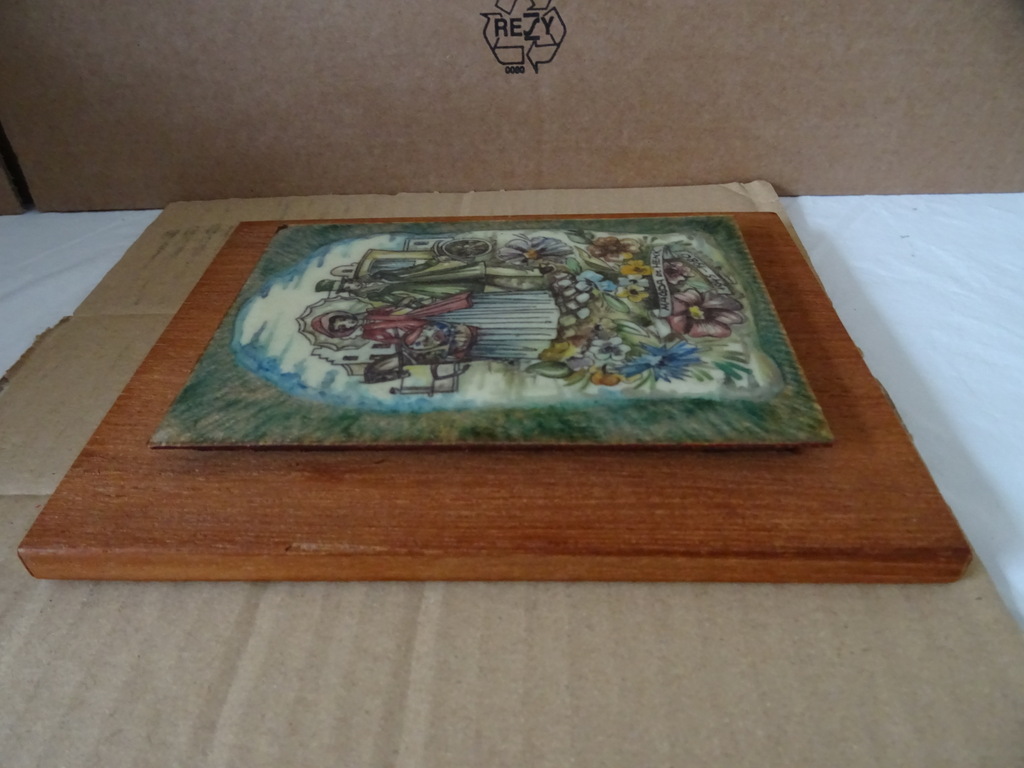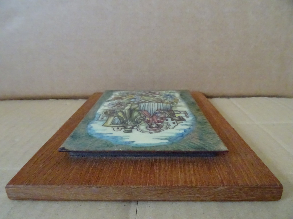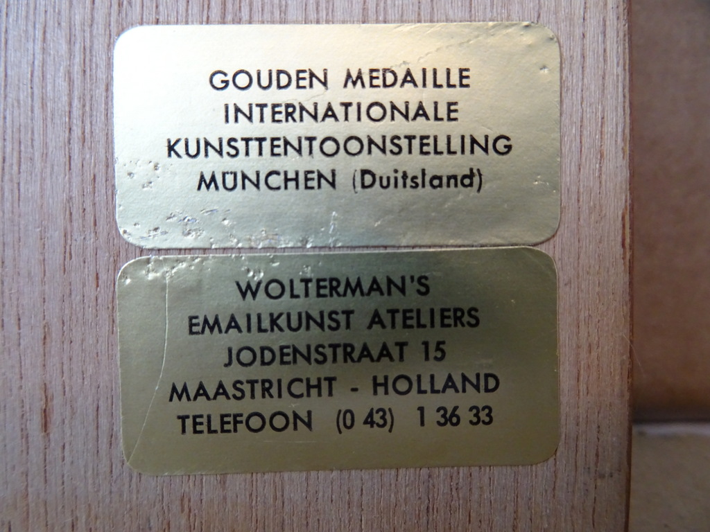 Emaille paneel Wolterman’s Maastricht vervaardigd in 1980 ter ere van een koppel dat 35 jaar getrouwd was. Op het prachtige koperen paneel is een bruidspaar afgebeeld. De maker heeft het werk niet gesigneerd. Het paneeltje is bevestigd aan een houten paneel van circa 14.3 bij 18.3 bij 1 cm. Het geheel is in een prachtige gebruikte staat. Aan de achterkant is een stickertje zichtbaar; Wolterman’s Emailkunst ateliers Maastricht Holland Handwerk. Het befaamde Wolterman’s Emailkunst ateliers is opgericht door de heer Wolterman. Zijn liefde voor de kunst bracht hem ertoe de Kunstgewerbeschule in Aken te volgen. Hier leerde hij het vak van kunstkoperdrijver.
