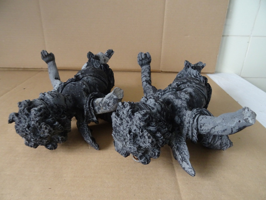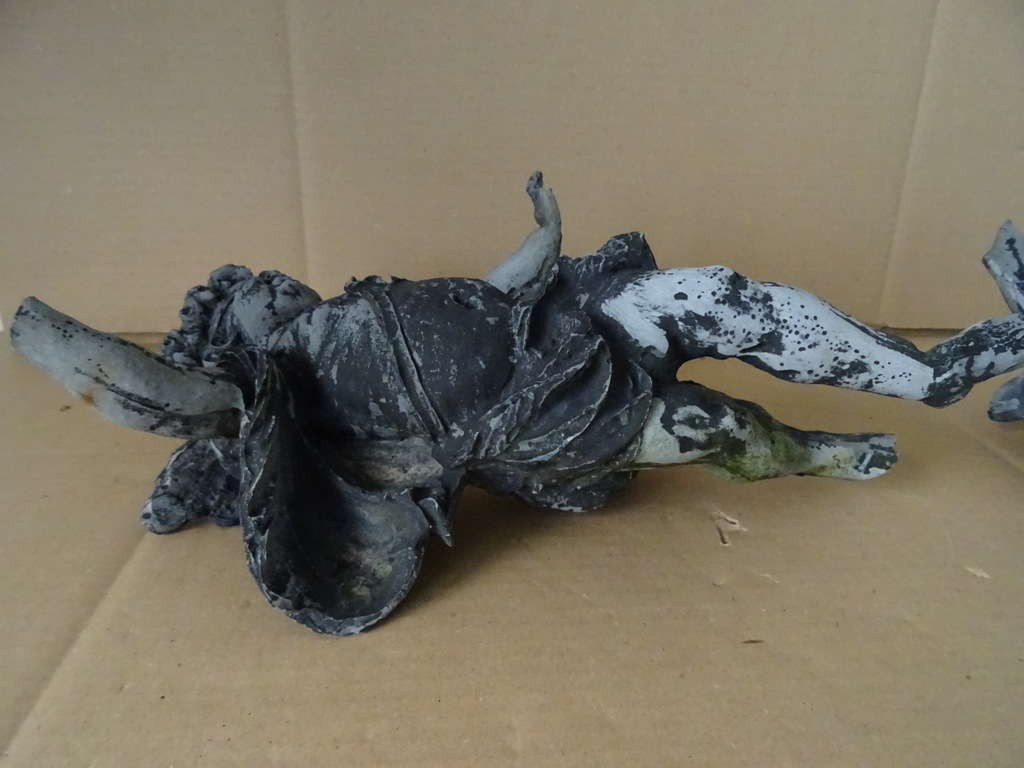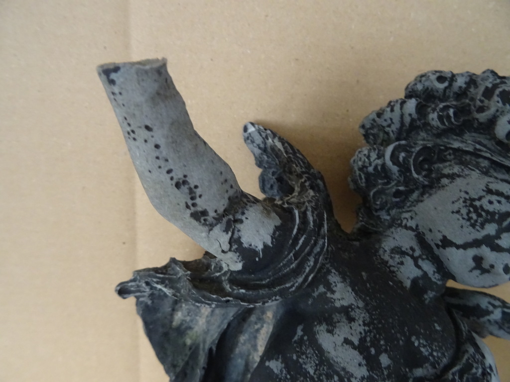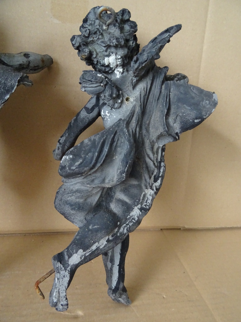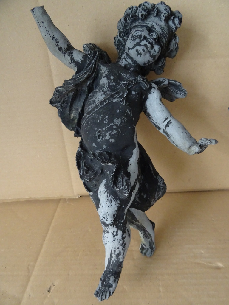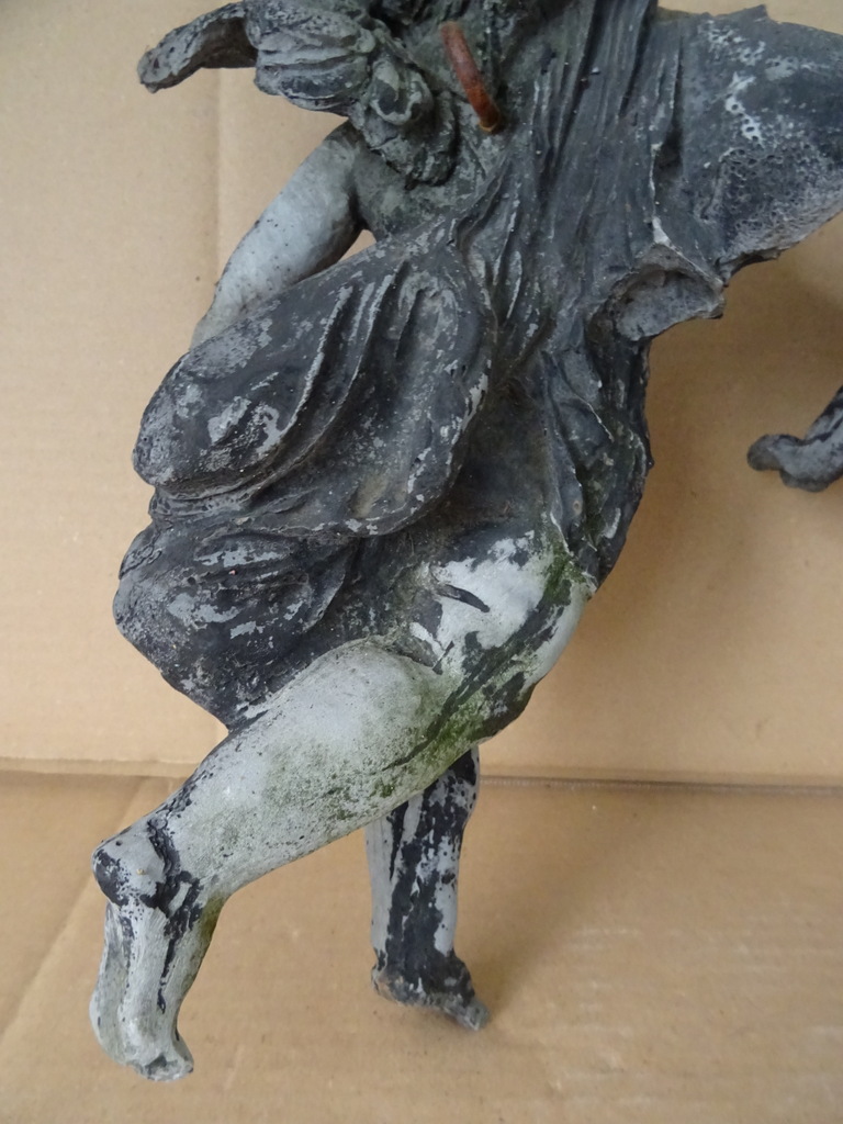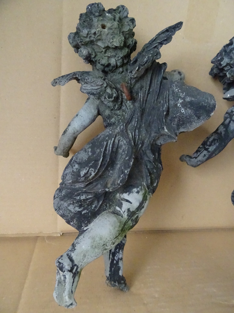 Engelen beelden 36 cm vervaardigd rond 1950 of wat later. Een koppel fraaie robuuste engelen gegoten uit een soort steengruis. Antieke of vintage tuindecoratie. Beide in een schitterende gebruikte, wat verweerde staat. De engelen missen allebei hun rechterhand, één engel mist een stukje vleugel, zie foto’s. Prachtige stukken om te hangen of leggen in een tuin of in huis.
