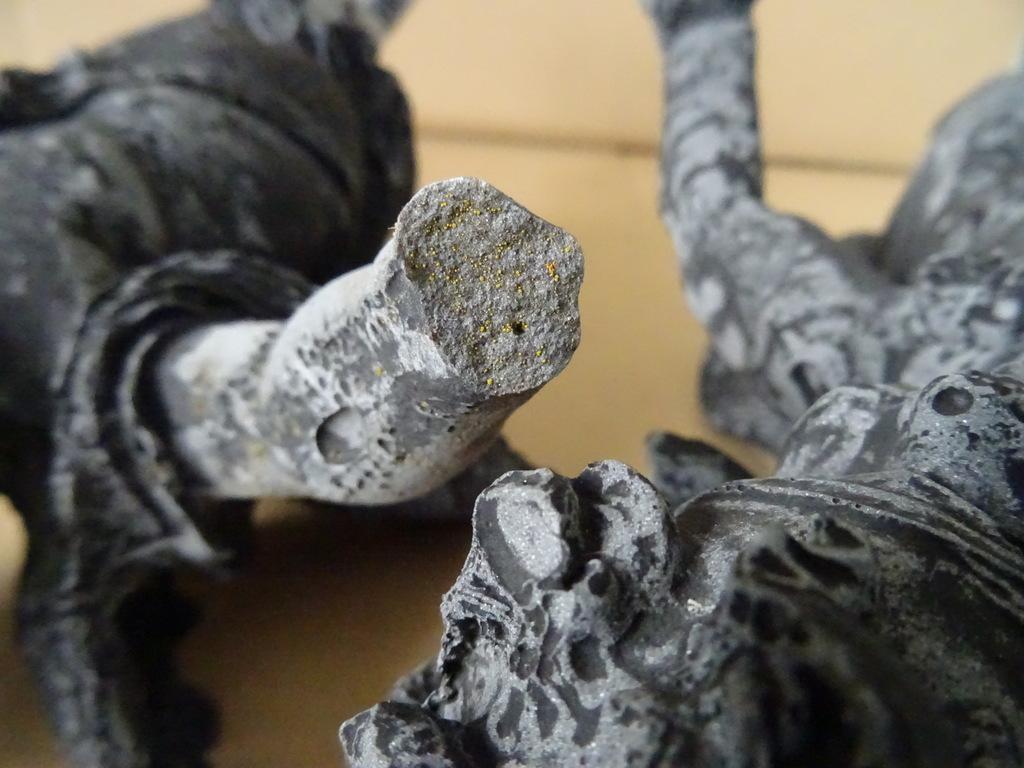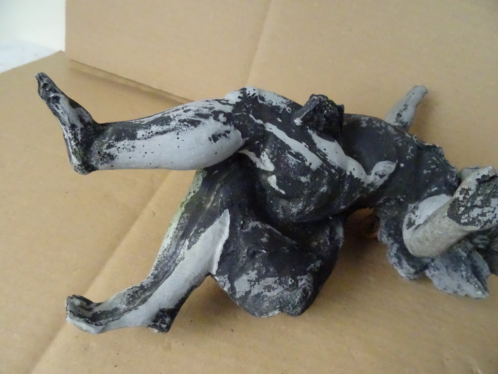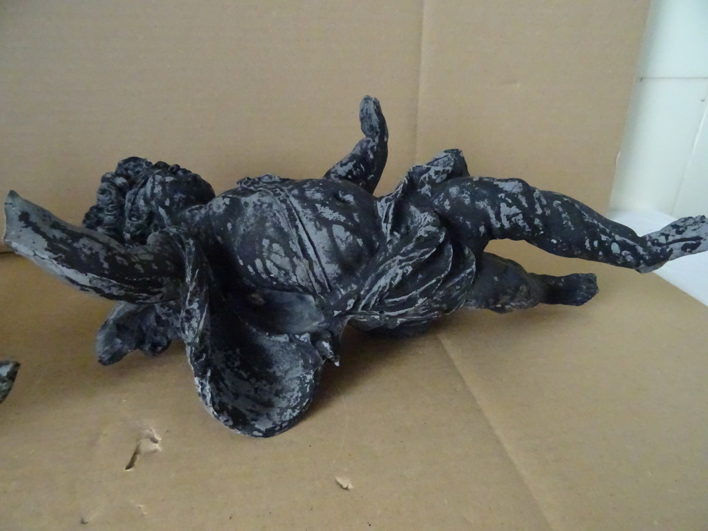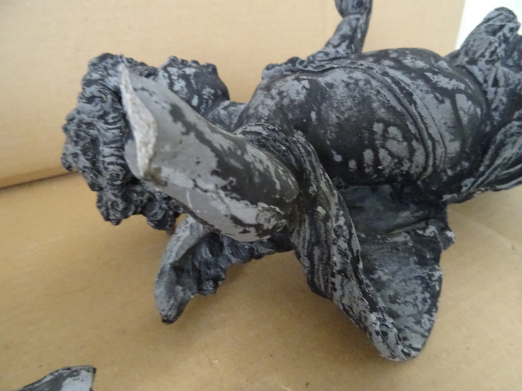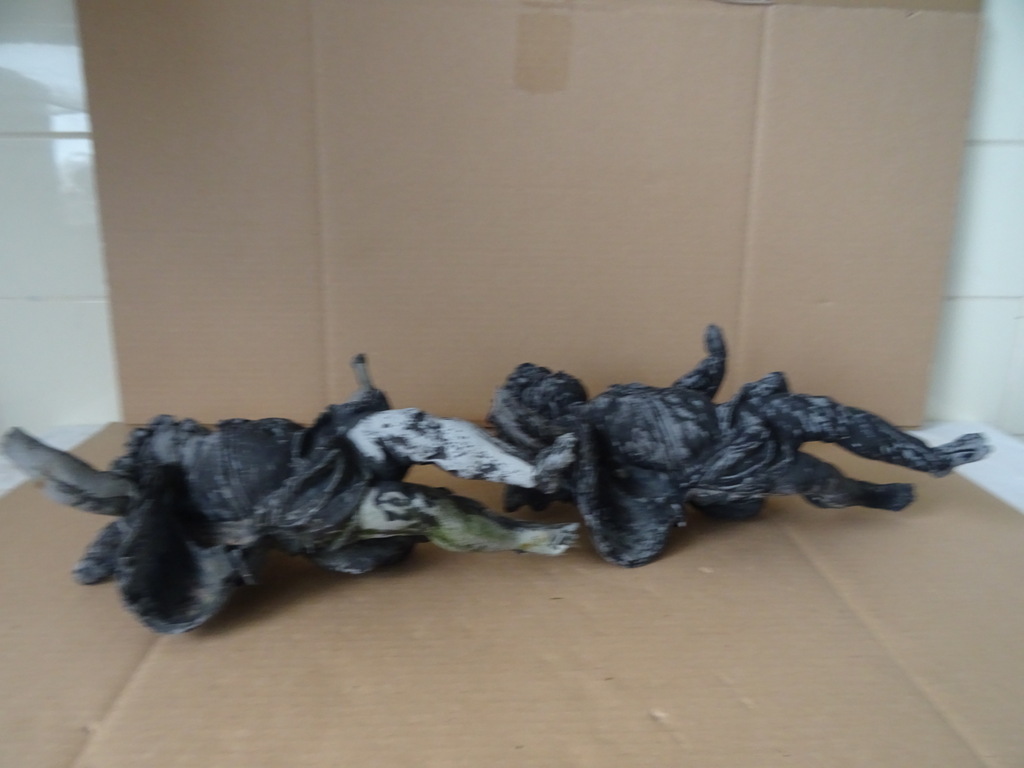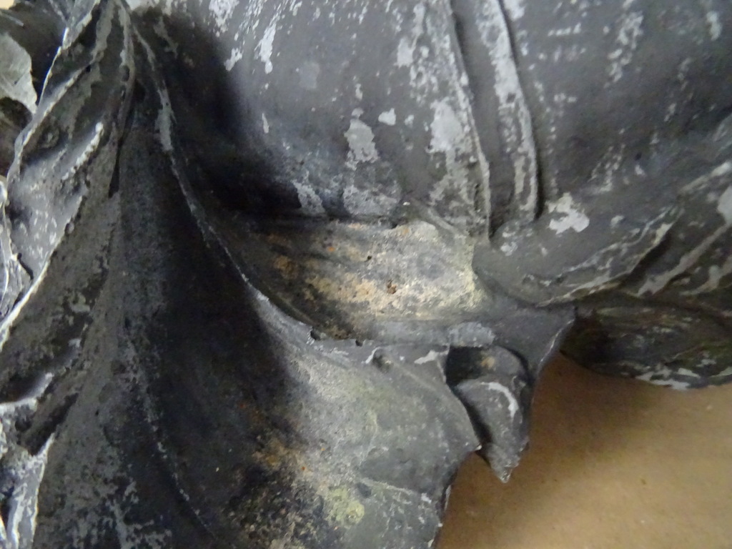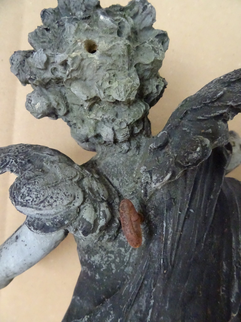Engelen beelden 36 cm vervaardigd rond 1950 of wat later. Een koppel fraaie robuuste engelen gegoten uit een soort steengruis. Antieke of vintage tuindecoratie. Beide in een schitterende gebruikte, wat verweerde staat. De engelen missen allebei hun rechterhand, één engel mist een stukje vleugel, zie foto’s. Prachtige stukken om te hangen of leggen in een tuin of in huis.