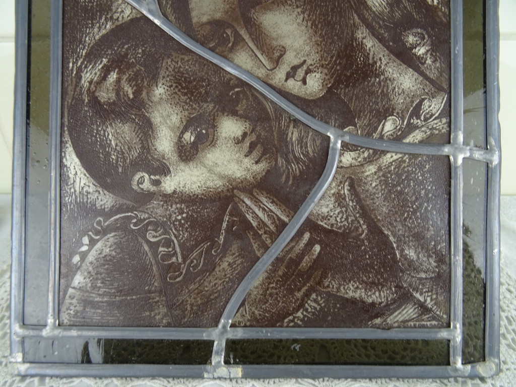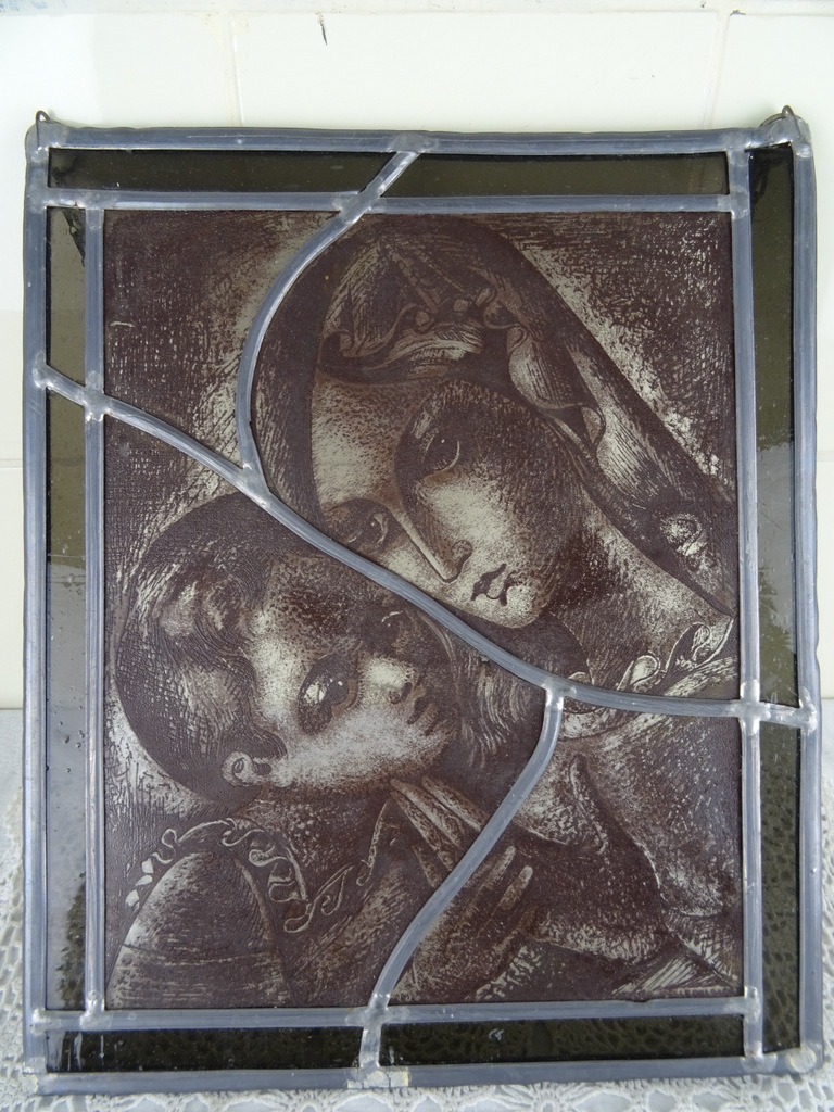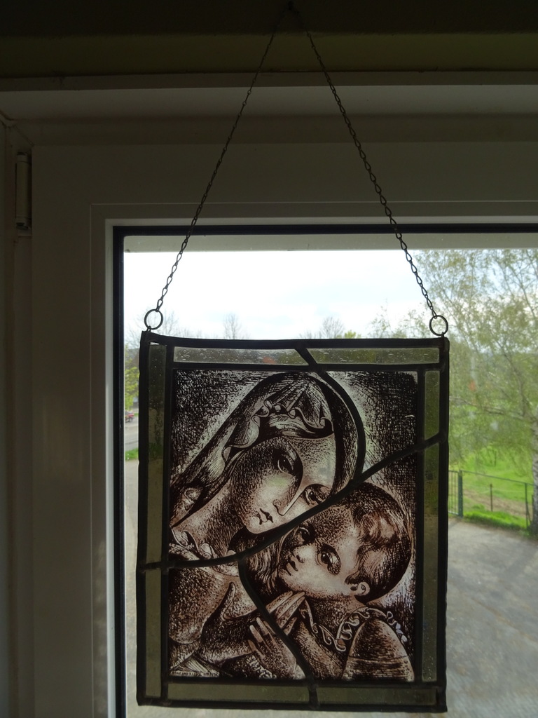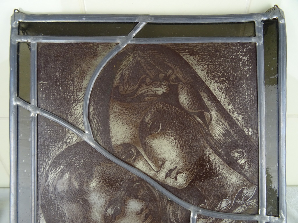 Gebrandschilderd glas in lood Heilige Maria vervaardigd in de vorige eeuw of in deze. Op het prachtige glas in lood is de heilige Maria gesluierd afgebeeld terwijl ze het kindje Jezus toont. Maria en Jezus houden hun gezichten tegen elkaar en ook houden ze elkaars hand vast. De echte schoonheid van het glas in lood wordt zichtbaar zodra het voor het raam hangt. Dit is zichtbaar op foto 1 tot en met 7. Rechtsonder is een signatuur zichtbaar; Atelier Joelle D’Alsace. Dit befaamde atlier bestaat nog steeds, het is gevestigd in Lanaken. Het stuk is nog in goede staat, puntgaaf. Speciale afhaalprijs 45 euro. De lengte inclusief ketting is circa 57 cm. Het glas in lood is puntgaaf.