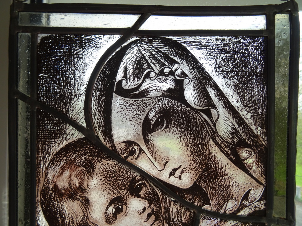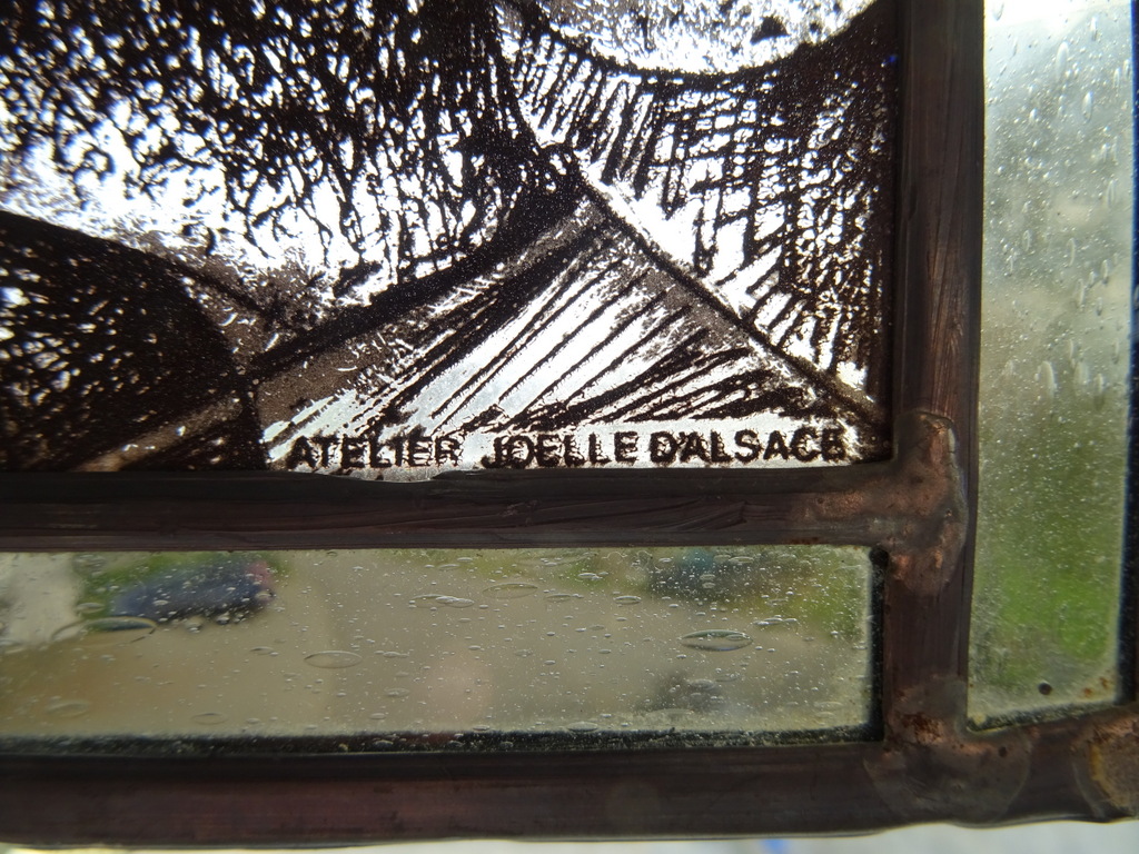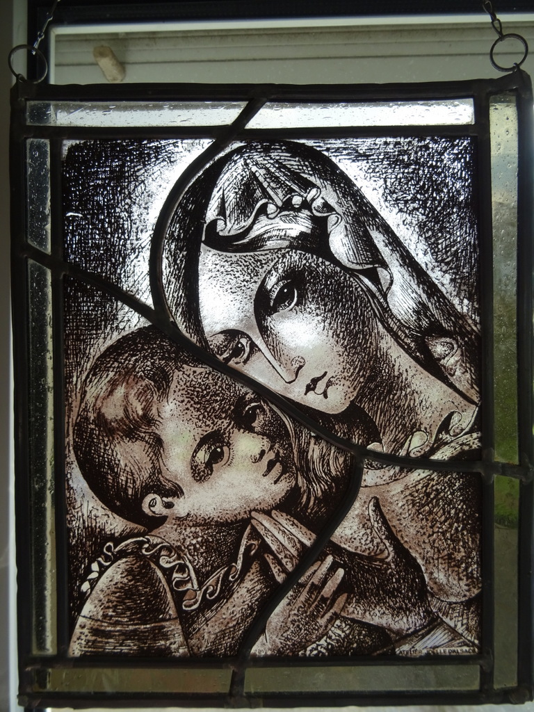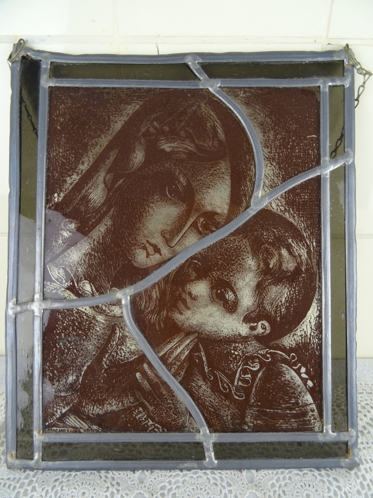 Gebrandschilderd glas in lood Heilige Maria vervaardigd in de vorige eeuw of in deze. Op het prachtige glas in lood is de heilige Maria gesluierd afgebeeld terwijl ze het kindje Jezus toont. Maria en Jezus houden hun gezichten tegen elkaar en ook houden ze elkaars hand vast. De echte schoonheid van het glas in lood wordt zichtbaar zodra het voor het raam hangt. Dit is zichtbaar op foto 1 tot en met 7. Rechtsonder is een signatuur zichtbaar; Atelier Joelle D’Alsace. Dit befaamde atlier bestaat nog steeds, het is gevestigd in Lanaken. Het stuk is nog in goede staat, puntgaaf. Speciale afhaalprijs 45 euro. De lengte inclusief ketting is circa 57 cm. Het glas in lood is puntgaaf.