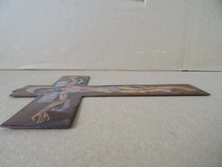 Geëmailleerd koperen kruisbeeld icoon 19cm vervaardigd rond 1950 of later. Het imponerende kruisbeeld is in een prachtige gebruikte staat, zie foto’s. Het is met de hand gemaakt, een mooi staaltje vakmanschap. Gesigneerd; lijkt op WH. Afkomstig uit een collectie religieuze objecten die al die tijd in een vitrinekast was uitgestald.