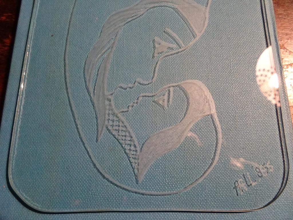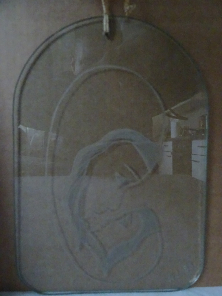 Glasgravure Madonna met kind vervaardigd in 1985. De afbeelding is op prachtige wijze gegraveerd in het glas. Gesigneerd A.L. ’85. In een schitterende gebruikte staat, puntgaaf.