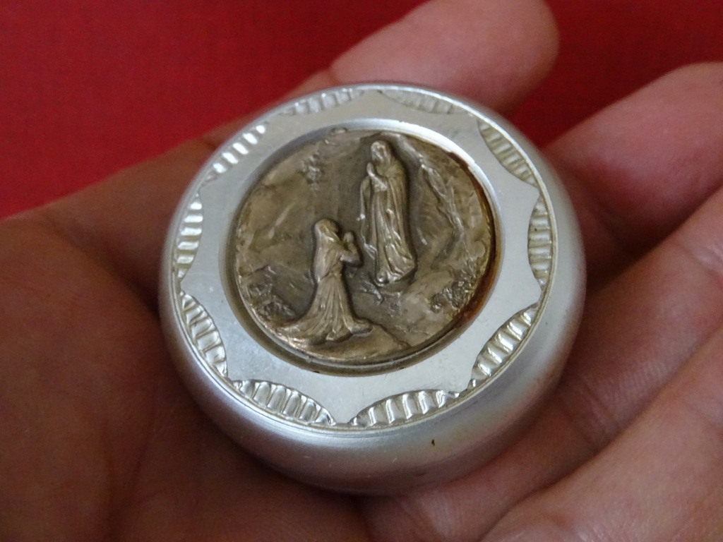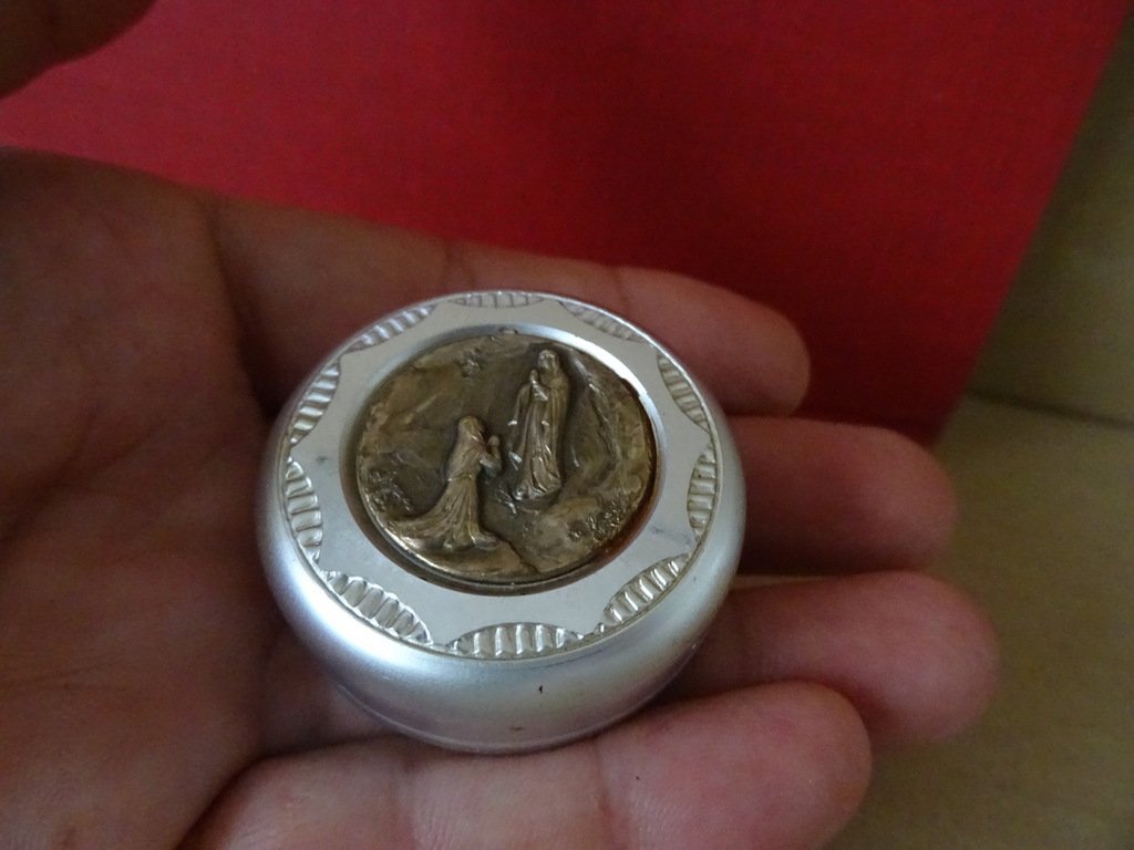 Hostiedoosje Heilige Maria en Bernadette met hostie en as vervaardigd rond 1970 of later. In nog vrij goede staat, zie foto’s. Herkomst onbekend.