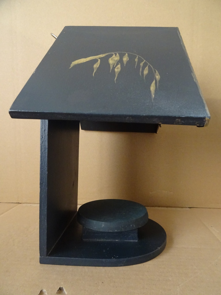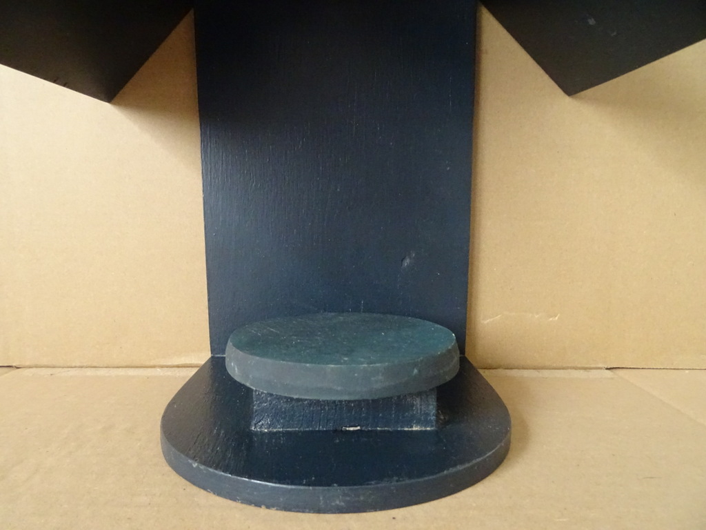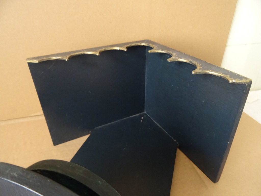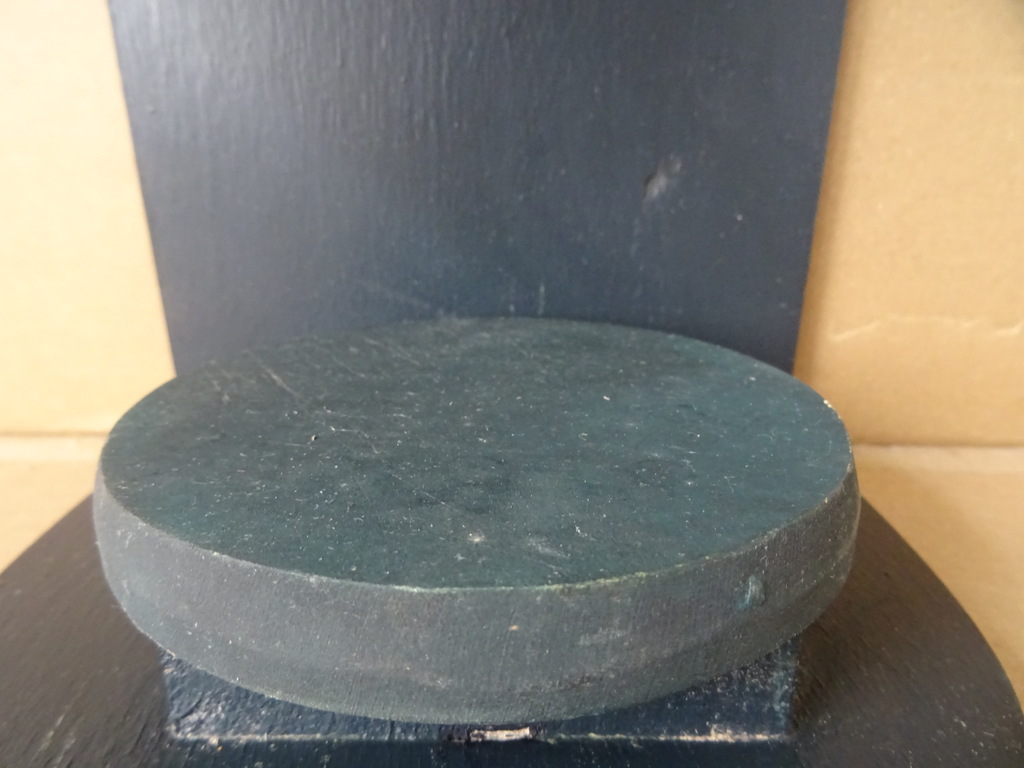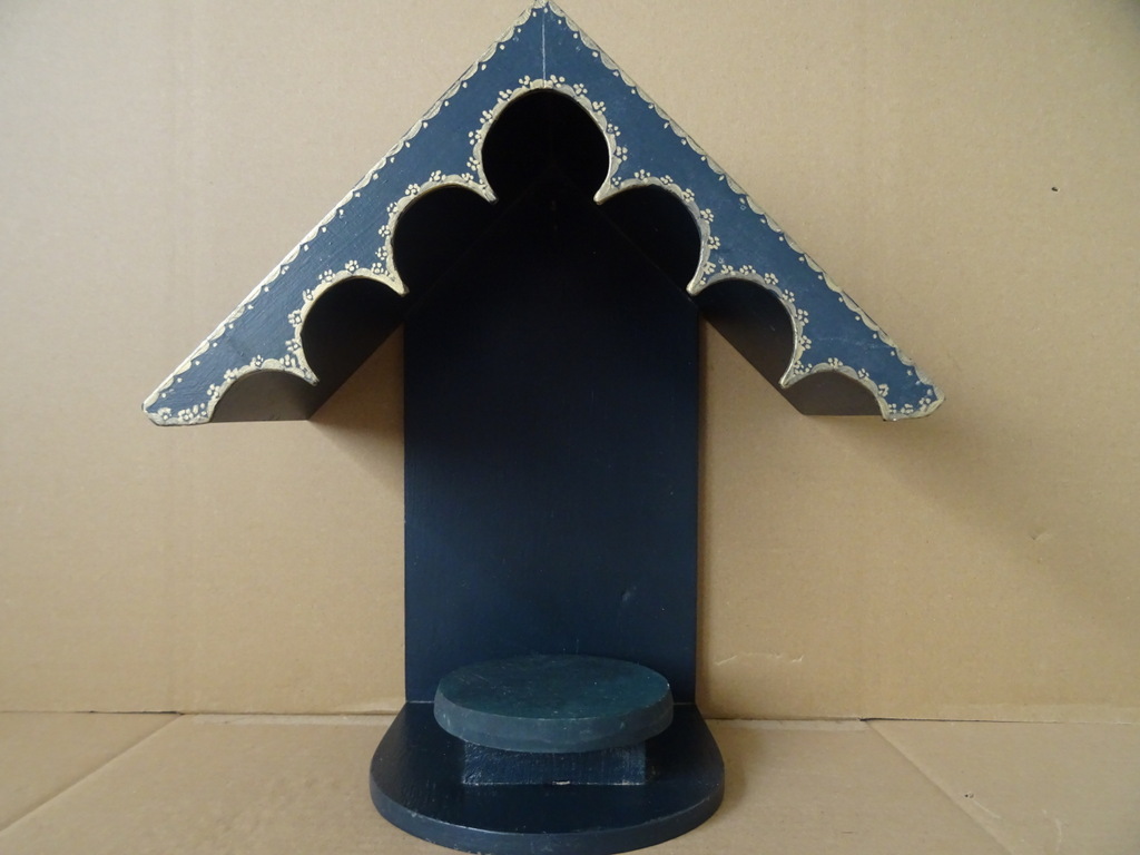 Houten kapelletje 33cm console voor beeld volkskunst vervaardigd aan het eind van de vorige eeuw of in deze eeuw. Speciaal gemaakt voor een antiek beeld dat helaas gesneuveld is. De voet van het beeld paste met de rand precies over de ronde voet in het kapelletje. Deze ronde voet is er later aan toegevoegd (gelijmd). Er is nu plek voor een beeld met een hoogte tot circa 24 cm. Doorsnede ronde houten voet; circa 11,5 cm. Op de laatste 2 foto’s heb ik een Mariabeeld van 24 cm en een Piëtabeeld van 18cm (15 breed) erin gezet. Deze zijn los te bestellen. Het dak van het kapelletje is aan een kant gedecoreerd met een palmtakje. Het stuk is in een prachtige gebruikte staat, nog zeer solide. Het kan zowel staan als hangen.