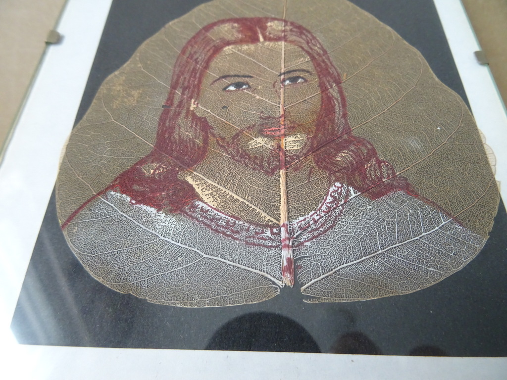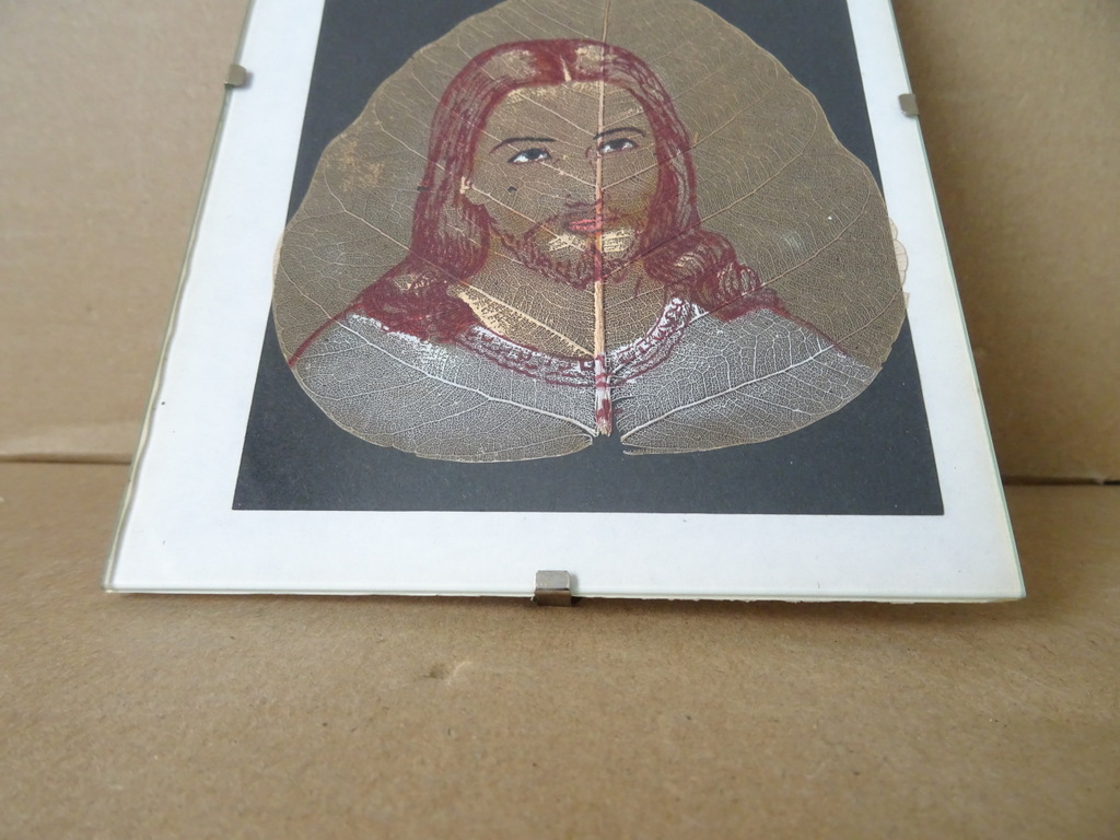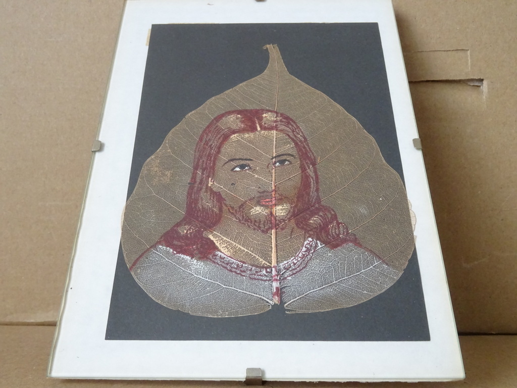 Jezus Christus geschilderd op boomblad 13x18cm vervaardigd rond 1980 of later. Een fenomenale afbeelding van Jezus geschilderd op een blad van een boom. Ingelijst in een lijstje met glas van circa 13 bij 18 cm. Het geheel is in een prachtige gebruikte staat, zie foto’s. Het glas is nog puntgaaf. Afkomstig uit een collectie religieuze objecten die al die tijd in een vitrinekast was uitgestald.