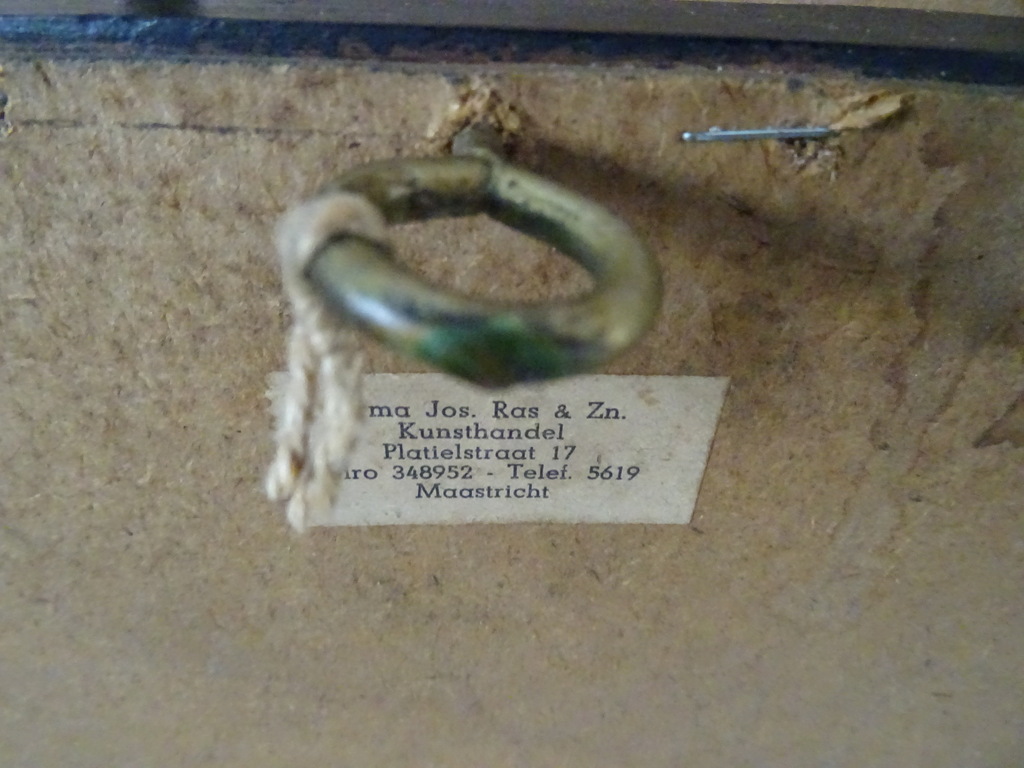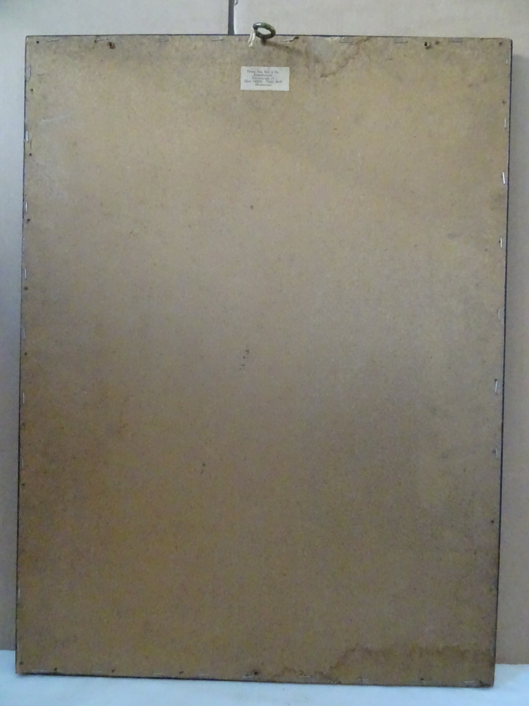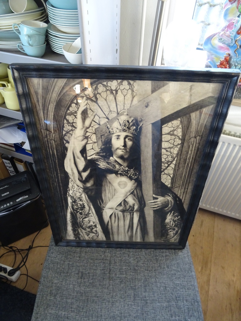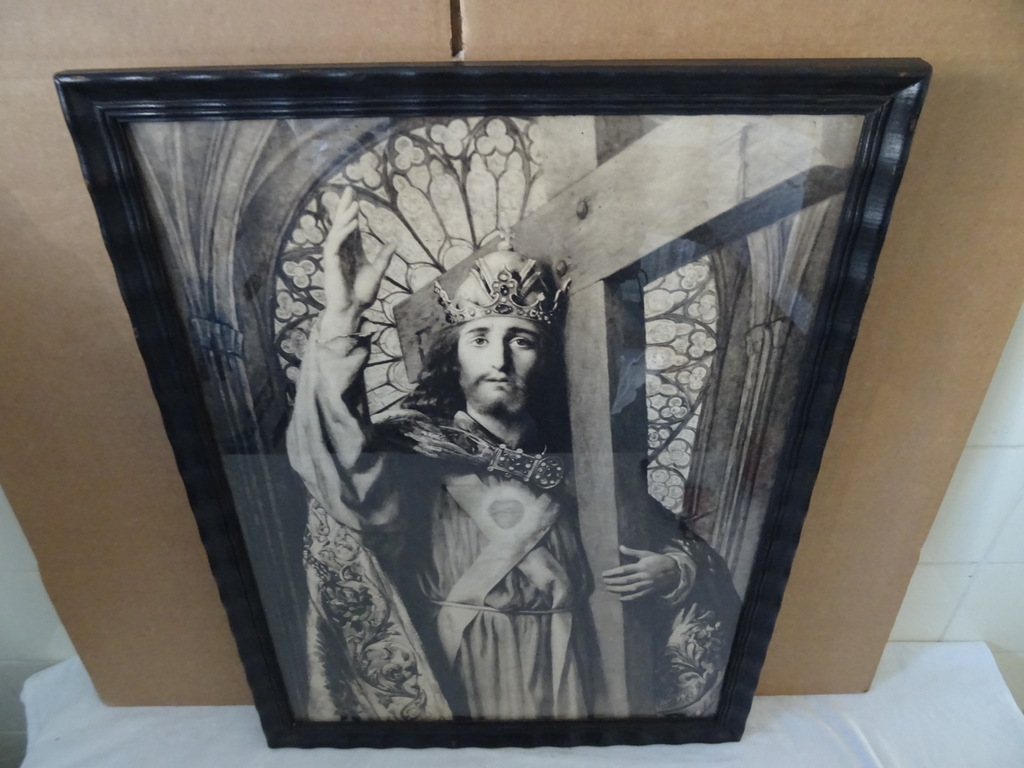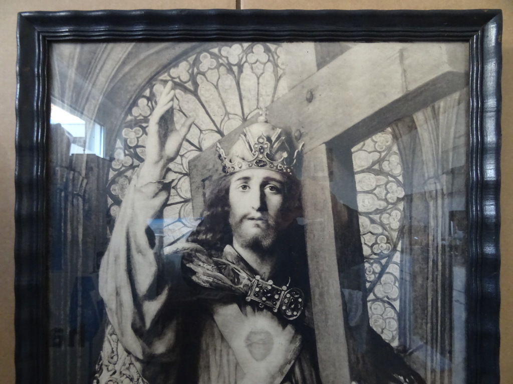 Jezus Christus Koning 47×62 cm vervaardigd rond 1950 of iets eerder. Een indrukwekkende litho of andere gedrukte afbeelding in een fraaie houten lijst met glas. Mogelijk is de afbeelding een foto van een groot beeld of een replica van een bekende oude afbeelding. Te zien is Jezus Christus gekroond als koning, hij draagt het kruis. Het geheel is nog in vrij goede staat. Lijst nog zeer solide, glas nog heel. Afkomstig uit de collectie van een pastoor op leeftijd.