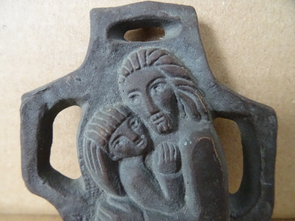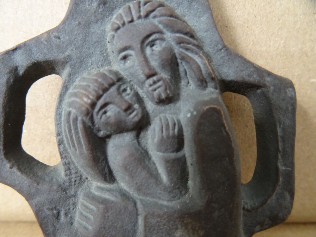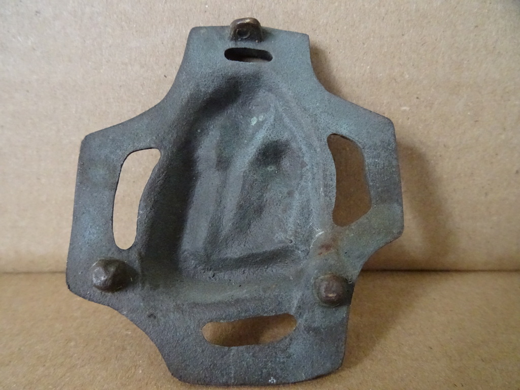 Limburgse kunst amulet Heilige Maria brons of koper vervaardigd rond 1950 of iets later. Dit pronkstuk is een fraai staaltje volkskunst. Afgebeeld is Maria als De Moeder Gods met het Kindje Jezus.