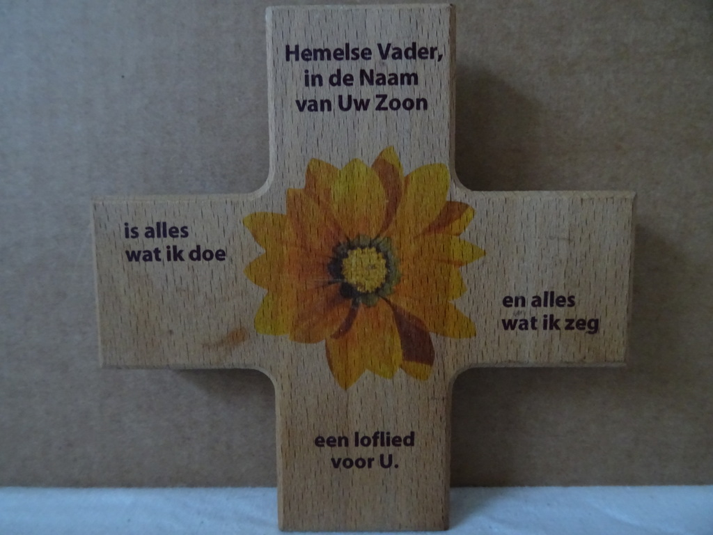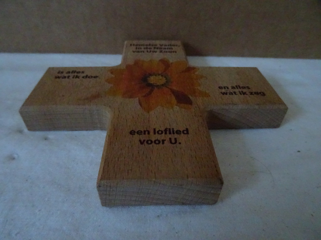 Vintage houten kruis met spreuk Hemelse Vader Alles wat ik doe en alles wat ik zeg een loflied voor u vervaardigd rond 1960 of wat later. In een schitterende gebruikte staat, nog vrij goed, afkomstig uit de collectie van een pastoor op leeftijd.