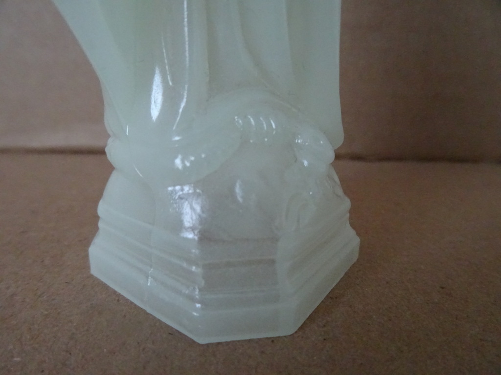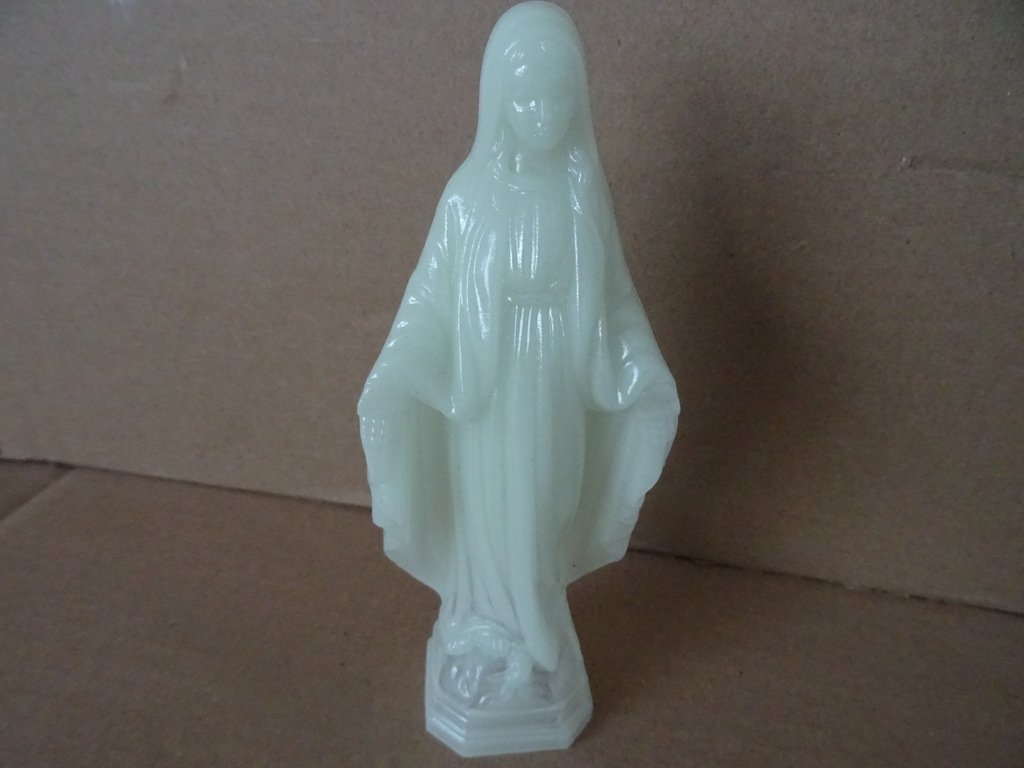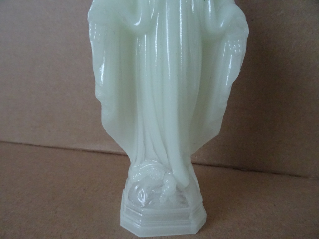 Vintage lichtgevend Mariabeeldje 15cm vervaardigd in China rond 1970 of later. In nog vrij goede staat, puntgaaf. Afgebeeld is de Heilige Maria staand op een verhoging. Ze vertrapt de slang (het kwade).