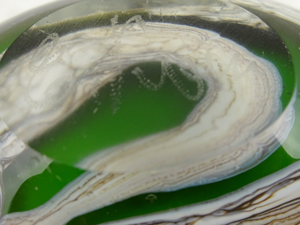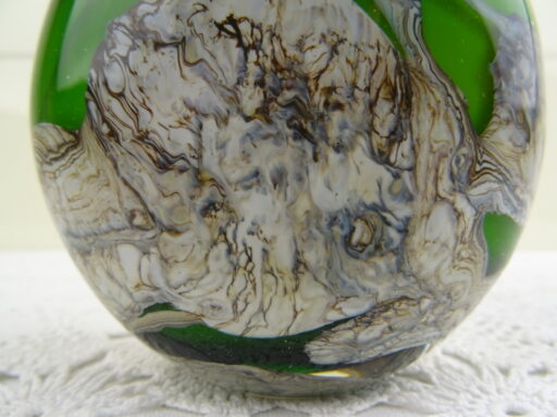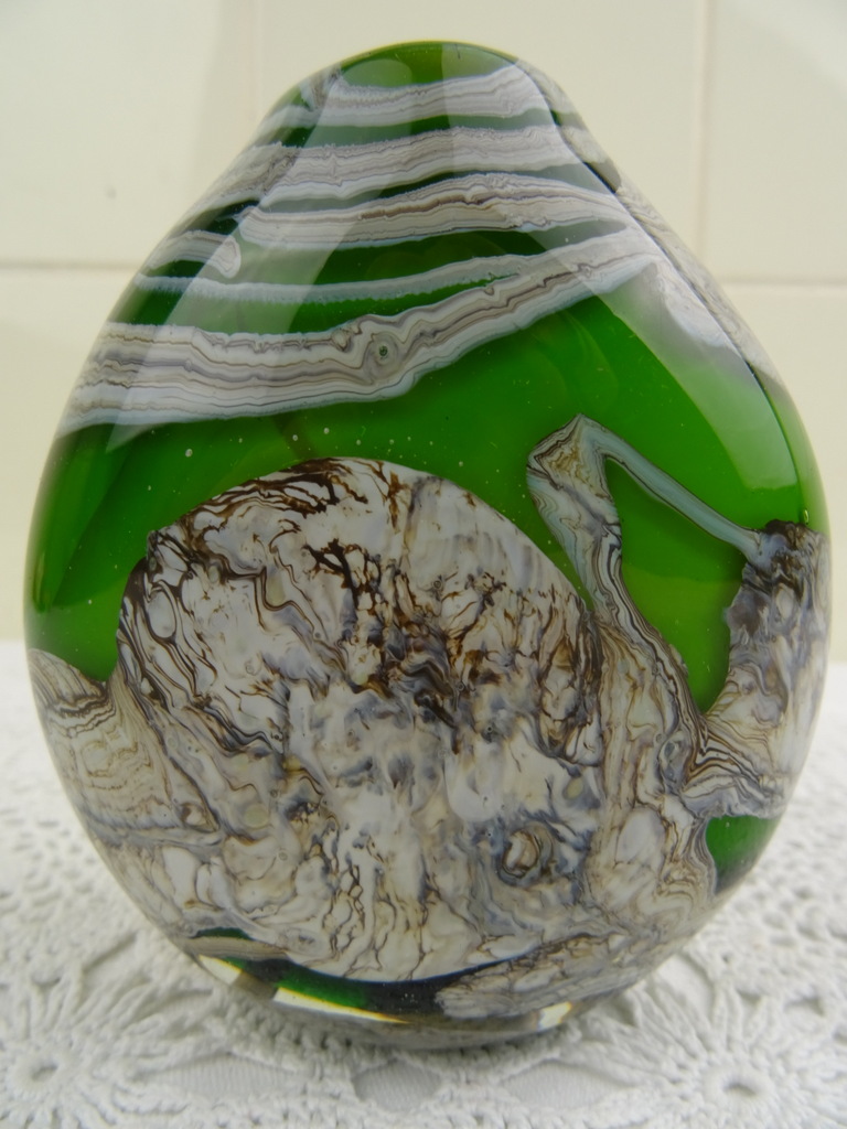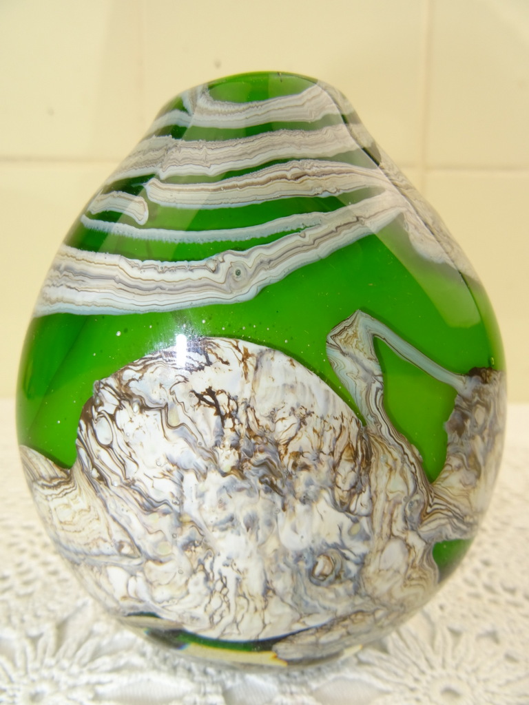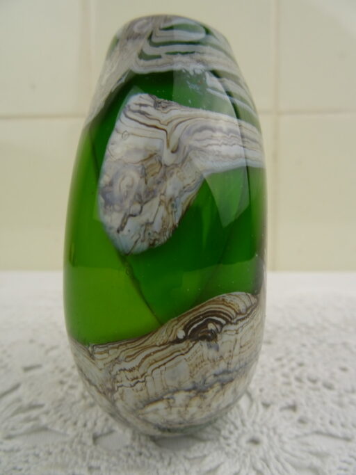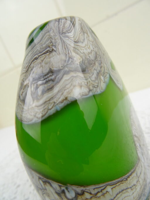Elegante kleine vaas op fraaie wijze vormgegeven en gedecoreerd. De herkomst van de glazen vaas is onbekend, aan de onderzijde is ze gesigneerd. Dit lijkt op E Ruelli of E Ruein of iets dergelijks. Het object is in goede staat, het kan wellicht ook dienen als kandelaar.