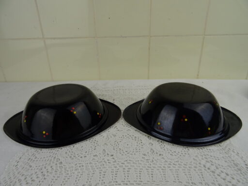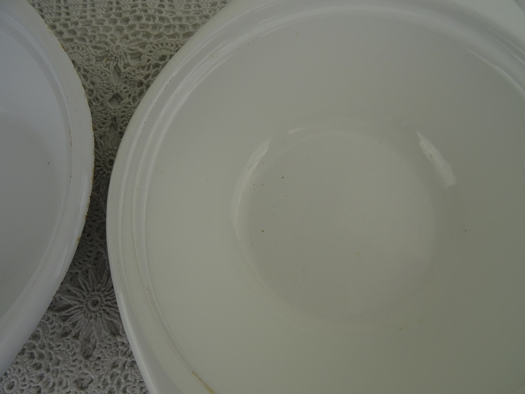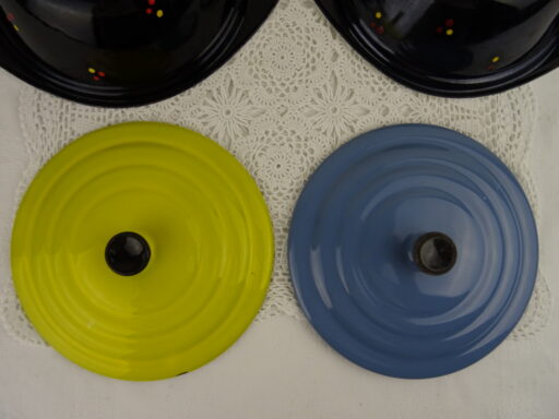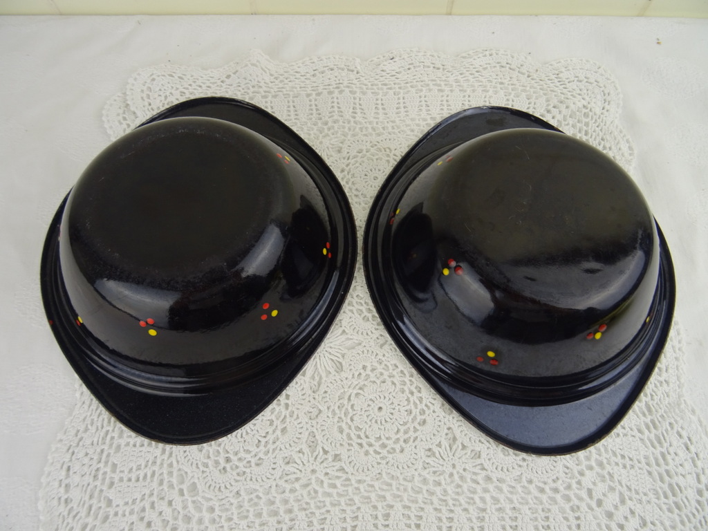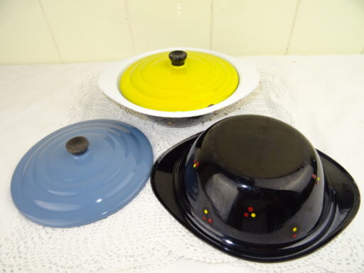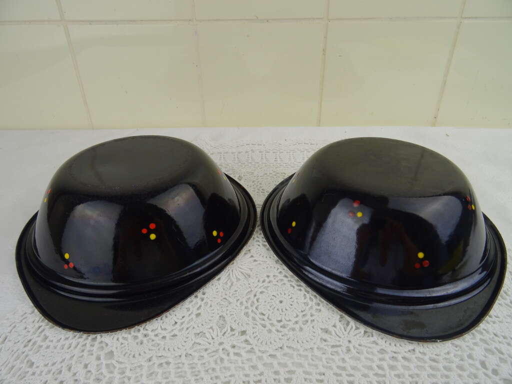 Set antieke emaillen schalen met deksel vervaardigd rond 1950 of iets eerder. In de schalen werd warme pap gedaan, deze bleef dan lang warm! Dit was handig als de pap bijvoorbeeld naar iemand werd gebracht die buiten aan het werk was, zoals een boer. Beide objecten zijn nog in vrij goede staat, zie foto’s. De afmetingen van de schalen zijn 23.4 bij 19.7 bij 6 cm hoog. Met deksel circa 9 cm hoog.