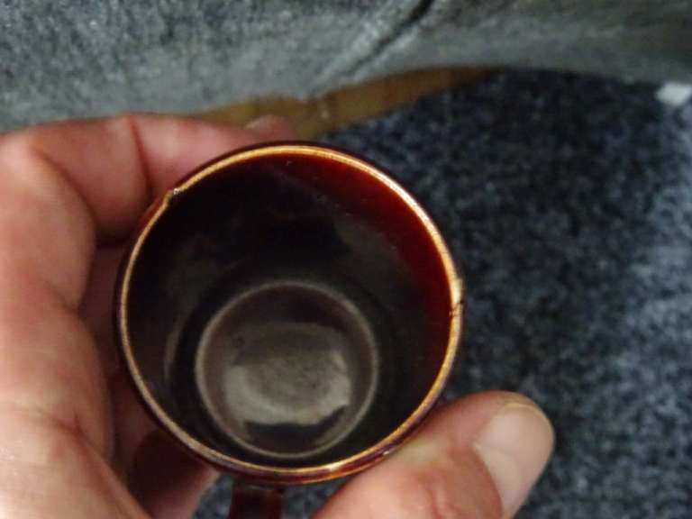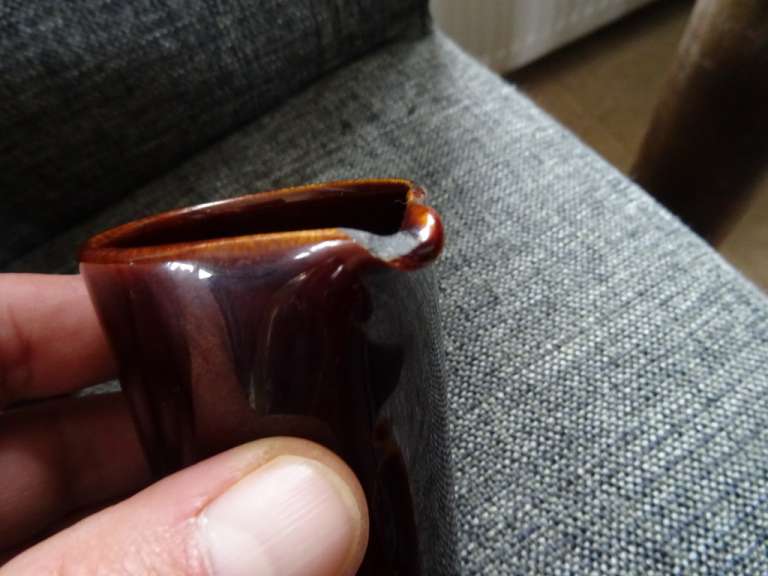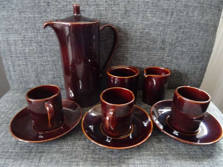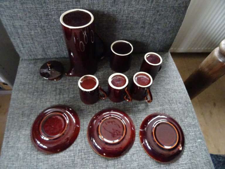 Vintage mokkaset Royal Sphinx P Regout vervaardigd in 1964. Een prachtige aardewerk set genaamd Europa ontworpen door Pierre Daems. Prachtig geglazuurd hoogglans bruin. Serveer in stijl uit deze wel heel erg fraaie mokkaset. In een prachtige gebruikte staat. De deksel van de kan mist een chipje. Wanneer de deksel op de kan ligt is het niet te zien. De tuit van de melkkan mist ook een chipje, zie foto’s. De drie kop en schotels zijn puntgaaf. Alle kopjes hebben slechts een afwijkend plekje in de rand. Ik heb ze heel goed bekeken, het zijn plekjes ontstaan tijdens het bakken. Voor de 2 witte plekjes onder de schoteltjes geldt hetzelfde. Van het suikerpotje mist de deksel. Afmetingen kan; circa 15 bij 7,8 bij 19,5 cm. Kopjes; 7,5 bij 5,3 bij 6,5 cm. Schotels; 12 bij 12 bij 2 cm.
