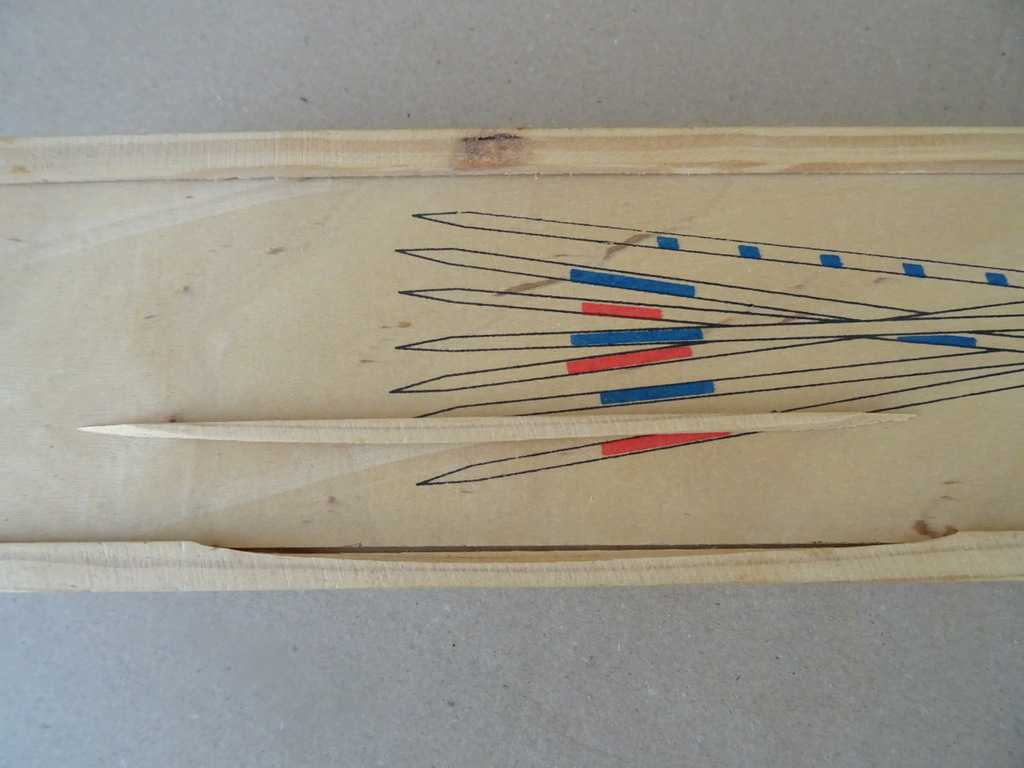 Groot Mikado spel 50cm Igra Toys in houten kist vervaardigd aan het eind van de vorige eeuw of het begin van deze eeuw. In een schitterende gebruikte staat en compleet met 41 stokjes. De kist mist een chipje aan de zijkant en er viel net nog een stukje af, zie foto’s.