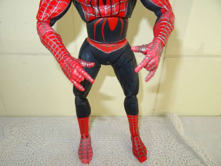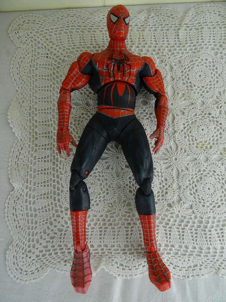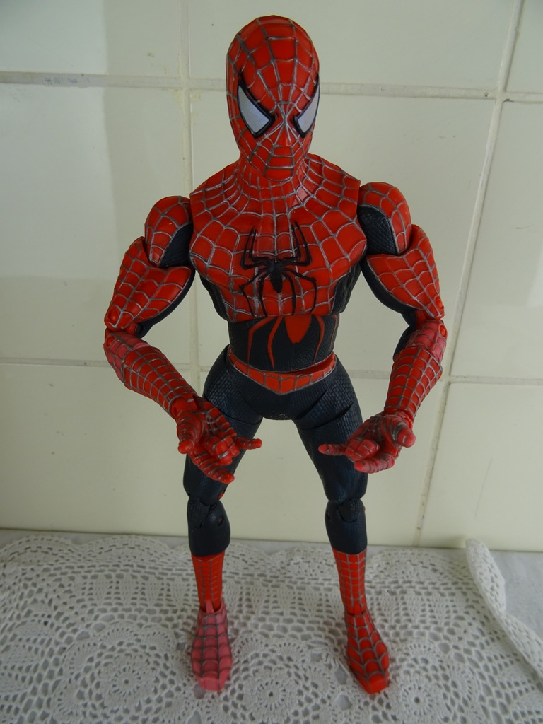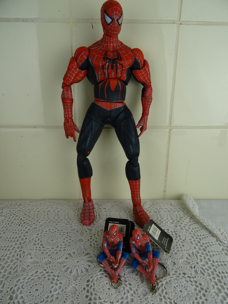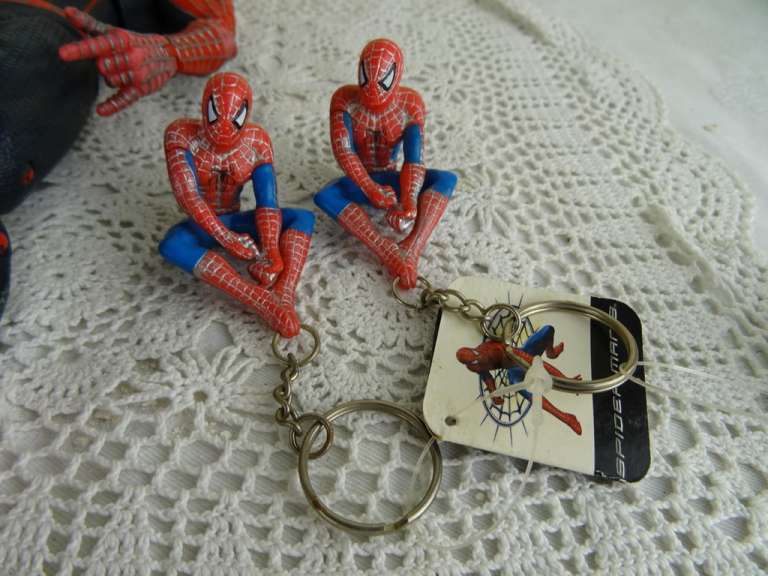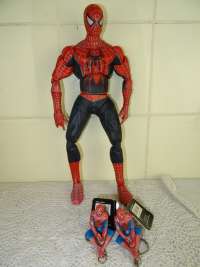 Marvel Spiderman actiefiguur uit 2004 en twee Spiderman sleutelhangers uit 2007. De actiefiguur (31 cm) is een collector’s item. Hij is gemaakt van zeer solide kunststof en heeft een volledig beweegbaar lichaam, zie foto’s. De pop kan ook worden neergezet als een beeld. Hij is in goede gebruikte staat, zie foto’s. De sleutelhangers (3.5 bij 6 bij 4 cm) zijn nieuw.